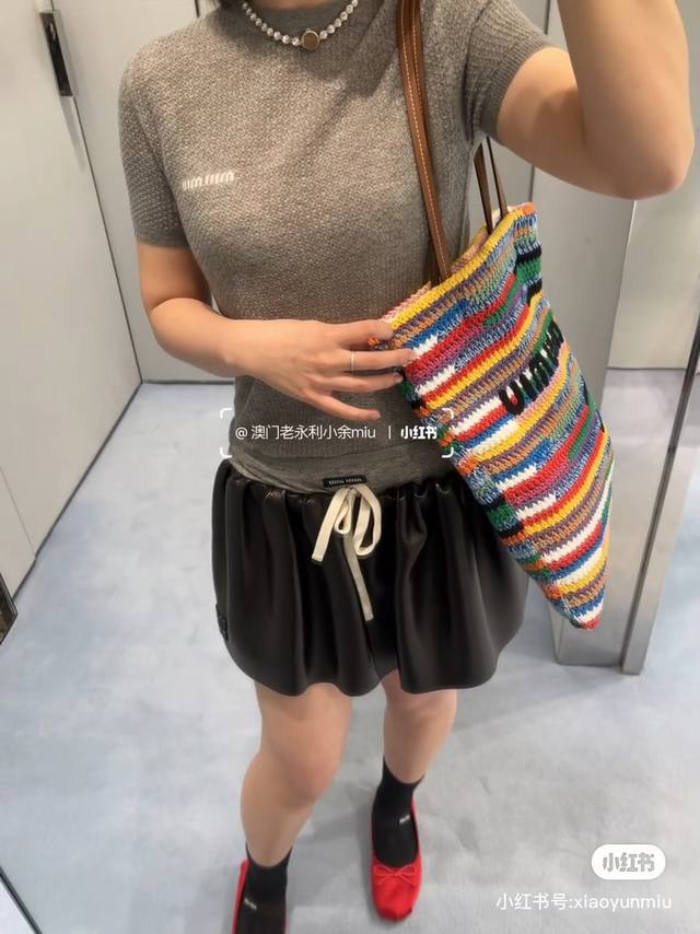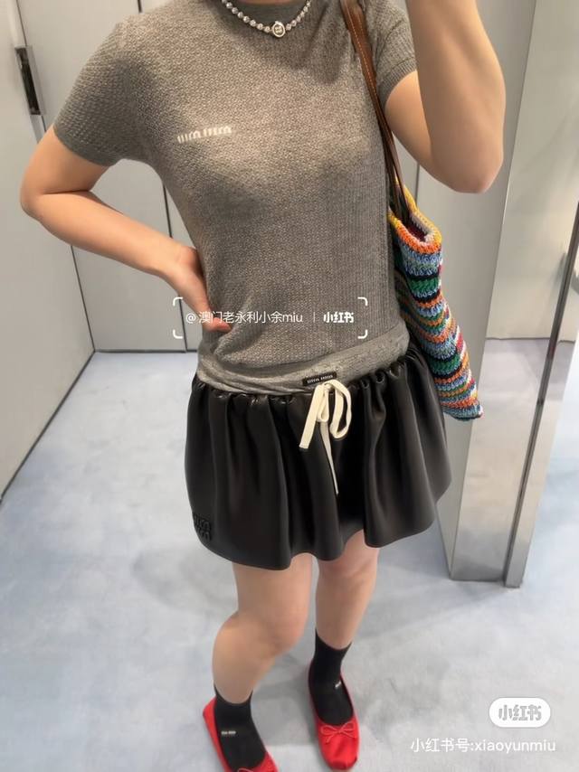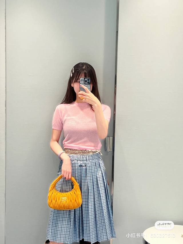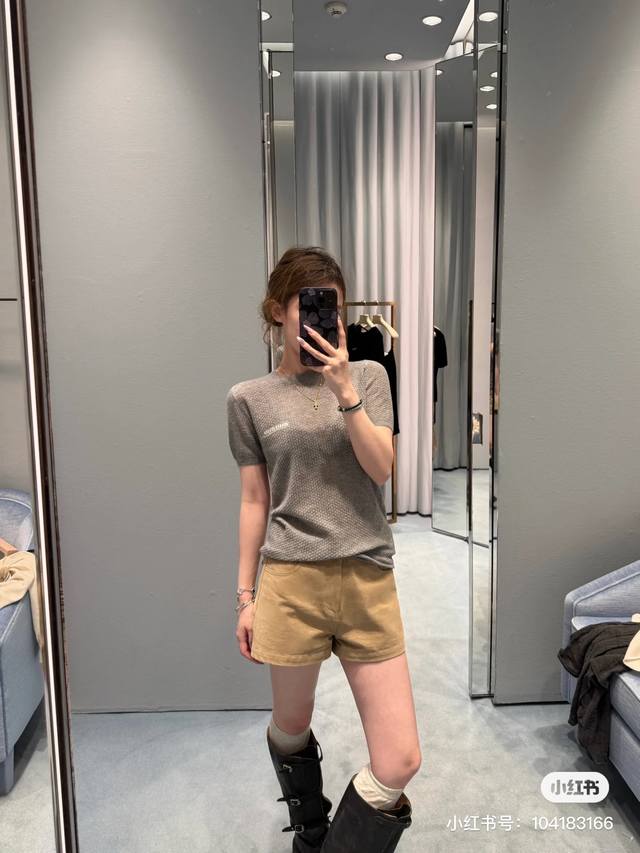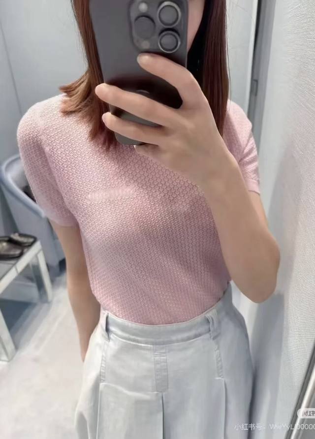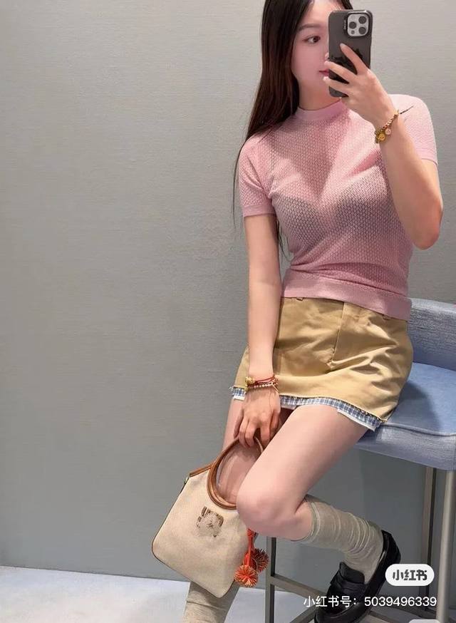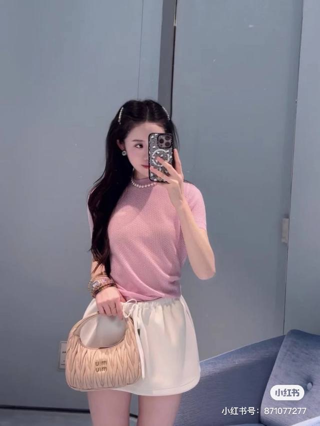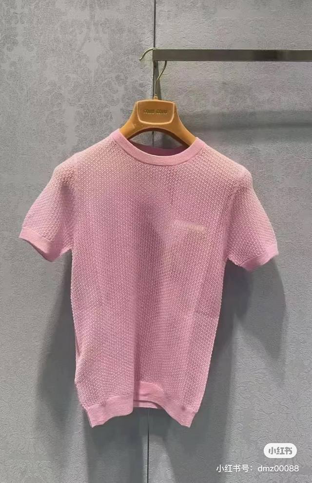 Style No. D25043043 Miumi*Miumi summer new style custom cool Tencel knitted fabric, jacquard elastic mesh hollow short-sleeved knitted sweater with letter logo on the chest P! Pink green gray white, M size: chest 86, sleeve length 23, length 57