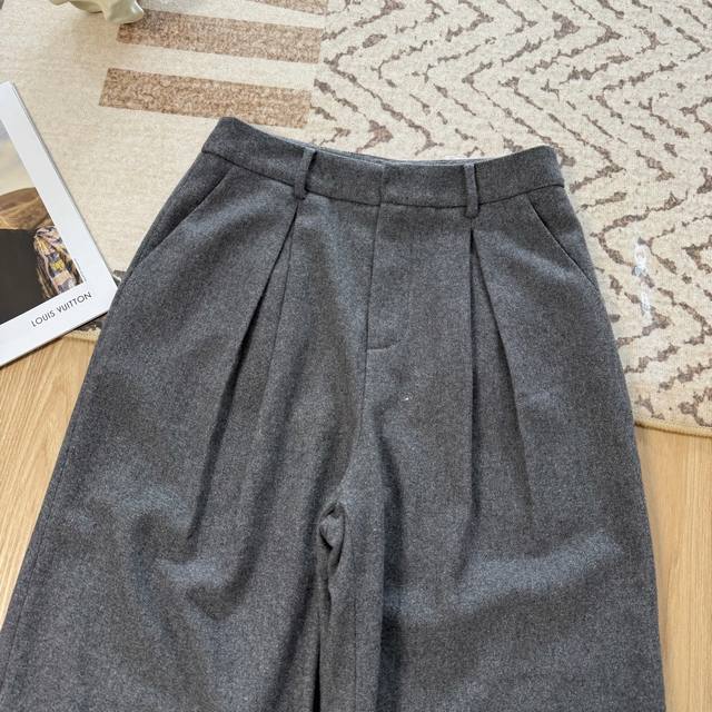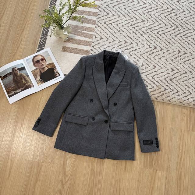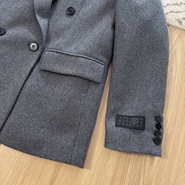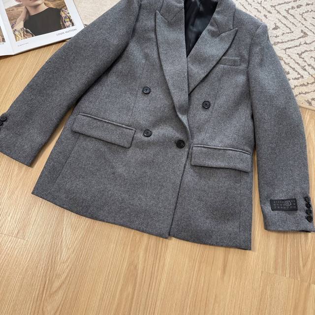 Stylish and Chic Mm6 2025 Autumn/Winter New Arrival Premium Gray Wool Suit Set. Features a tailored silhouette with a wide-leg trousers. A must-have for autumn and winter. The premium gray double-breasted suit features a stylish lapel design that exudes sophistication and a flattering silhouette. Made with custom-made wool blend fabric, the details are impeccable. Effortlessly create a street style look. Available in three sizes. (