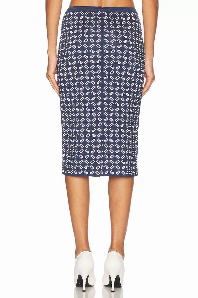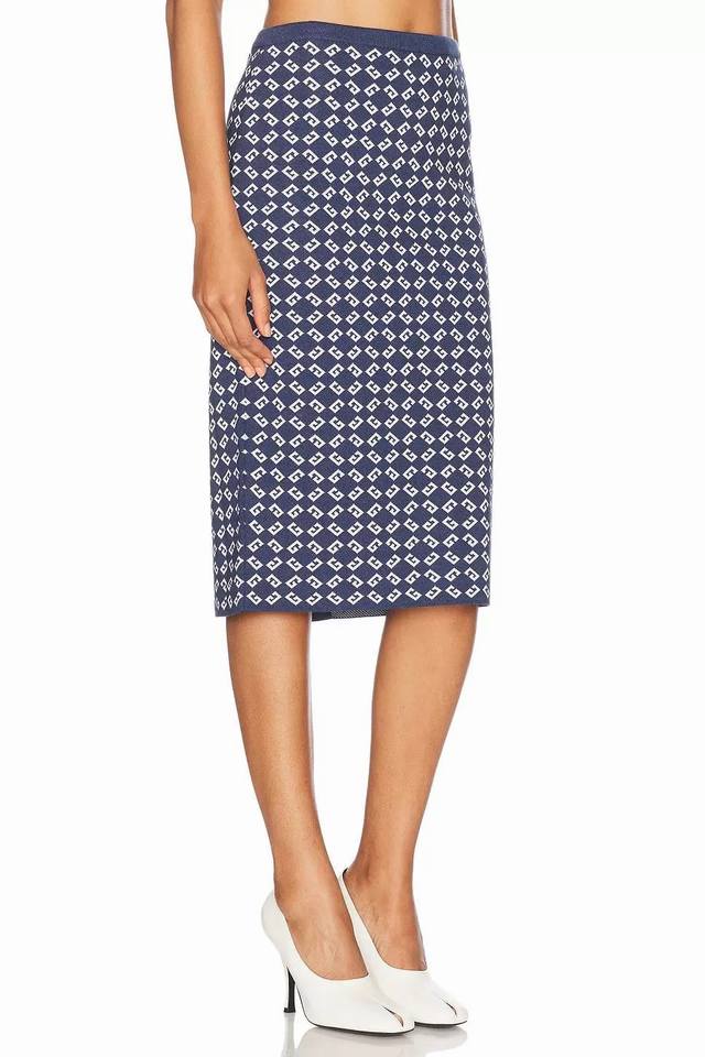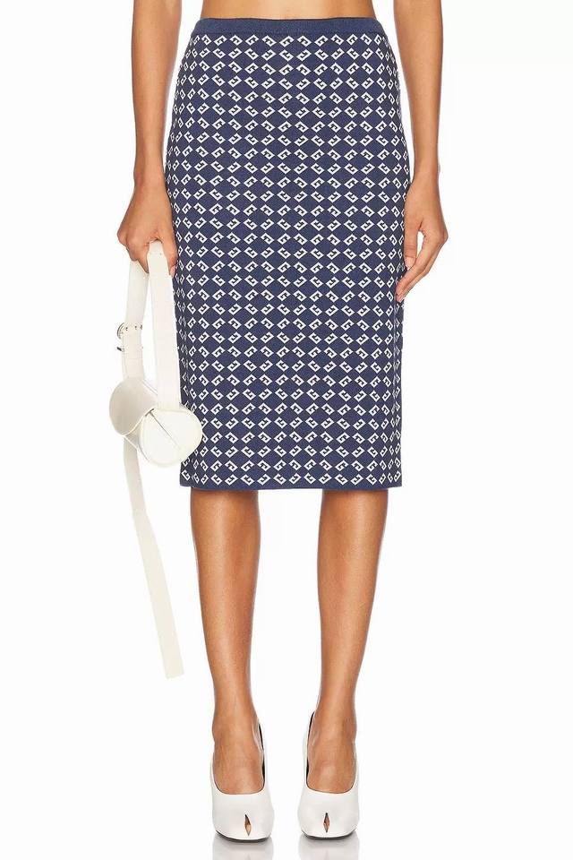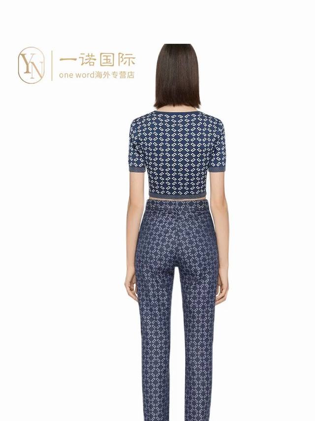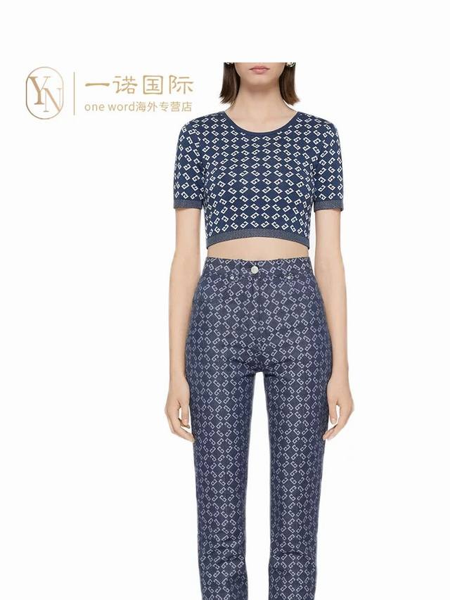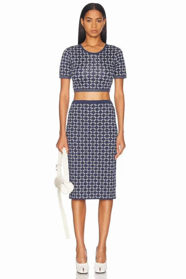 Suits, tops, and skirts from Givenchy*Y. This new, high-end, custom-made, all-over jacquard two-piece suit features a round neck, short sleeves, a cropped knit top, a high-waisted, hip-hugging midi skirt with a rear slit. Navy blue. Size M: Chest 84cm, Sleeve 25cm, Length 39cm; Waist 60cm (Stretch), Skirt 70cm (