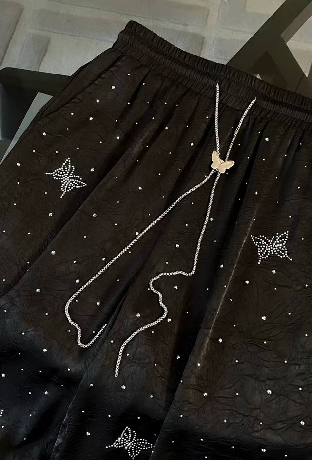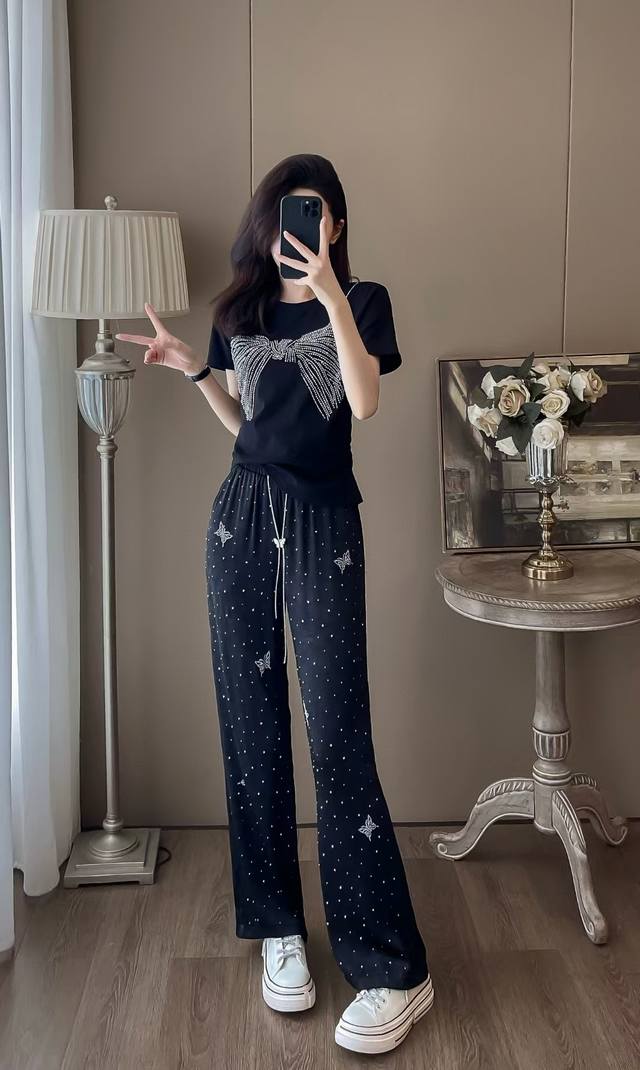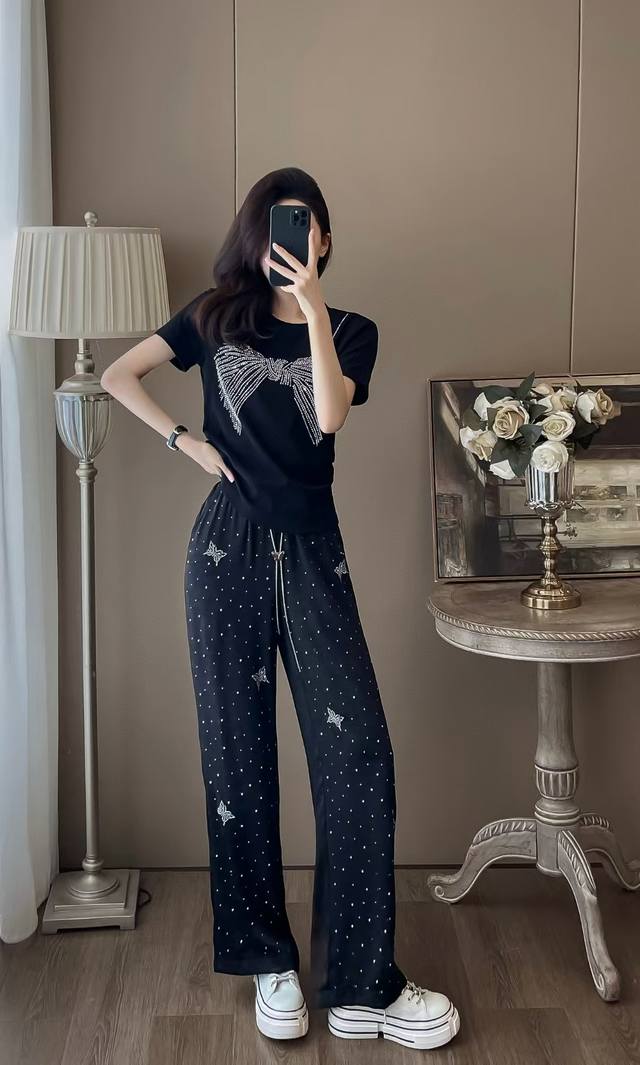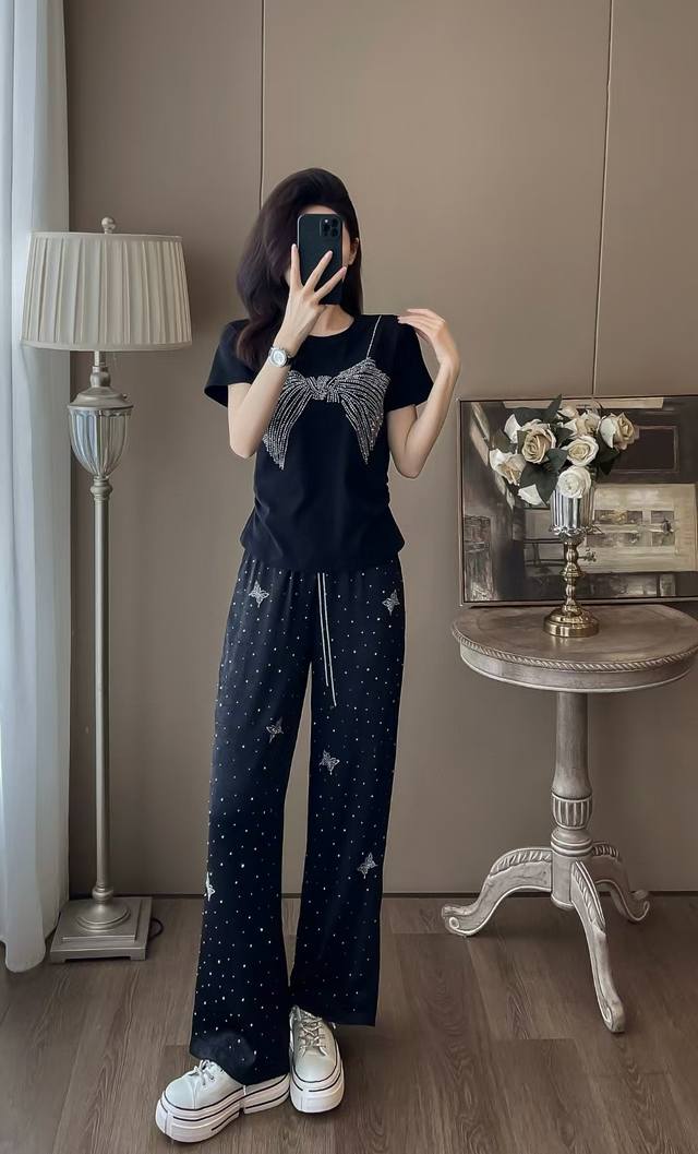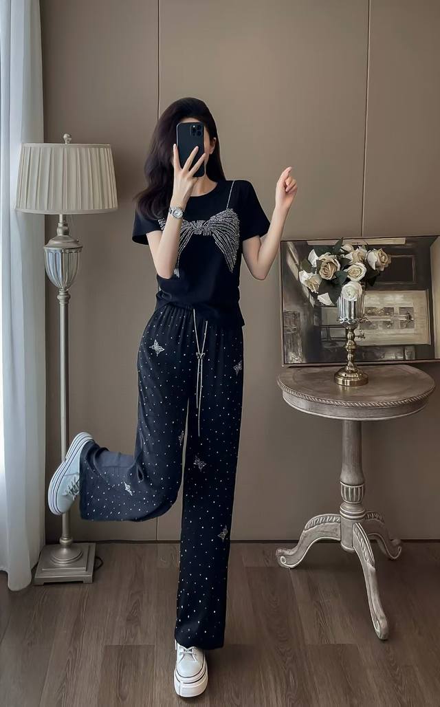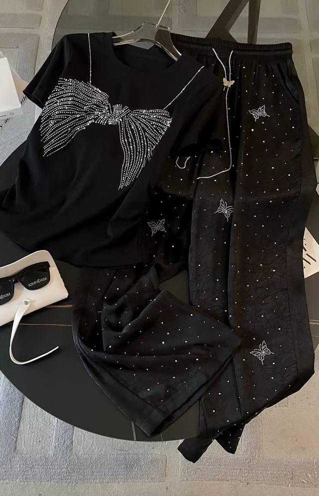 Summer butterfly rhinestone T-shirt and trousers set! Fabric: Satin polyester and spandex 84, 55, 60, 100. Small size data, in order: chest measurement, length, waist measurement, and trouser length