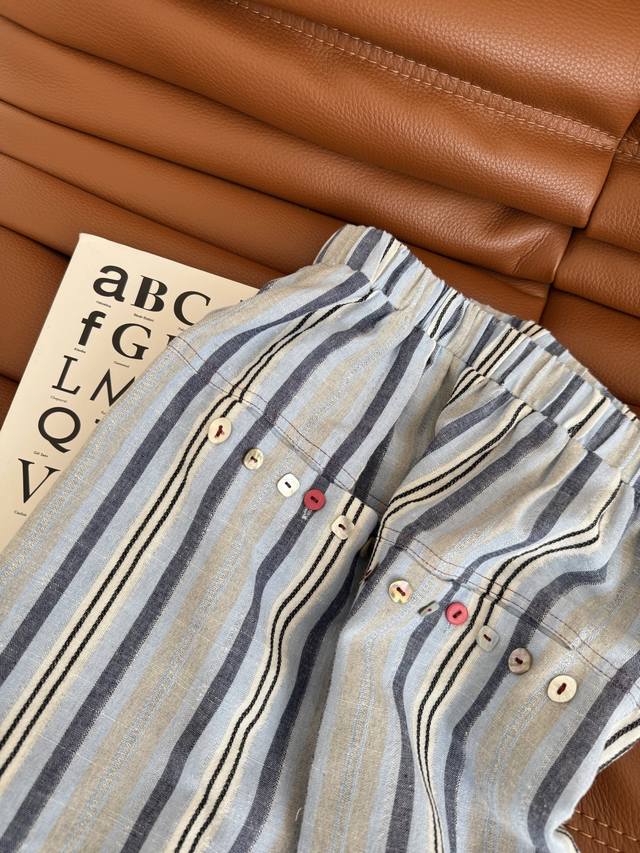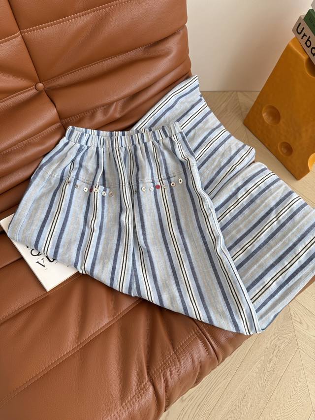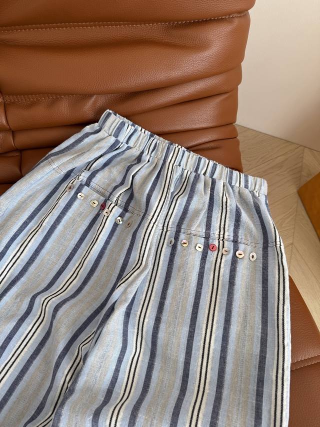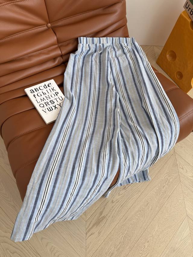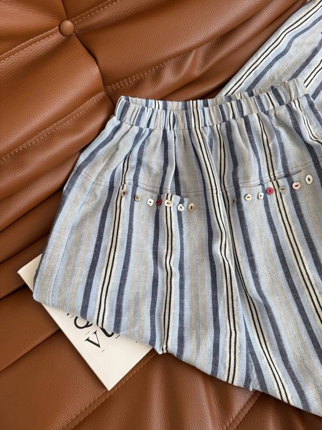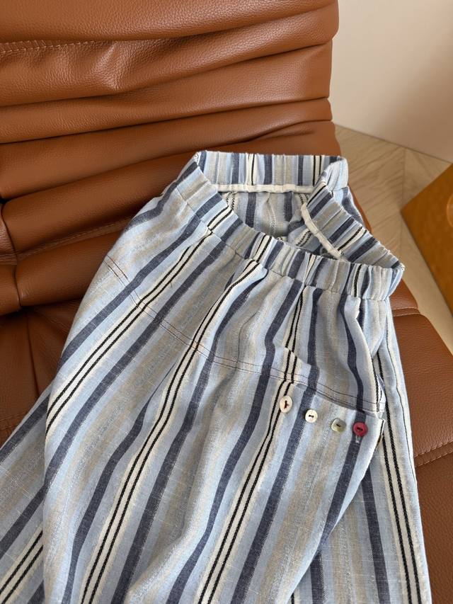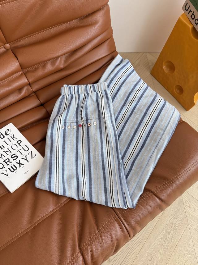 Summer lazy shell button decorated striped pants open the long leg code in one second. The combination of relaxation and fashion sense makes the whole person feel energetic when wearing it. The linen blended fabric is used. The wide-leg pants are very concealing. The shell button decoration on the pocket edge is very beautiful. One color, three sizes