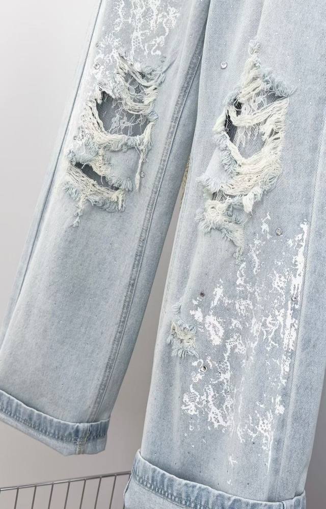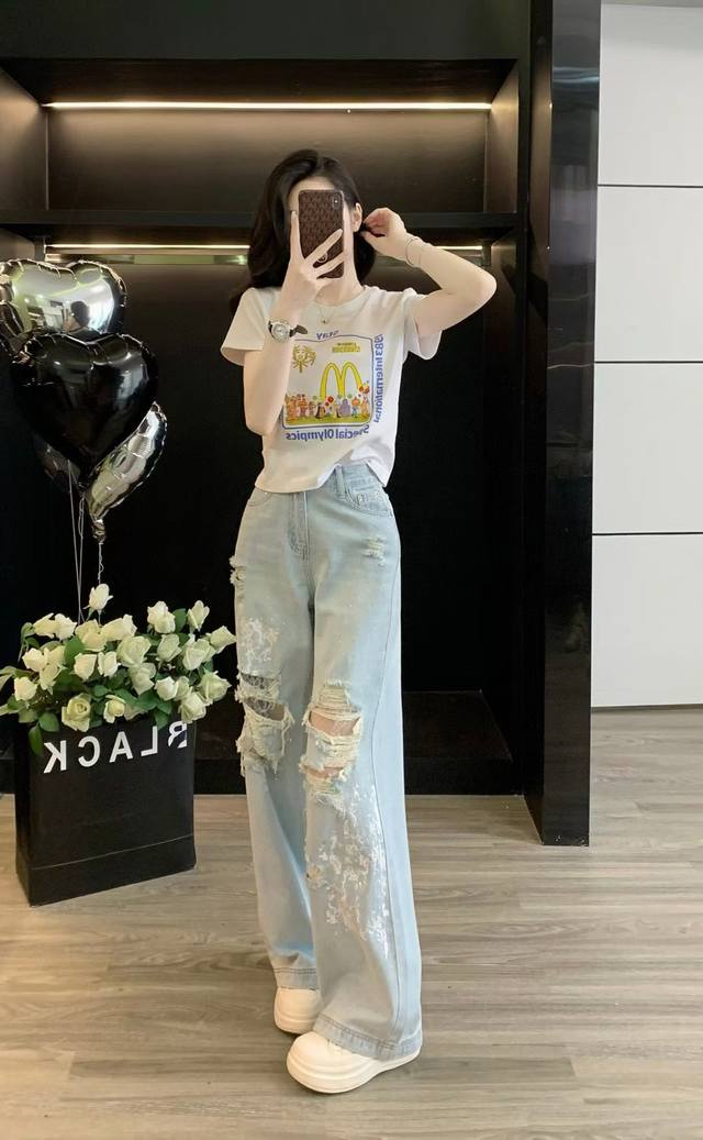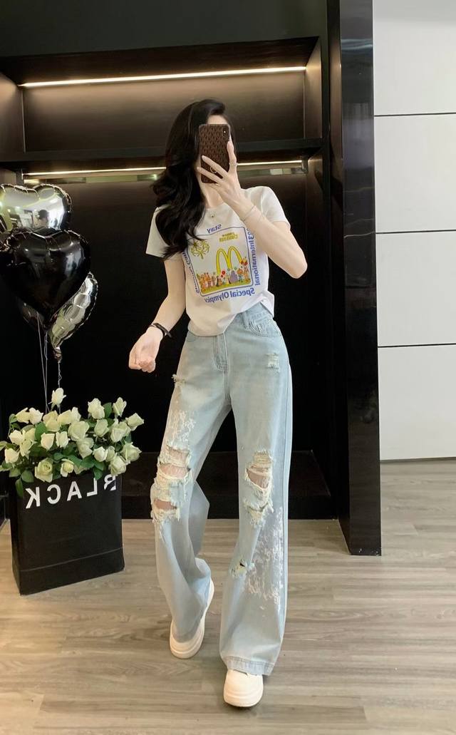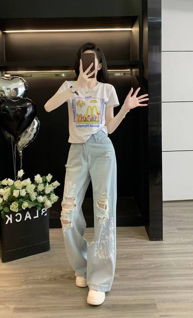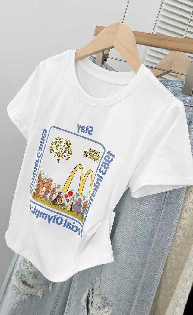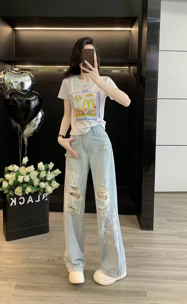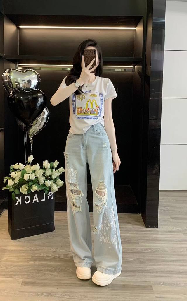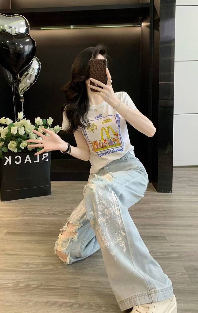 Summer printed T-shirt and denim pants set! Fabric: Cotton, polyester, spandex 84, 53, 64, 102. Small size data: chest, length, waist, and pants length 117437