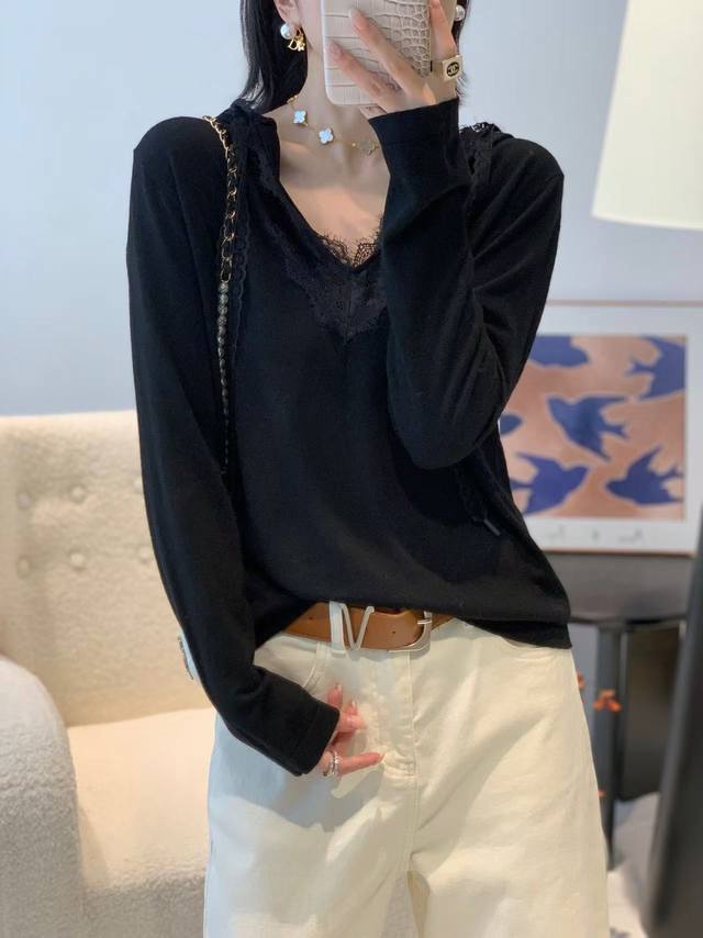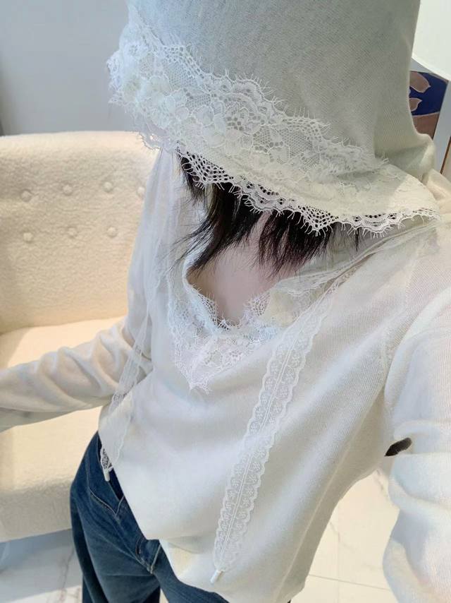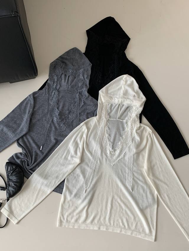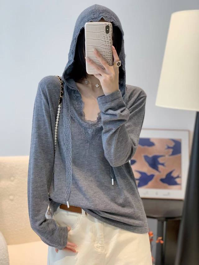 Super good-looking and stylish solid color lace stitching hooded sweater high-end sense all-match slim wool top one size ultra-fine wool