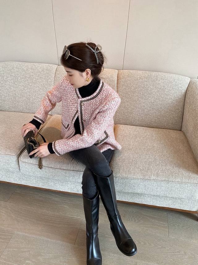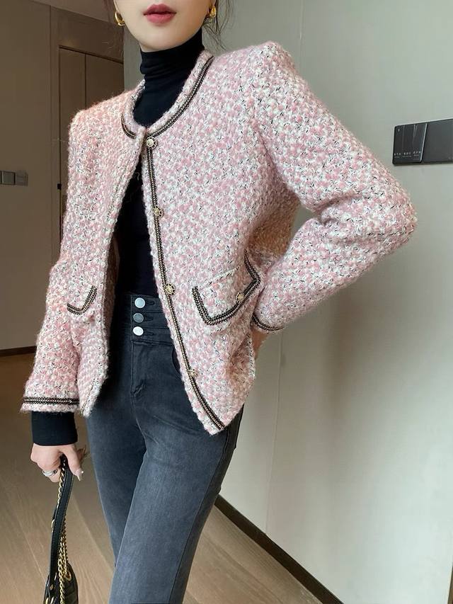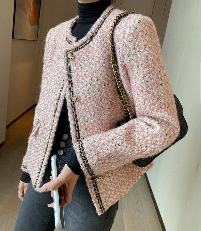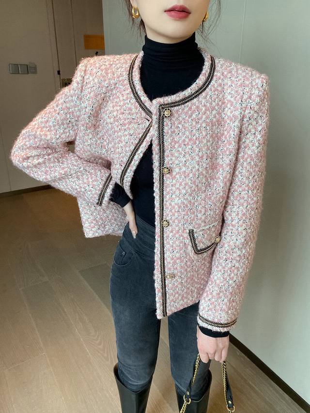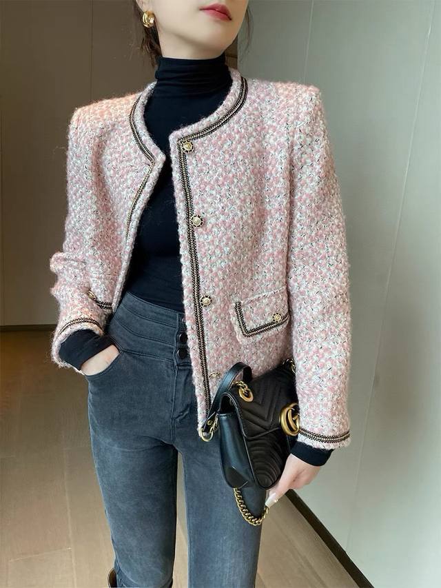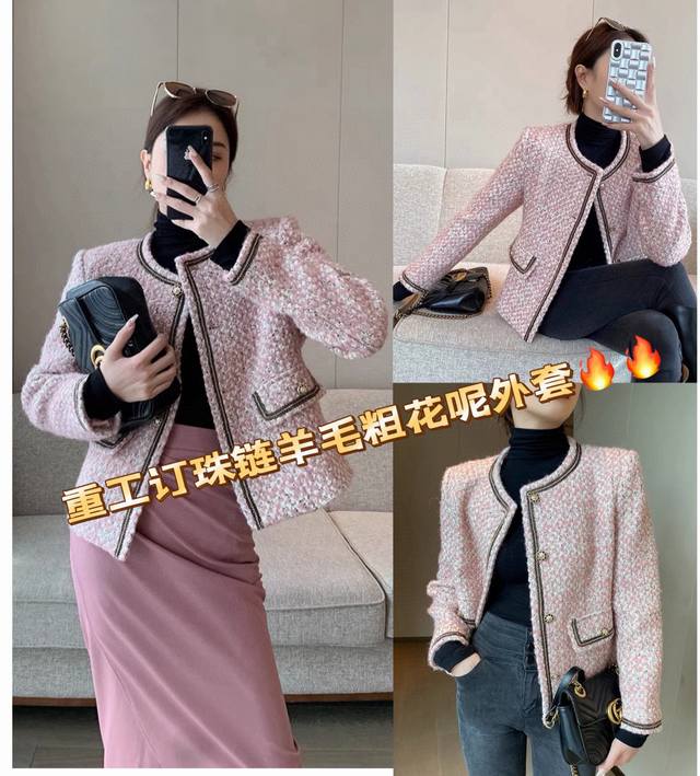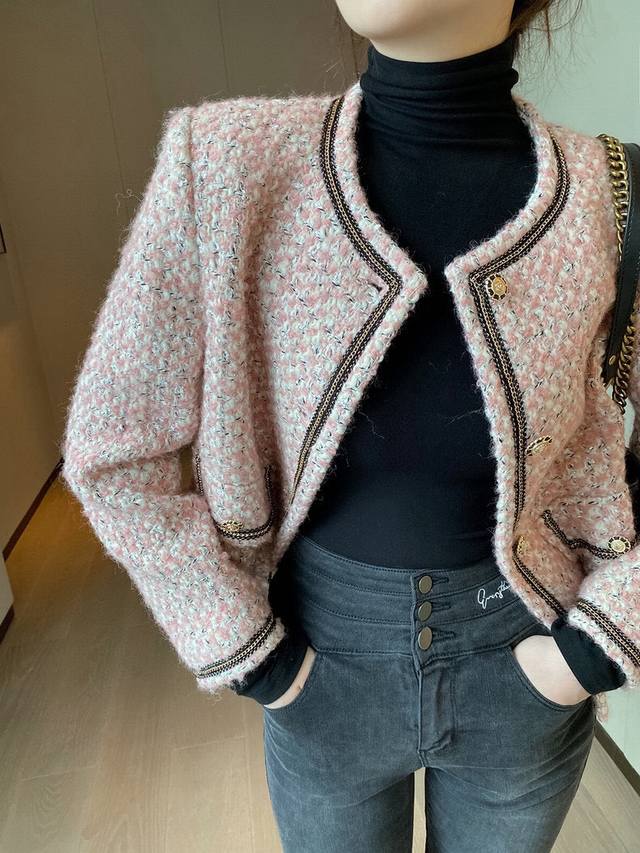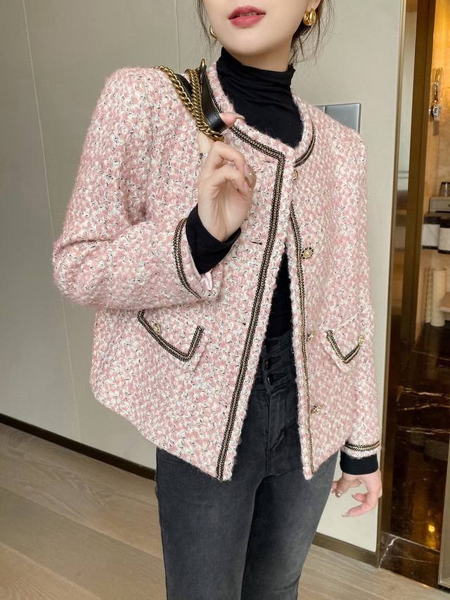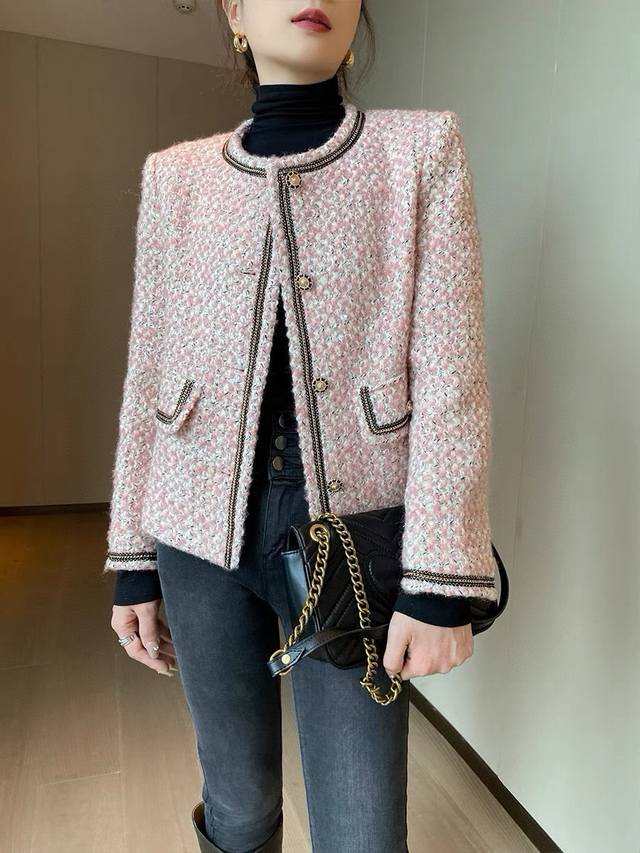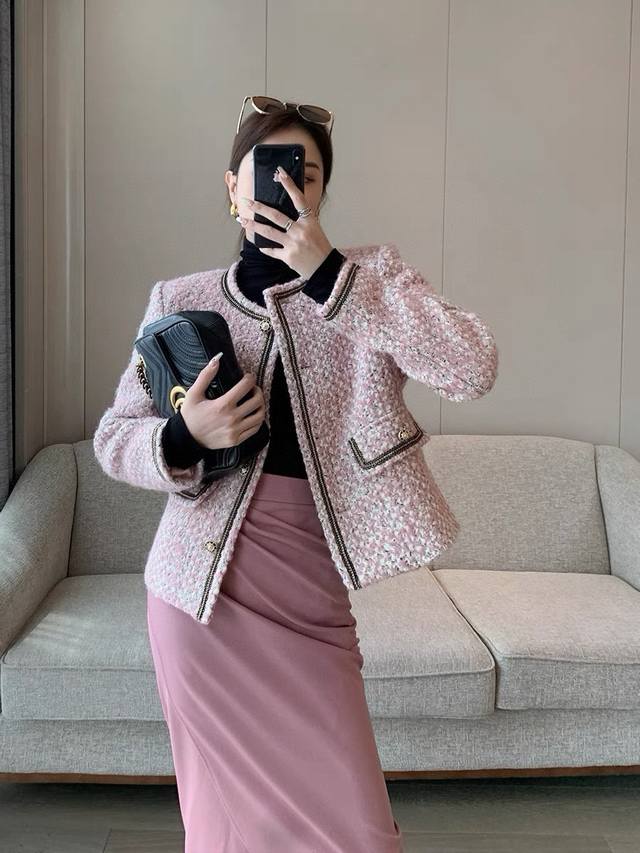 Super popular high-end Chanel style series! Original custom-made heavy-worked colored satin silver wool tweed, collar placket, sleeves and pockets with heavy-worked beaded stitching, super white short boxy design without being too short, it is simply stunning and a classic that can't be taken away by fashion! Smlxl
