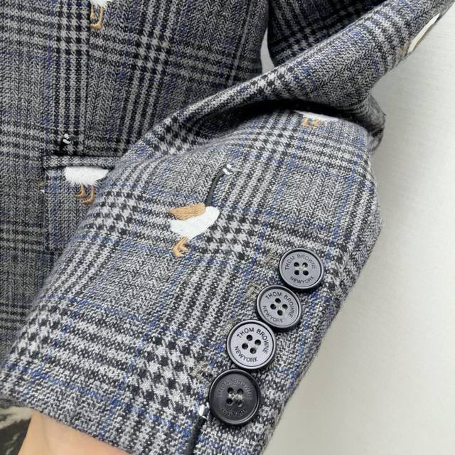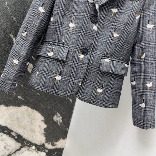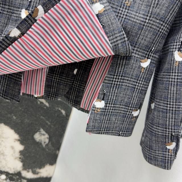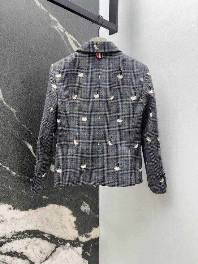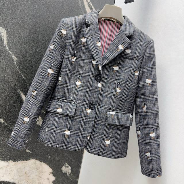 Tb 25Ss Autumn/Winter New Arrival British Preppy Style Series Goose Embroidery Plaid Casual Blazer. Signature striped lining, three-dimensional tailoring, short cut, flattering on all body types, stylish and chic. Single-breasted, versatile and suitable for both sweet and edgy looks. Made with imported wool, the fabric has a superb texture and a retro, vintage feel. A classic casual commuter piece. Sizes S, M, and L. S: Bust 90cm, Length 56cm. (Note: The last part, "DDD," is a product description and doesn't need a direct translation.)
