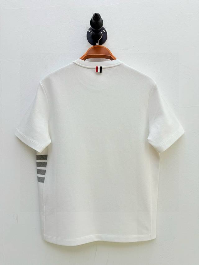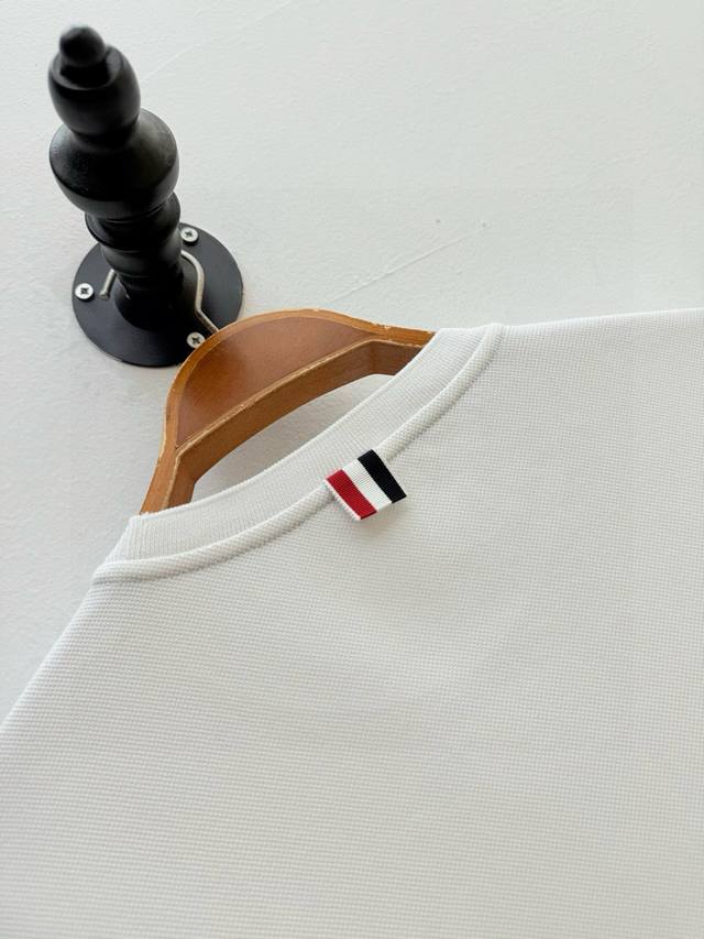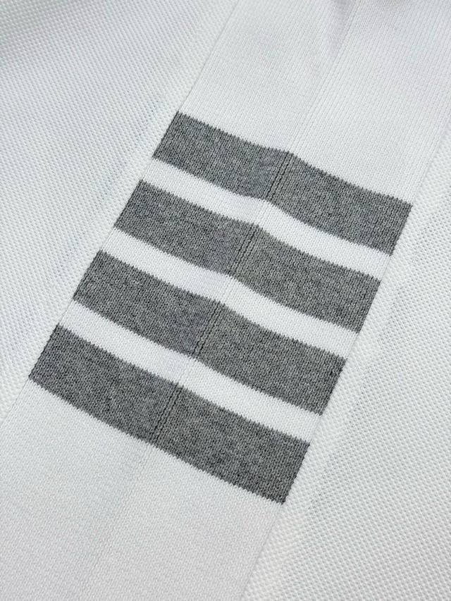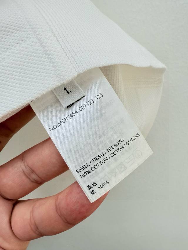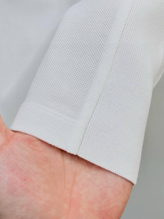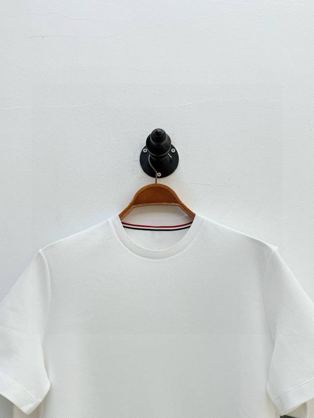 Spring/Summer collection. The red, white, and black webbing at the neckline and back of the neck, along with the four side stripes, continues the brand's signature "color-blocking" concept, reinforcing the brand identity through clean lines and contrasting colors. The front and back panels are made of pique cotton, with a unique embossed texture that adds a three-dimensional effect. The connecting panels on both sides are made of knitted cotton, creating a subtle visual balance between softness and crispness. The fabric is made from long-staple Xinjiang cotton. Combing removes short fibers to ensure uniform fiber length. The fabric is then distributed through two different weaving techniques on the front and back panels and the side panels. The piqu