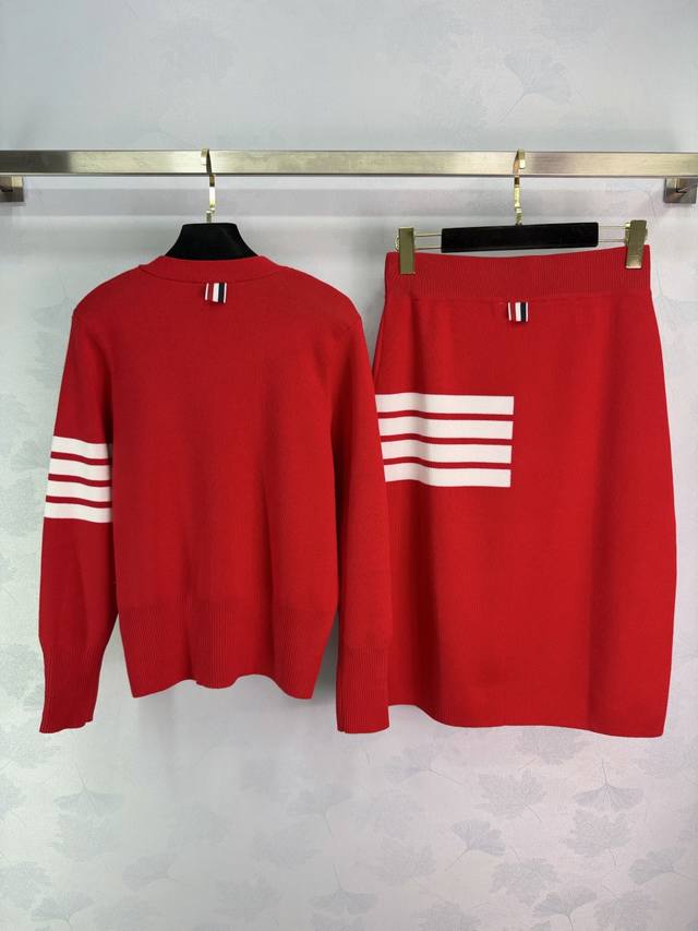 Tb*26 Early Spring New Classic Knitwear Set, includes a V-neck cardigan (Ddd) and a high-waisted skirt. Made of 100% wool, it's soft, skin-friendly, and incredibly comfortable. Features the iconic four-stripe design on the cardigan cuffs and the side of the skirt, making it highly recognizable. Available in 2 colors and 3 sizes (S, M, L). T226B. DDD