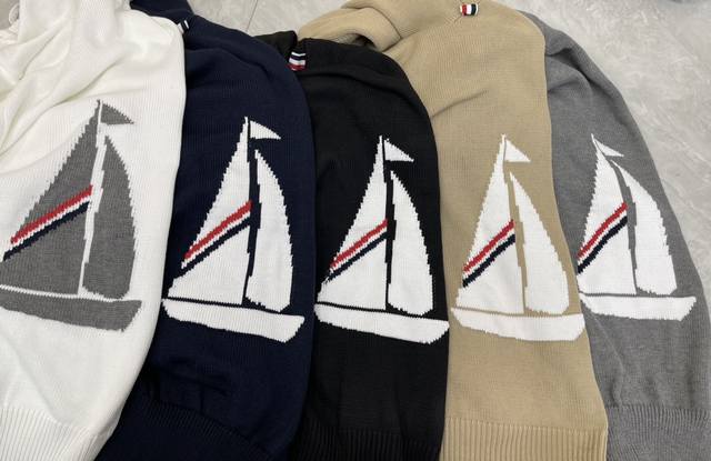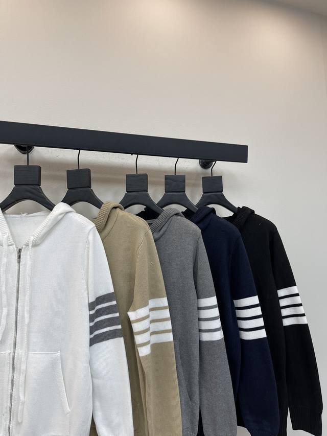 Tb*New sailboat pattern wool blend sweater with four stripes. Hooded zip-up knitted cardigan with sailboat pattern on the back. Classic four-bar style, a classic style worn year-round. Made of soft and comfortable wool blend. Knitted with four stripes and double sleeve badges. Fitted for a slim or loose fit. Comfortable and breathable. Unisex style. Colors: white, khaki, gray, navy, and black. Sizes: 1, 2, 3, 4, Aa.