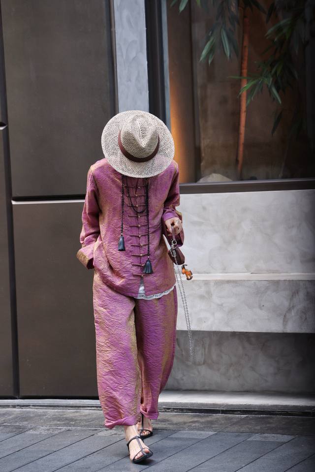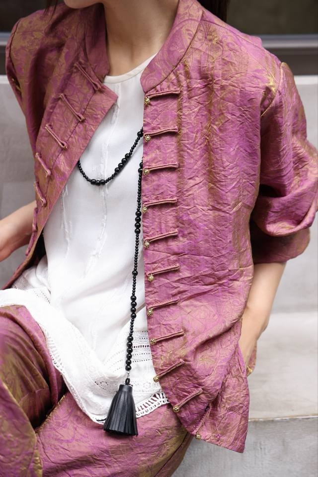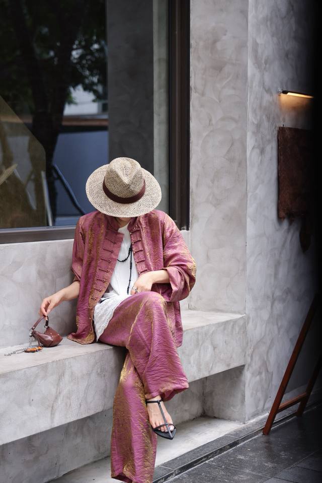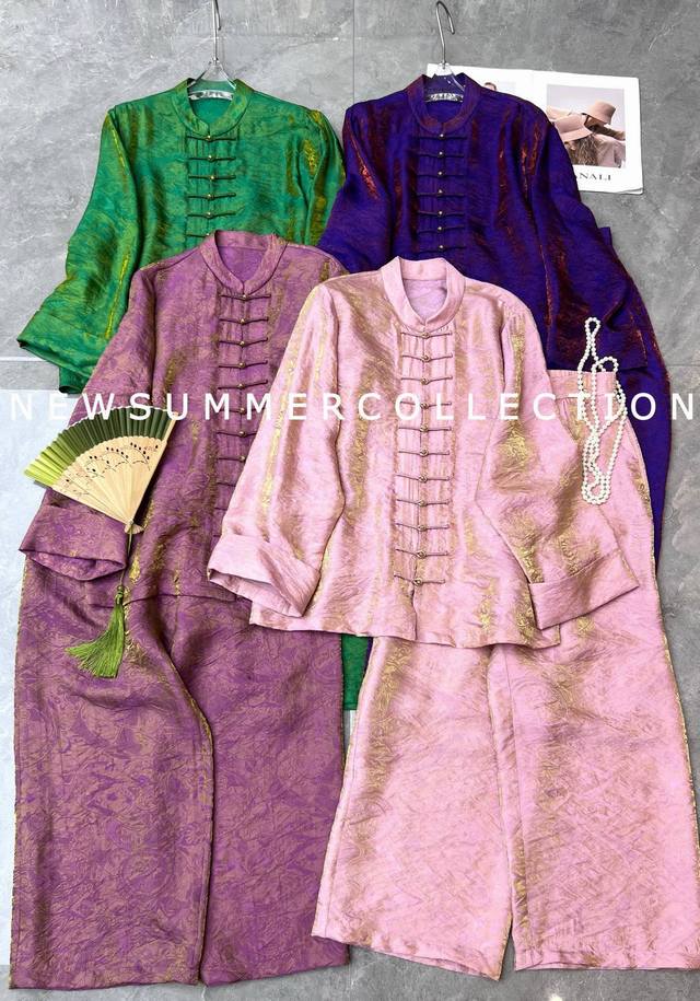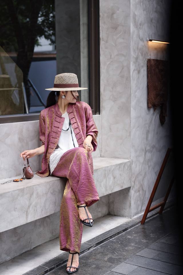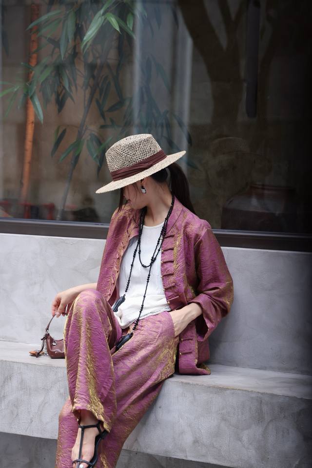 The high-end and elegant satin buttoned new Chinese suit is finished with a touch of calm and profound new Chinese green, which combines the elegance of traditional Chinese style with the simplicity of modern style. The handmade buttoned button with a sense of design and color is like the punctuation of the title page of an ancient book. It is implicit and has a unique style. The soft and friendly peach pink has a faint sense of alienation and is full of fantasy. It is not picky about skin color and is visually cool. It makes the skin look whiter. The rich gilded purple retains the noble and mysterious artistic conception and also reflects the oriental aesthetics and rich poetry. Smlxl