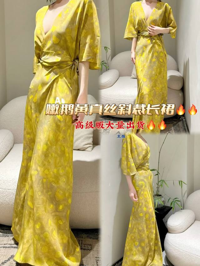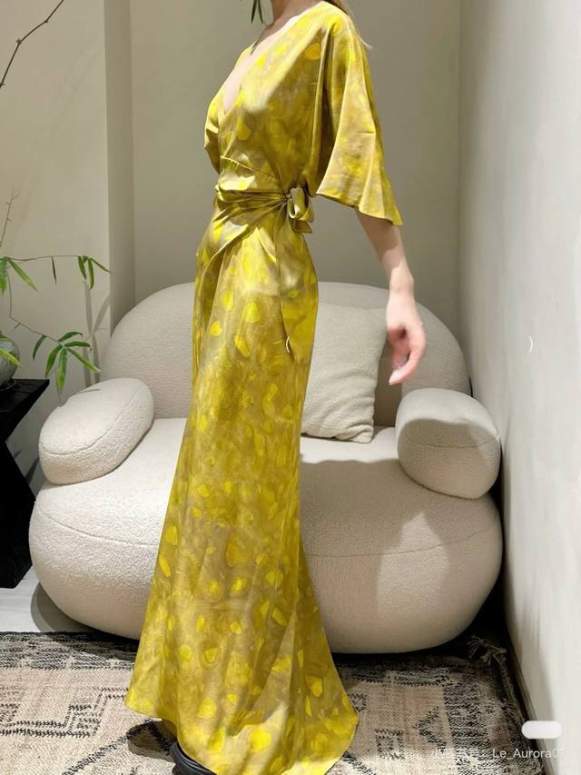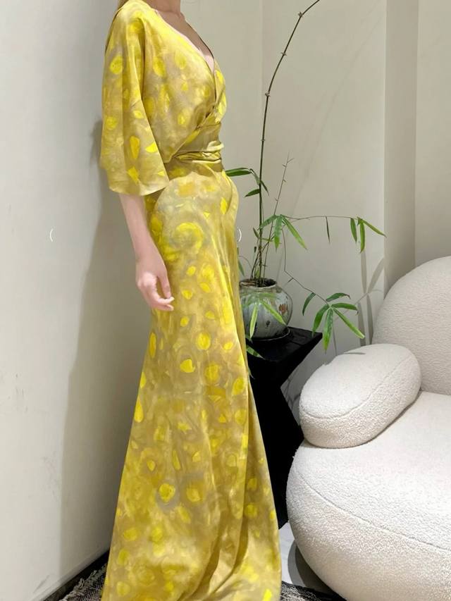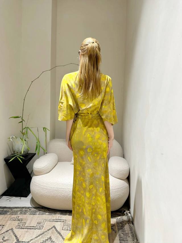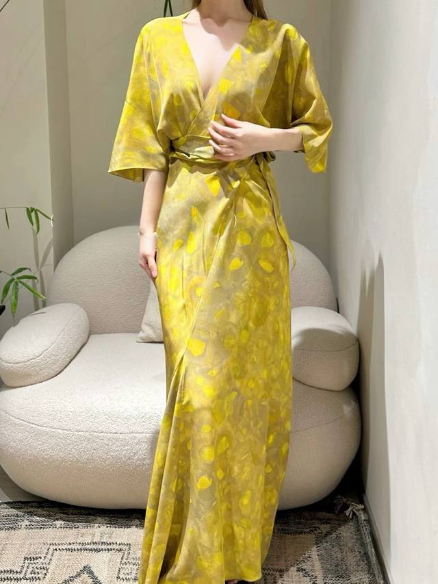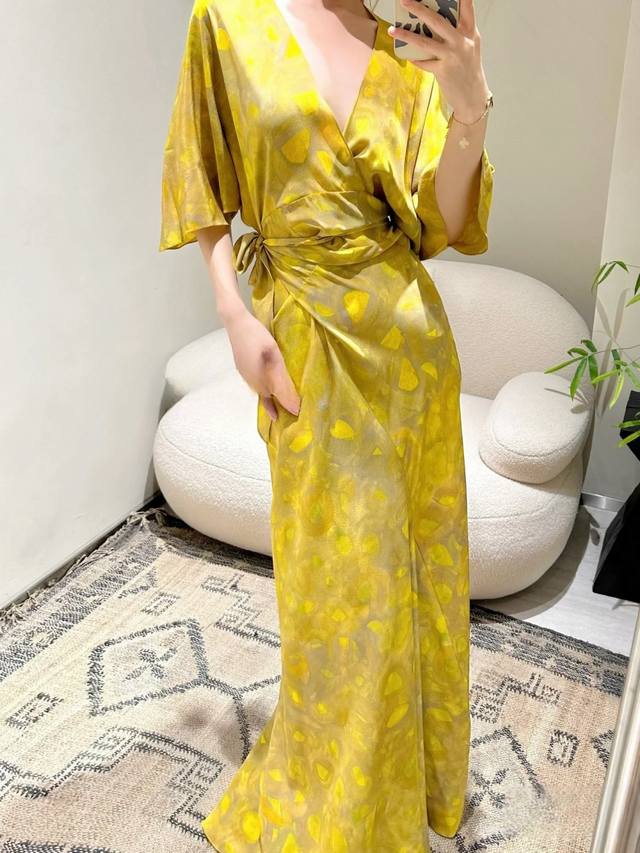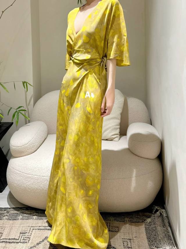 The hot item is a lemon yellow silk tea dress from the Spanish niche Fairy brand. This sand-washed silk wrap-around sleeveless maxi dress features flared sleeves and a unique wrap-around design on the lower body. The skirt can be easily adjusted with a tie. The silk ink-and-wash print is fresh and romantic lemon yellow, and the silk has a lustrous sheen. Smlxl