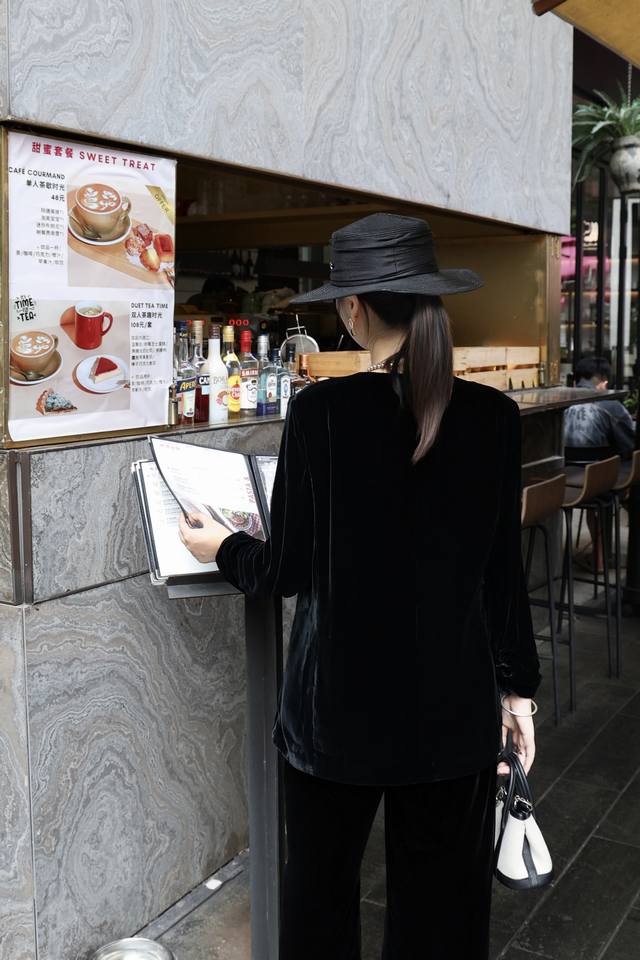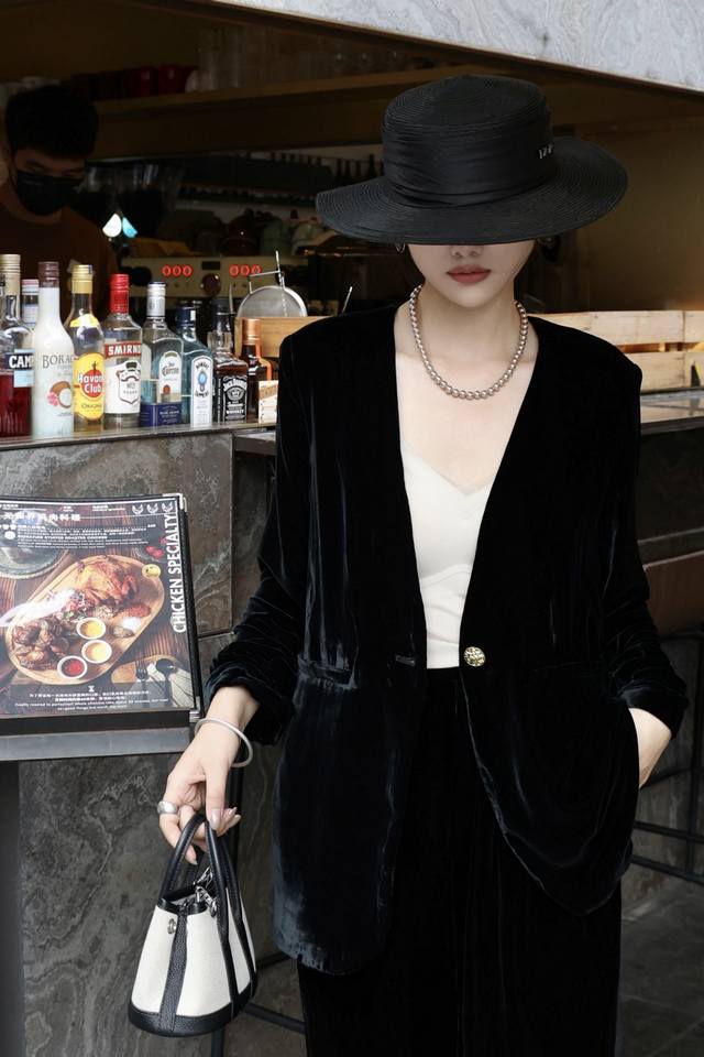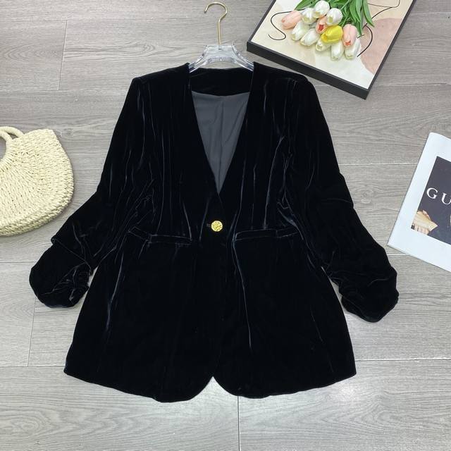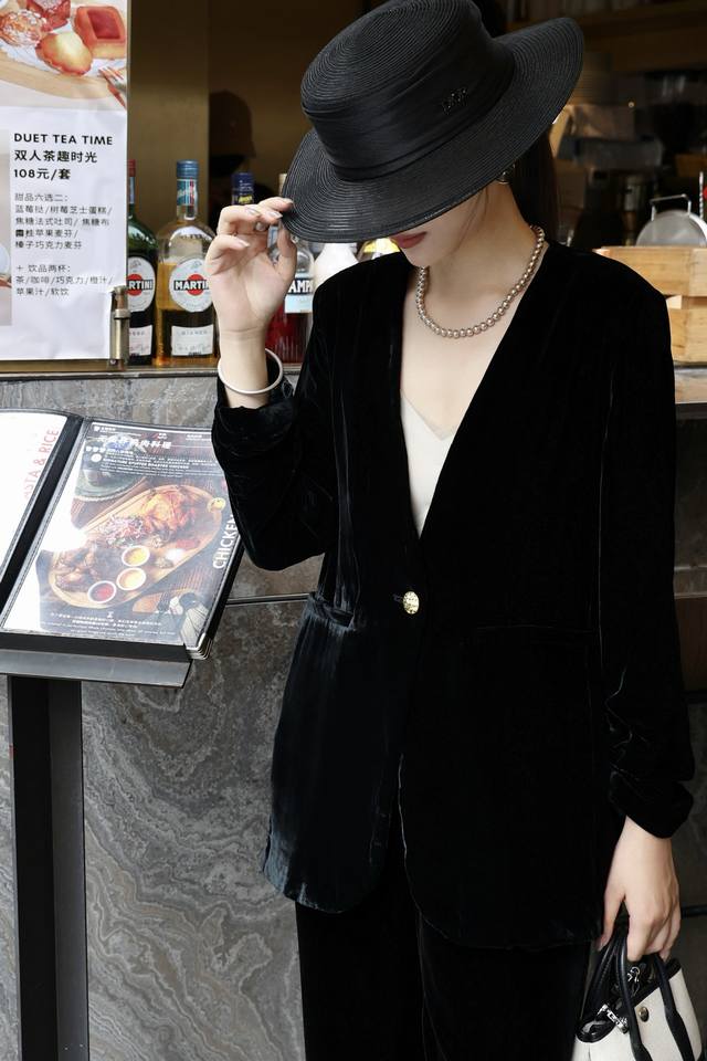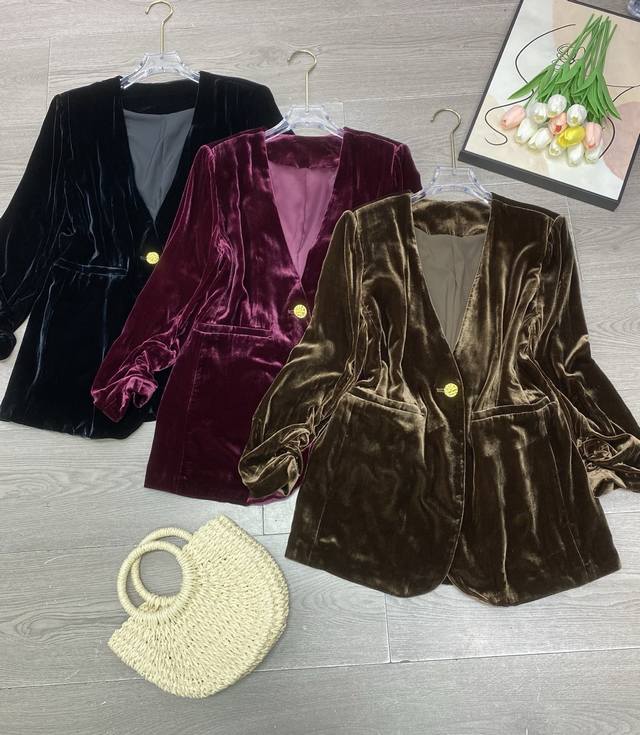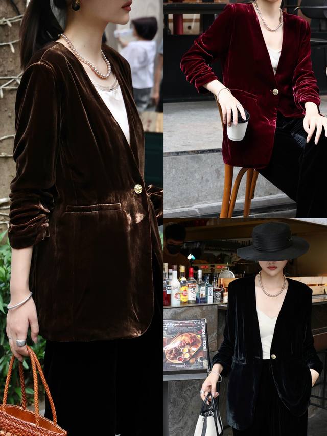 The hot-selling metal button silk velvet suit is back in stock. Early autumn female boss aura style elegant silk velvet retro minimalist V-neck padded shoulder H-shaped suit jacket. Color: black apricot, coffee, ankora red. Size: S to Xxl.