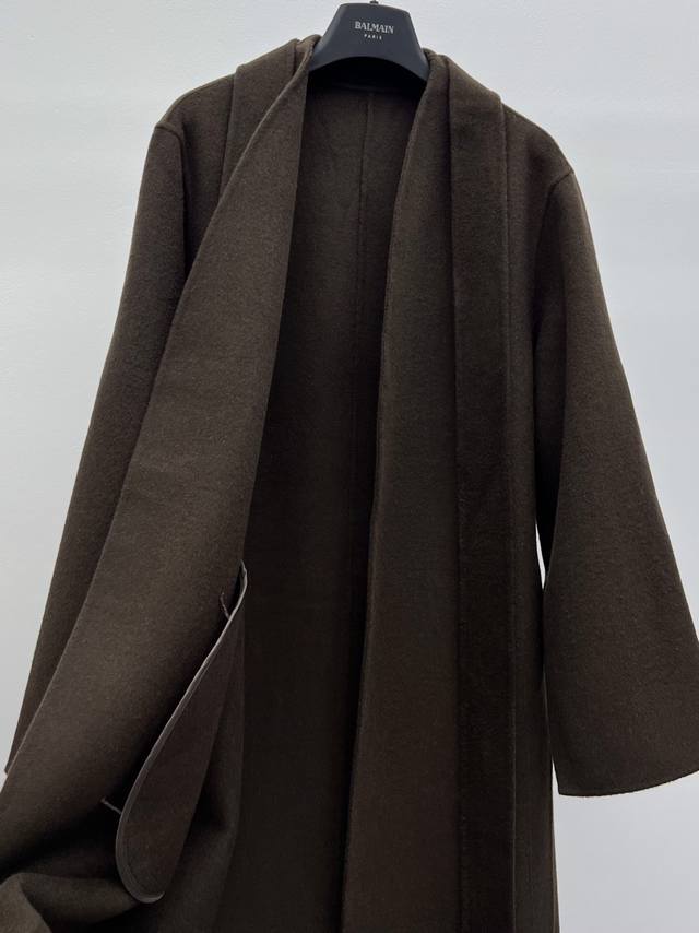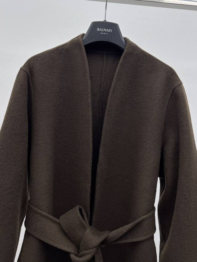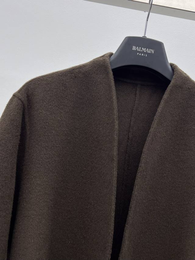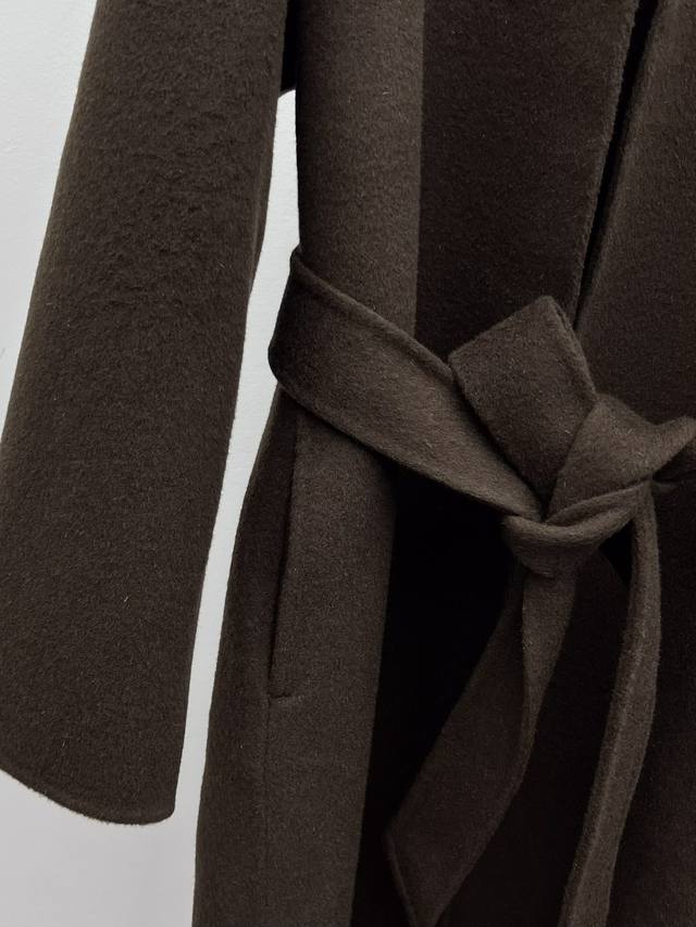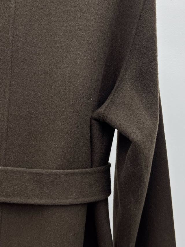 The Ro* Double-faced Wool Coat DDD Made from select high-count, fine wool fabric DDD Simple V-neck opening accentuates the neckline and offers excellent versatility DDD Dropped shoulders paired with unique wide sleeves balance a relaxed yet sophisticated look DDD Self-fabric belt cinches the waist for a versatile silhouette DDD Long, soft, and warm garment that gently wraps around the entire body DDD Sizes Sml DDD