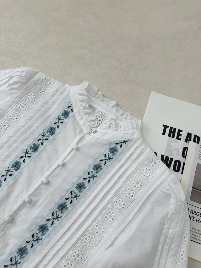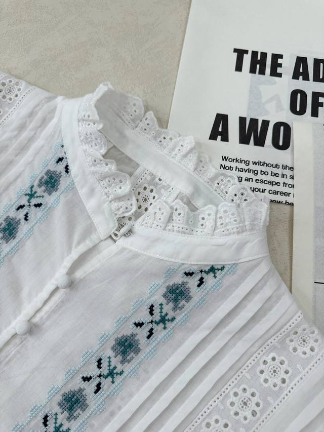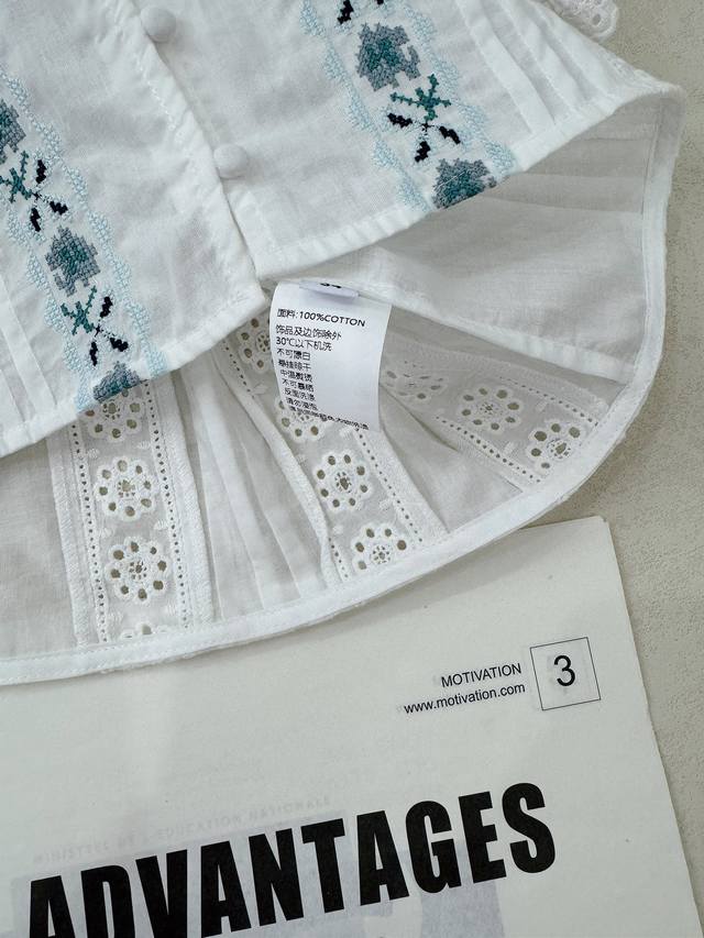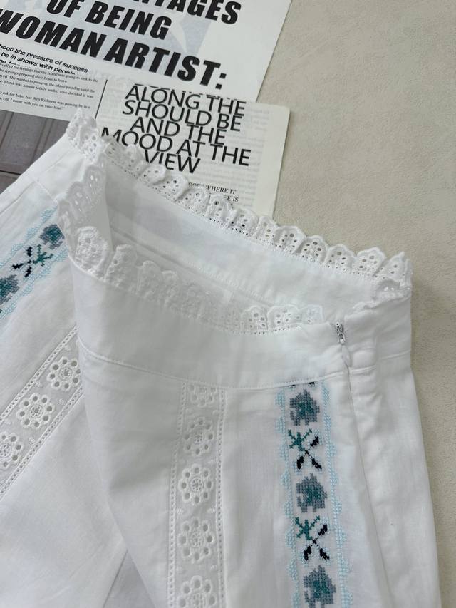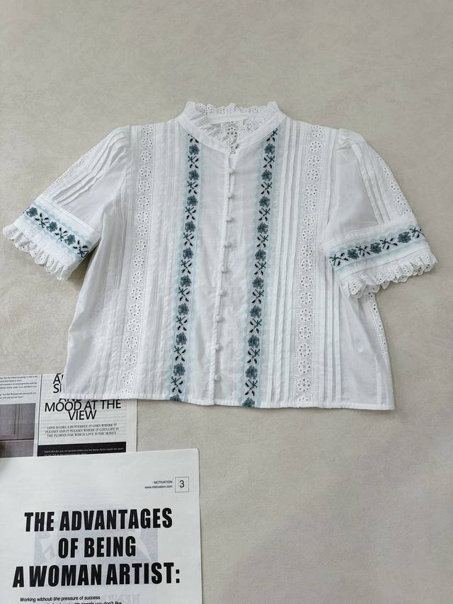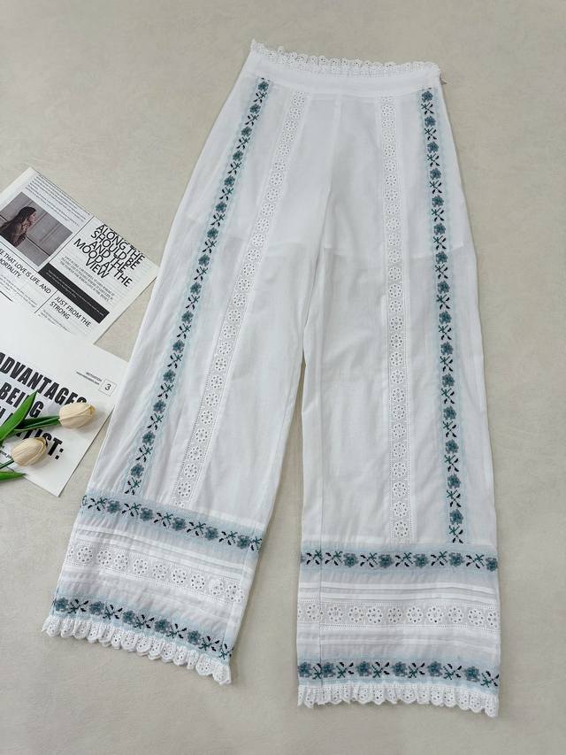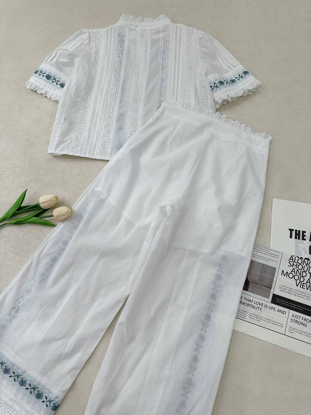 Sez. A blue and white lace short-sleeved shirt paired with color-block lace straight-leg cropped pants. The aqua blue embroidered floral lace and white accents are both refreshing and beautiful, and the overall details are meticulously crafted. 34, 36, 38 shirts and pants