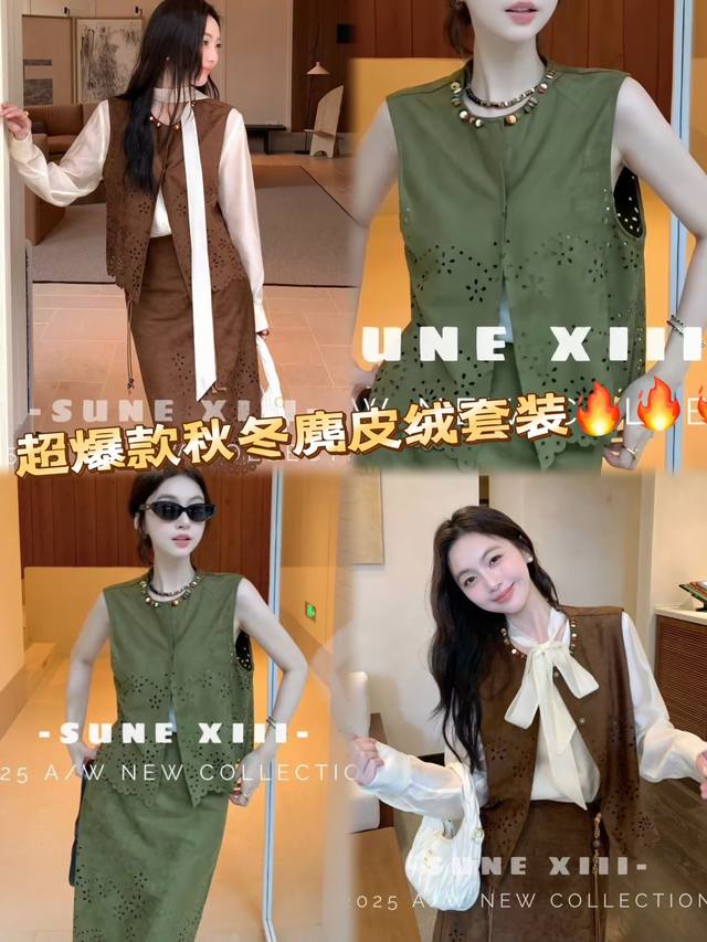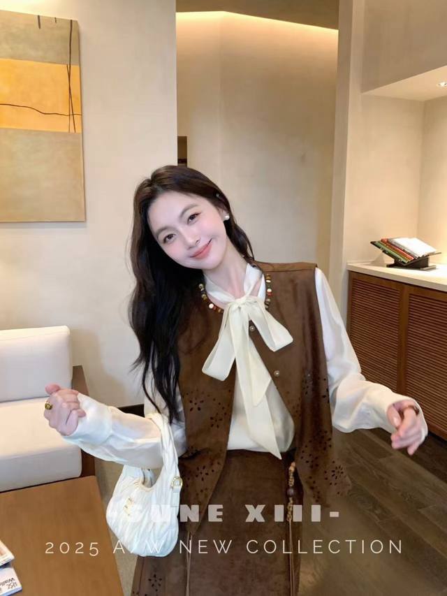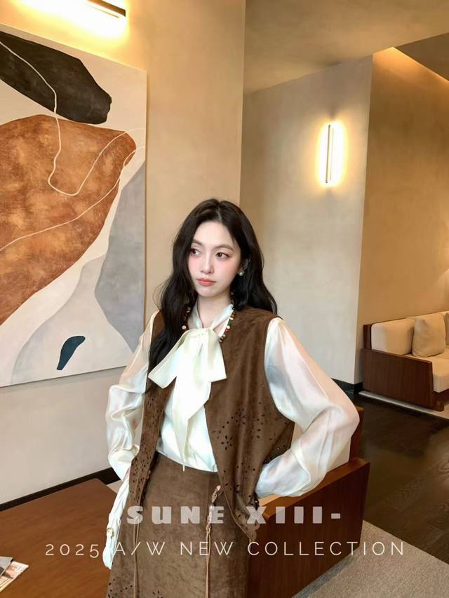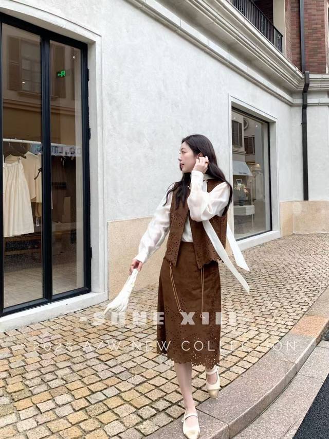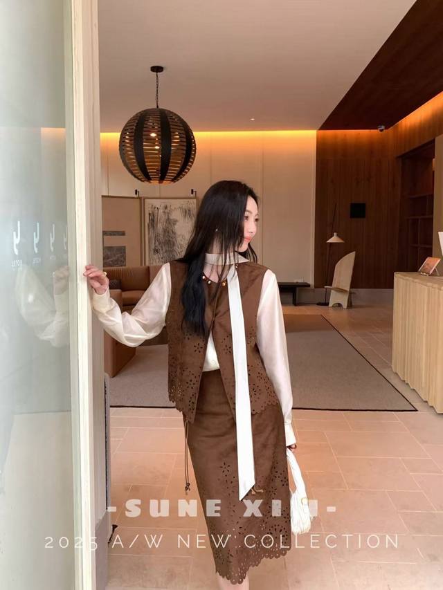 This celebrity-themed piece features a super-complex laser-cut pattern on this year's hottest suede fabric. This exquisite piece comes with a complimentary woven belt. This elegant and uplifting set features a chaebol daughter, conveying both gentleness and strength. Available in two colors and four sizes: S, M, L, X, L, D, D, D