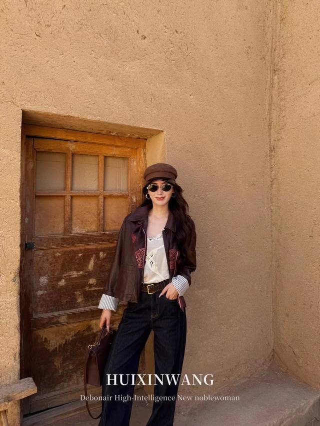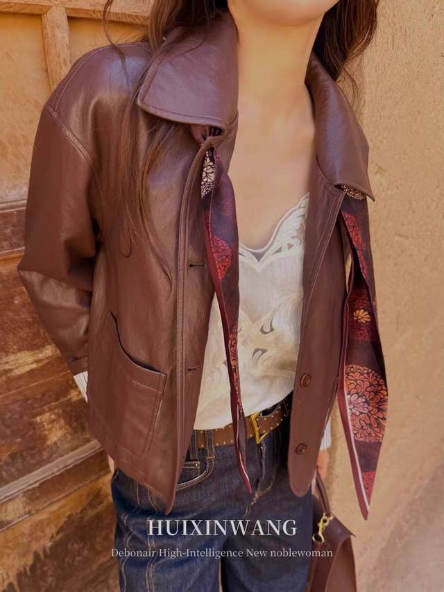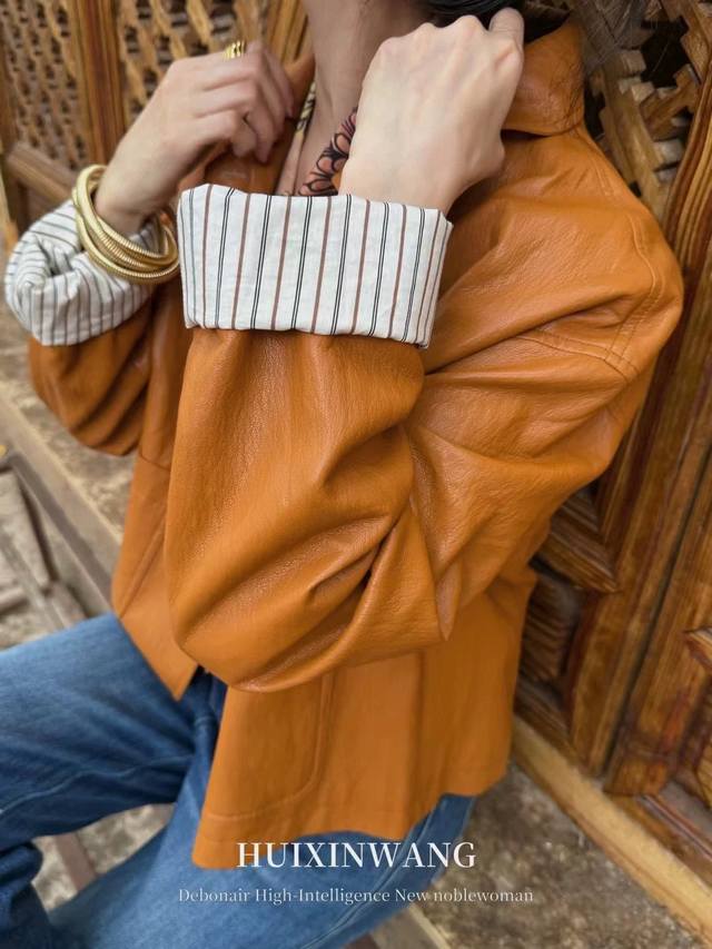 This elegant lapel-collared protein leather jacket boasts a refined, sophisticated feel and a subtle sheen. The classic lapel and striped contrasting sleeves break the monotony, while the striped cotton lining creates a rich, layered look, showcasing refined elegance in every detail.