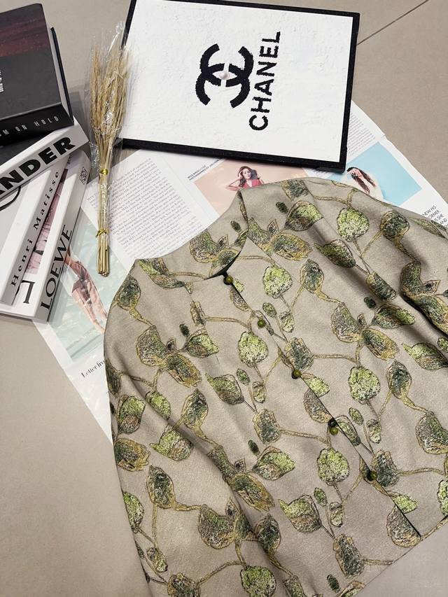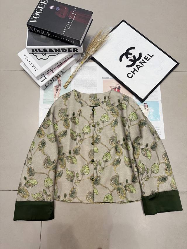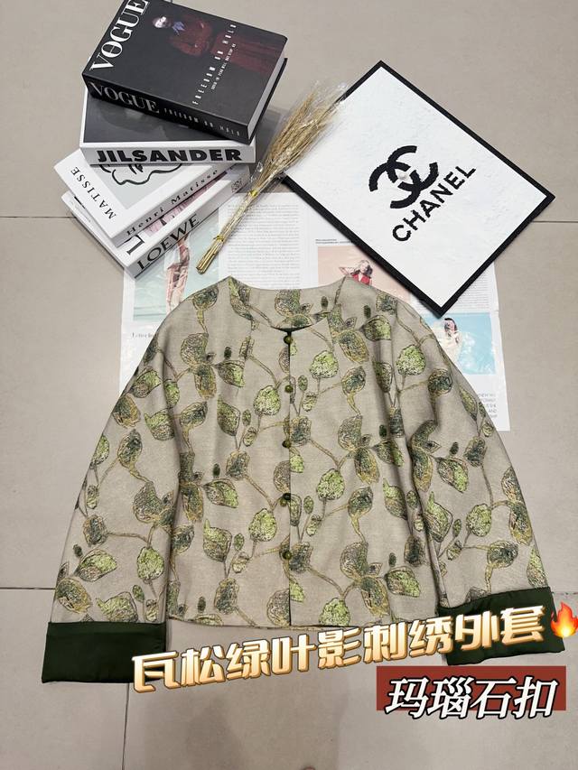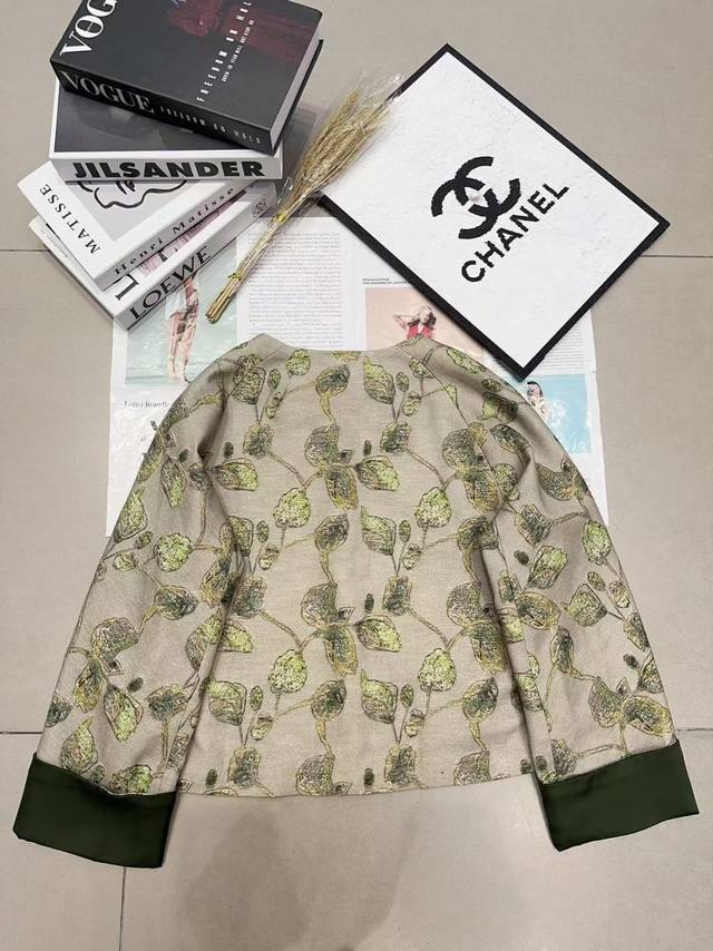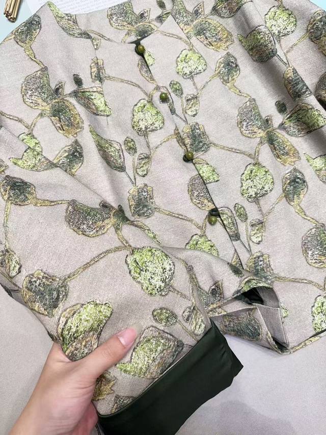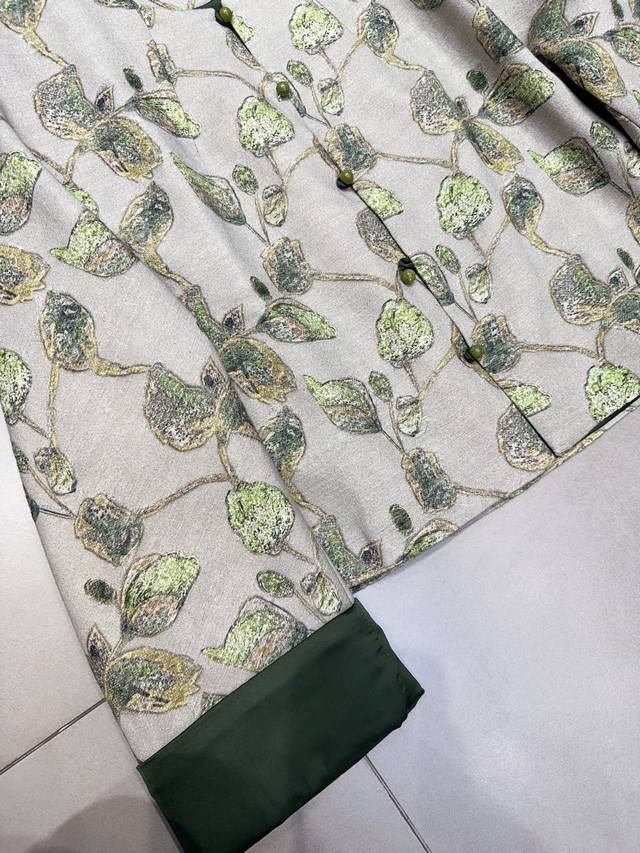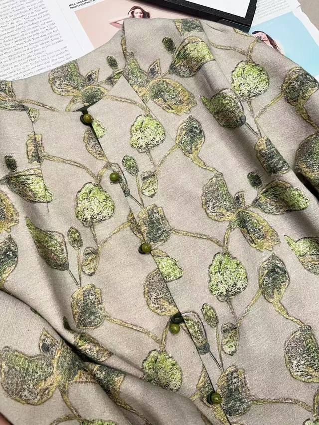 This jacket features embroidered pine green leaves, delicately embroidered with gilded leaves, creating an artistic smudge. The pine green hue is elegant and majestic, while the agate buckle is the finishing touch, highlighting the luxurious feel. The clean, simple silhouette, paired with contrasting silk cuffs, perfectly blends retro elegance with modern simplicity, creating an eye-catching, premium atmosphere. This unique and stylish texture filter is Smlxl