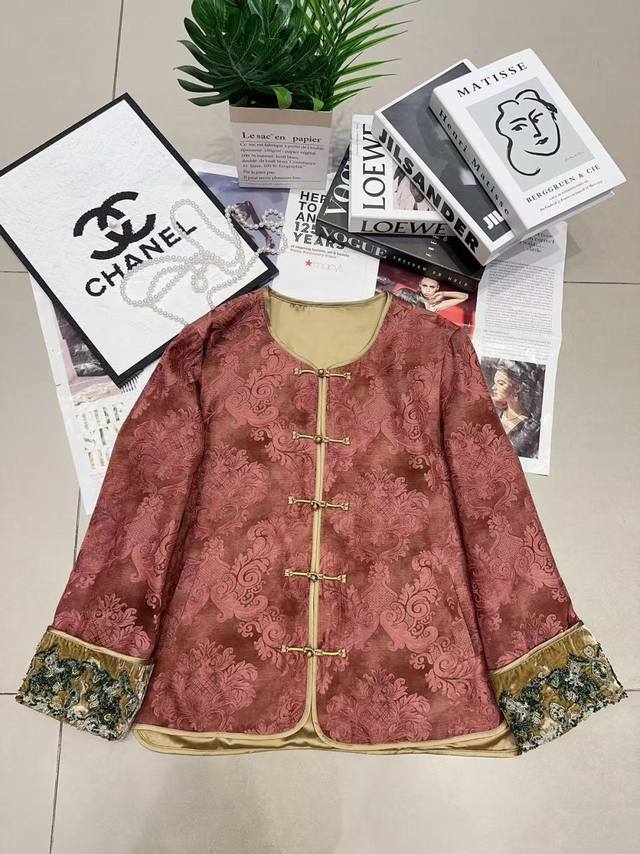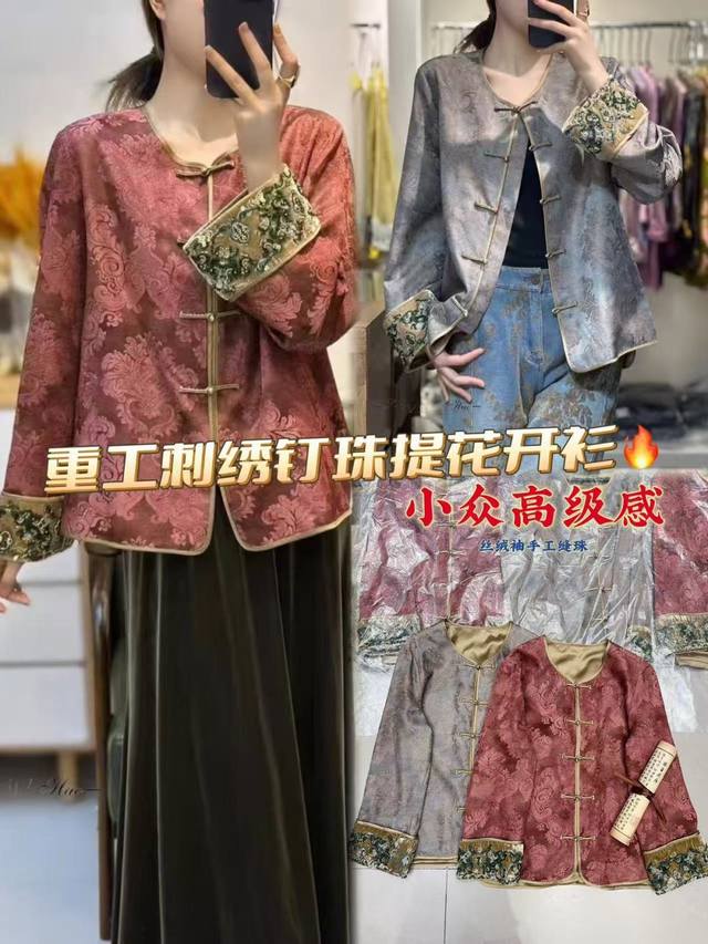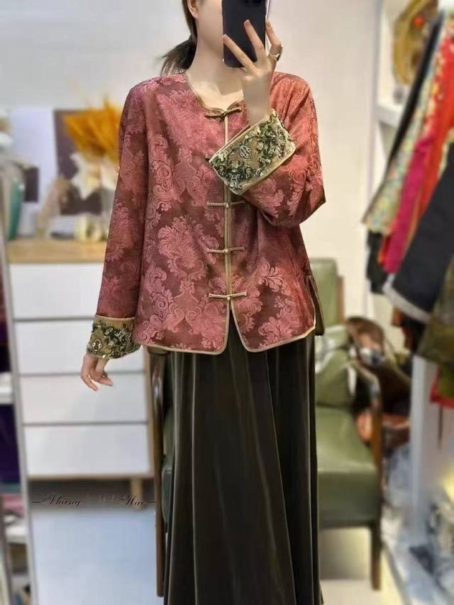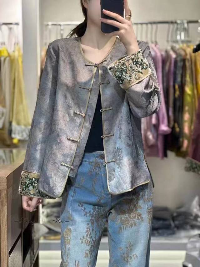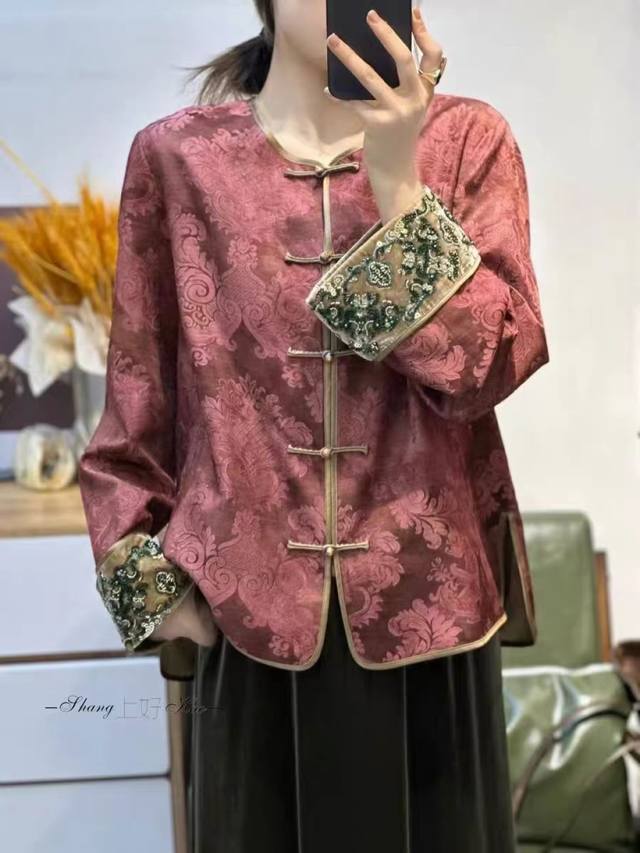 This stylish, heavily embroidered, beaded jacquard cardigan features Chinese-style buttons and jacquard fabric, embodying both retro heritage and premium quality. The cuffs are embroidered with beads that shimmer like starlight, each stitch exuding exquisite luxury, reminiscent of a work of art within the wardrobe. Rich in elegance and refinement, the hand-sewn velvet cuffs add a touch of designer sophistication. Simple yet uniquely Chinese in style and crafted with meticulous craftsmanship, it exudes a relaxed, refined aura, overflowing with a refined, niche feel. Smlxl