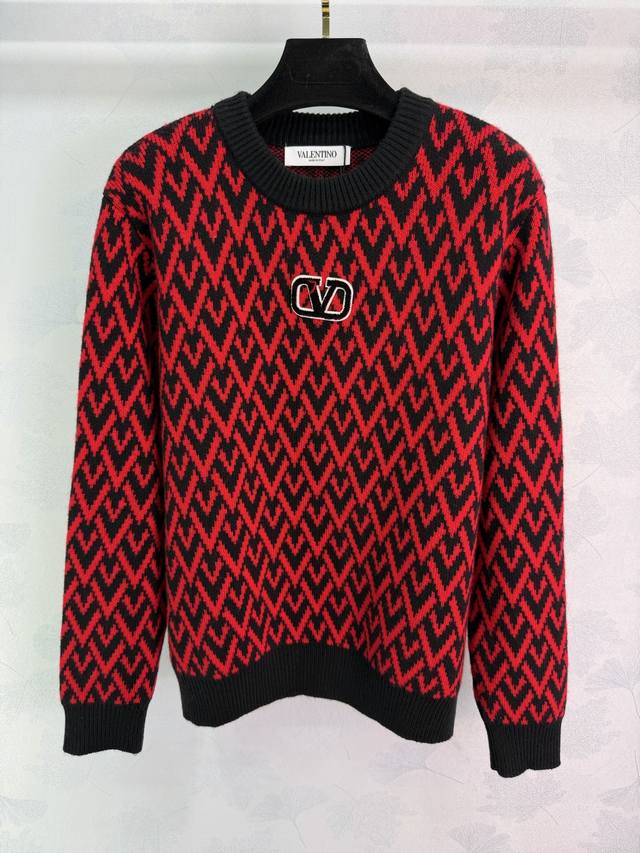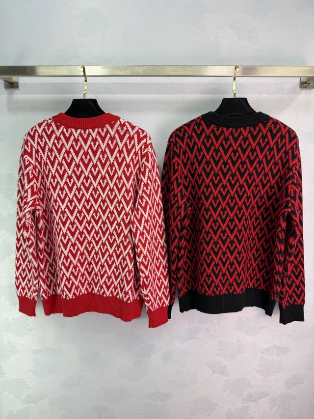 This Valentin knit sweater features a striking red base with white geometric patterns. Available in 2 colors and 3 sizes (S, M, L). T226B. DDD