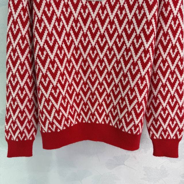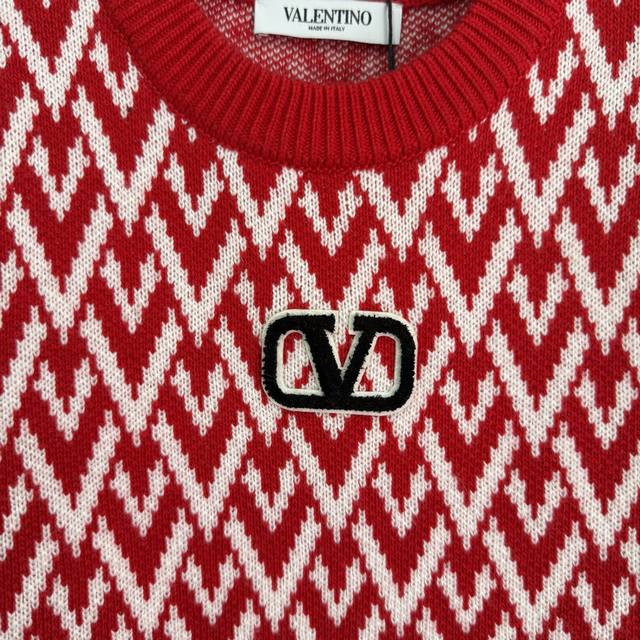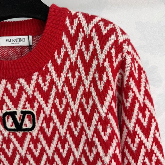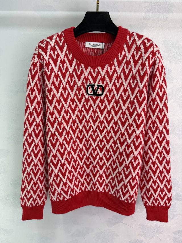 / This Valentin knit sweater features a striking red base with white geometric pa