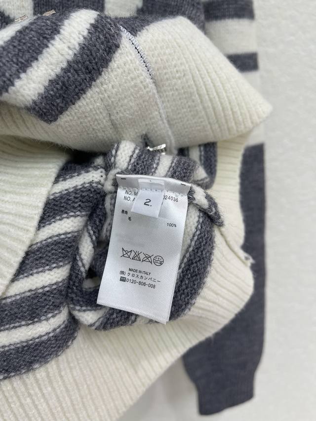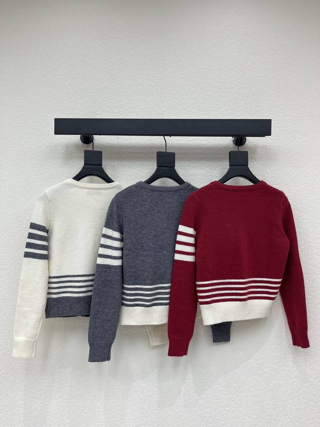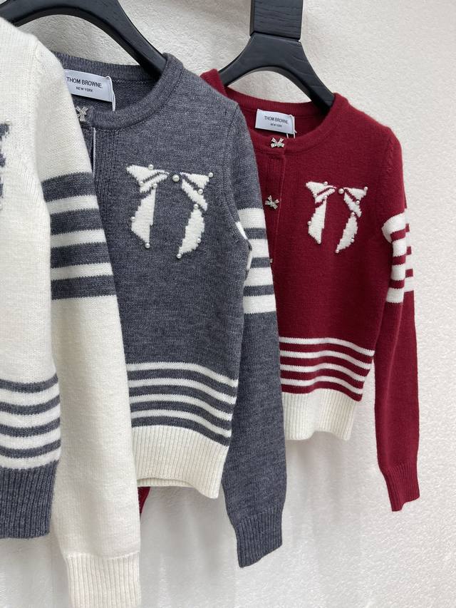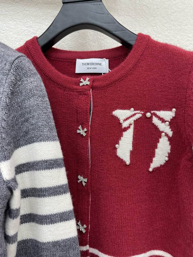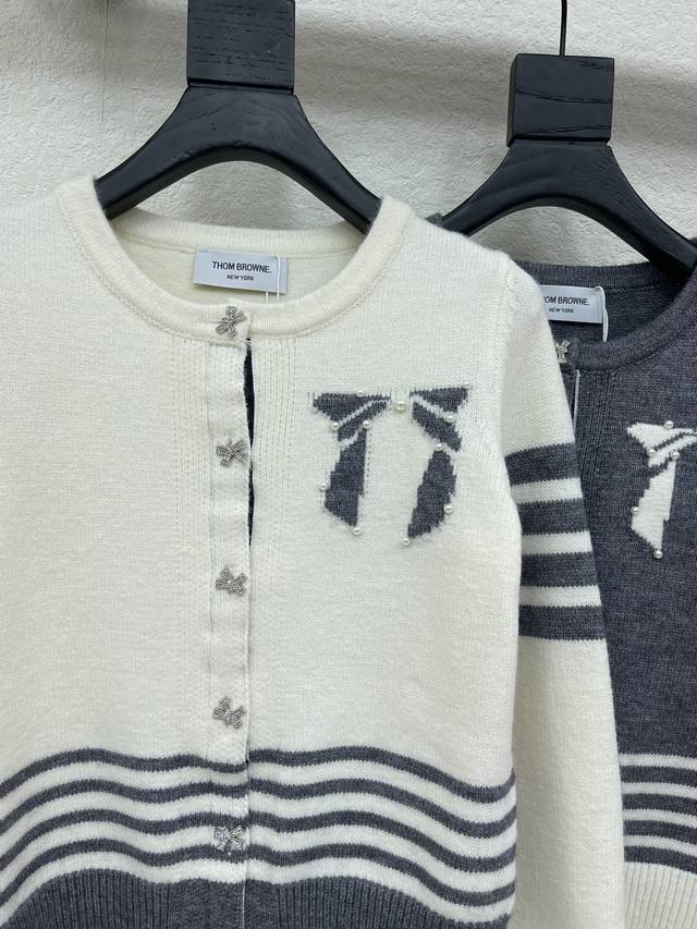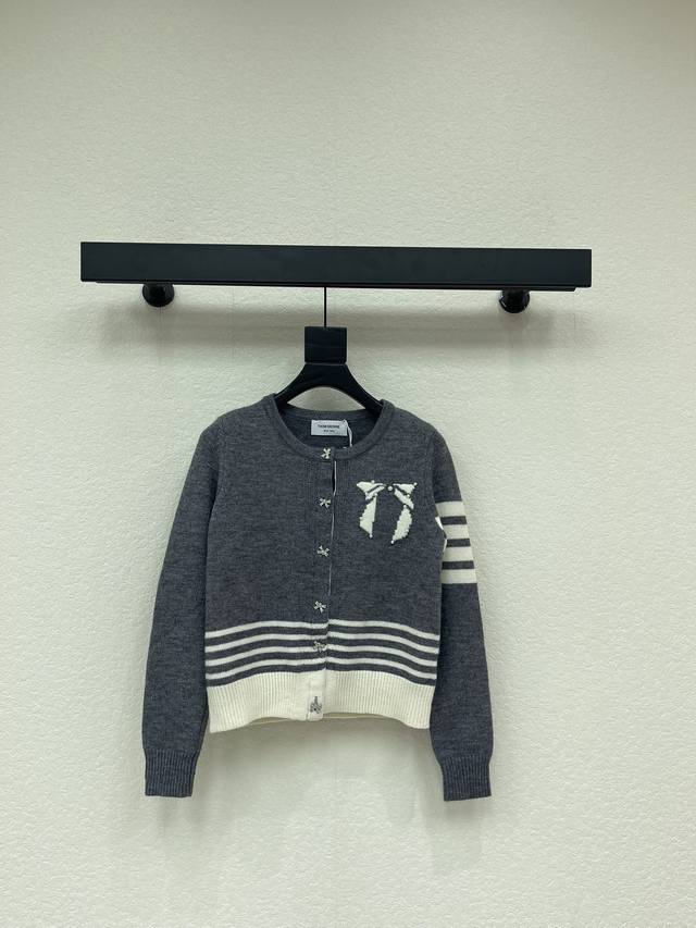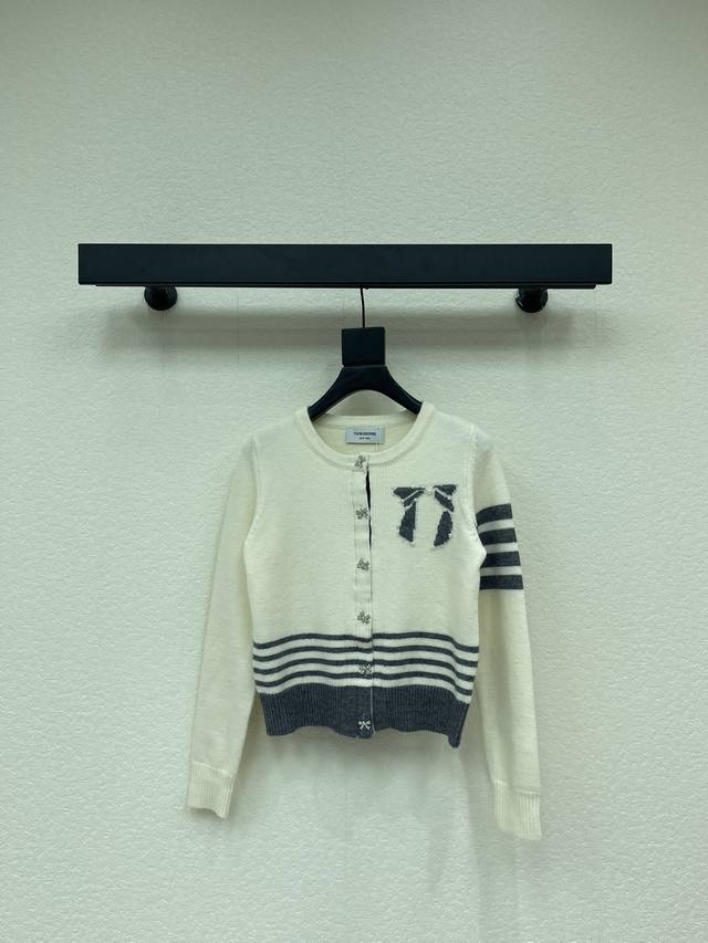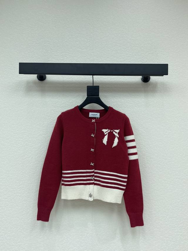 Thom Brown* 2026 Early Spring New Arrival Tb Crew Neck Beaded Bow Knit Cardigan! Made from custom wool blend yarn, this cardigan boasts a delicate, soft, and comfortable texture with a lustrous finish. The crew neck design features contrasting stripes throughout, complemented by custom rhinestone bow buttons. High-end and stylish, it exudes brand identity. Youthful and flattering, perfect for everyday wear and commuting! Sml Aa. DDD