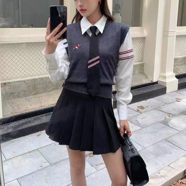 Thom Browne 2025 Early Autumn New Preppy Style Embroidered Dog Tie White Long Sleeve, One Color, Three Sizes: Sml