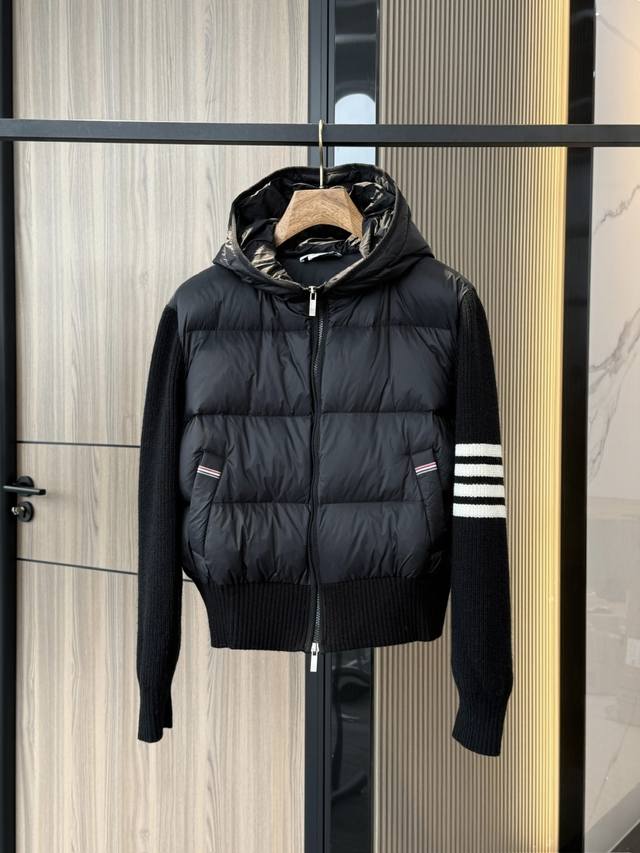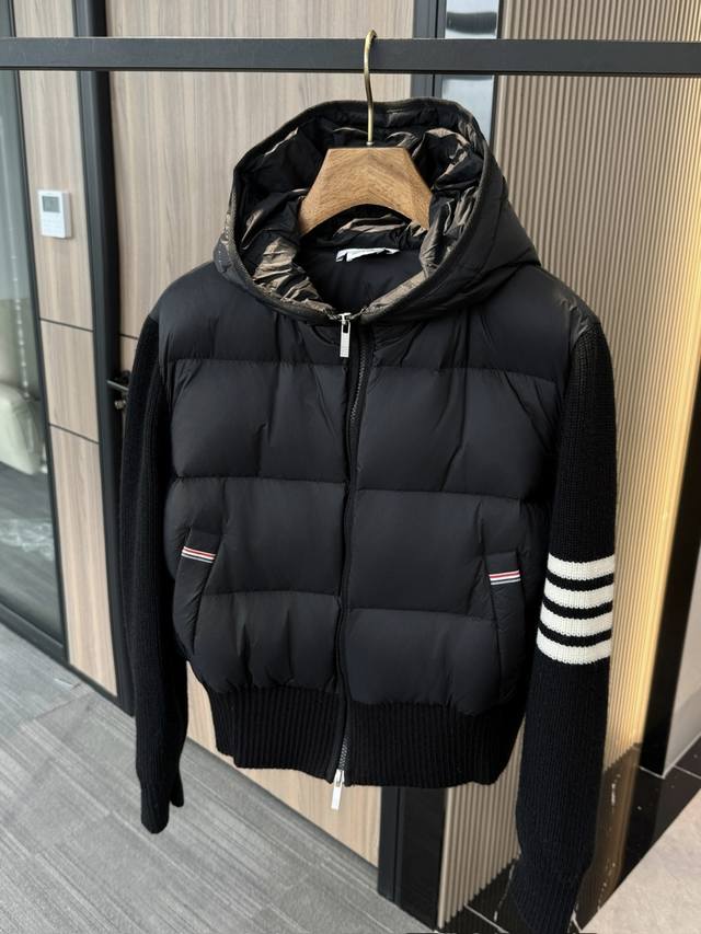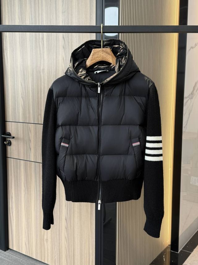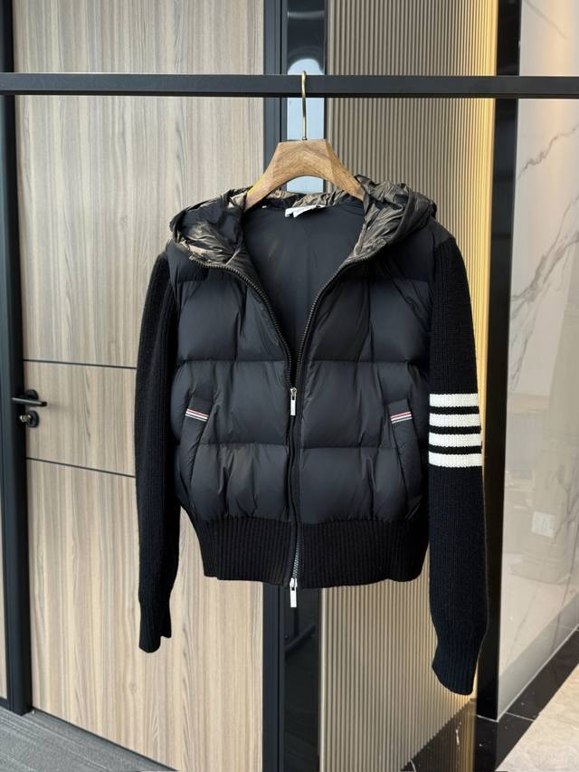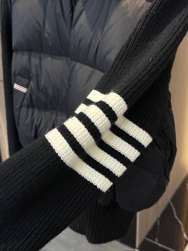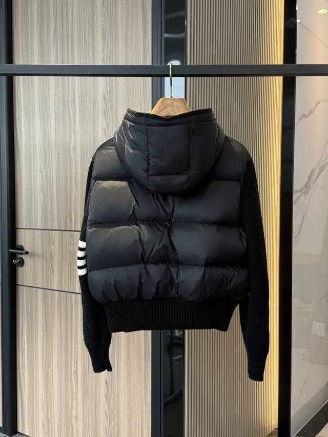Thom Browne Thom Browne Knit Paneled Down Jacket | "When buying down, look for the down content. Ours is 95% white duck down, which is lighter and warmer than the more common 90% down on the market. You'll see the difference once you wear it." Most 90% white duck down on the market has a higher proportion of feather stems, but lacks bulk and resilience, making it prone to flattening over time. We use 95% white duck down: with a higher down content, it's lighter, warmer, more durable, and has a crisper appearance. Upgraded filling: 95% premium white duck down and 5% feather down, with larger and lighter down clusters, providing warmth and less bulk at the same weight. It rebounds when pinched, retains its shape even after wear, and maintains a sculpted silhouette. High-quality cleanliness treatment for low odor and dust, ensuring a comfortable fit. Down-resistant lining and dense stitching prevent down from escaping or seeping through. The knitted sleeves and hem have a stretchy fit, effectively locking in warmth and allowing for greater freedom of movement. The knitted patchwork hooded down jacket has a simple and basic design. The overall body adopts the horizontal pressing process, so the upper body is not bloated at all. The sleeves and hood are made of knitted patchwork, which beautifies the proportions while modifying the waist curve, making it easy to get a small waist in winter. The perfect length is not picky about height and can be controlled by all body shapes. It is versatile and outstanding
