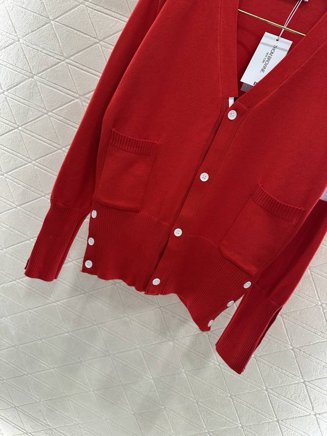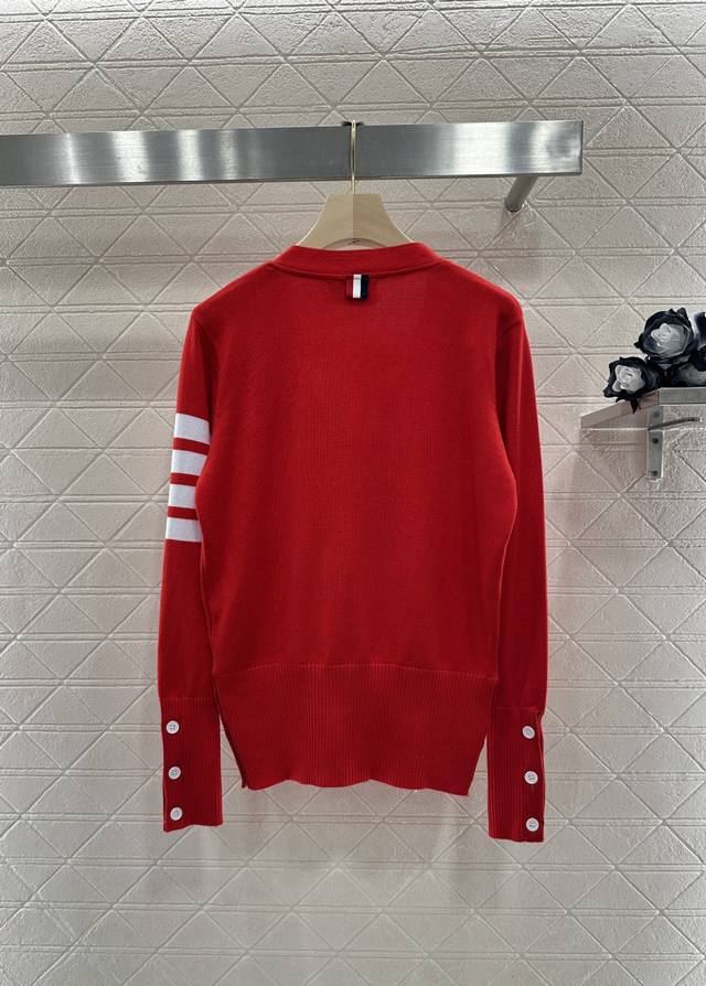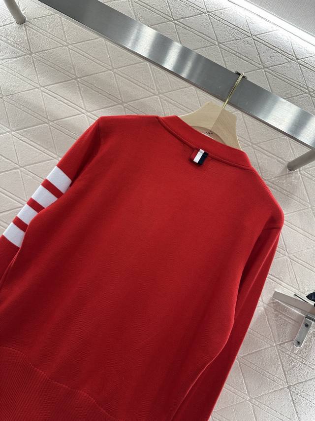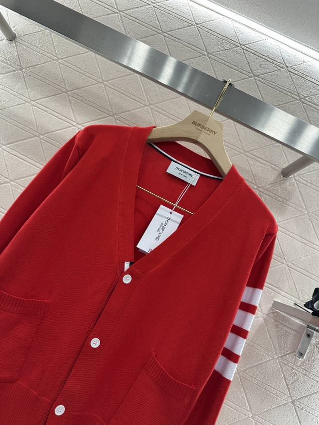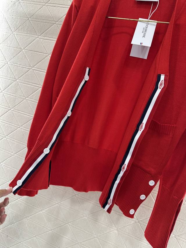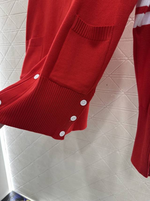 Thom Browne*2026 New Arrival Ddd Striped Knit Cardigan Ddd. Made with custom Yb wool yarn, this high-quality, soft, and comfortable V-neck button-down cardigan features a vibrant red hue that clashes with Thom Browne's classic four stripes. This cardigan perfectly blends American preppy style with understated luxury. The red and white color blocking is sharp and eye-catching. It can be worn alone or layered for a unique look, and it's perfect for the New Year. The side buttons echo the front, adding layers and a more preppy feel. Simple and stylish for autumn and winter. Custom fabrics and accessories, look for the high-quality red version. DDD