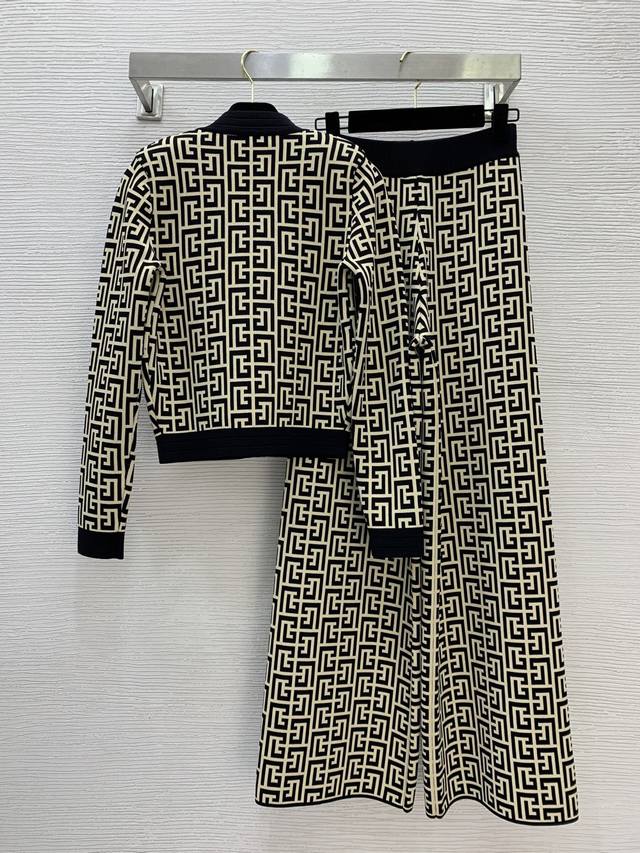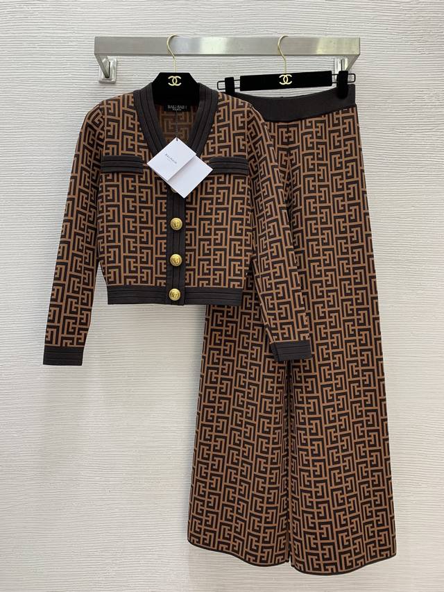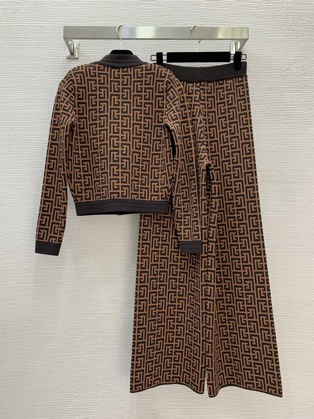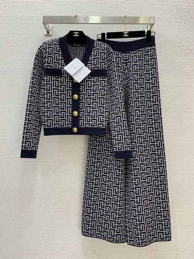 Top and pants Balmai*'s new monogrammed maze jacquard knit two-piece set! Classic lion head gold button contrasting colorway cropped V-neck long-sleeved cardigan top with elastic waist and wide-leg knit pants! Available in apricot, coffee, or blue. Size S: Chest 78cm, Sleeve 56cm, Length 48cm; Waist 58cm (stretchable), Pants Length 103cm