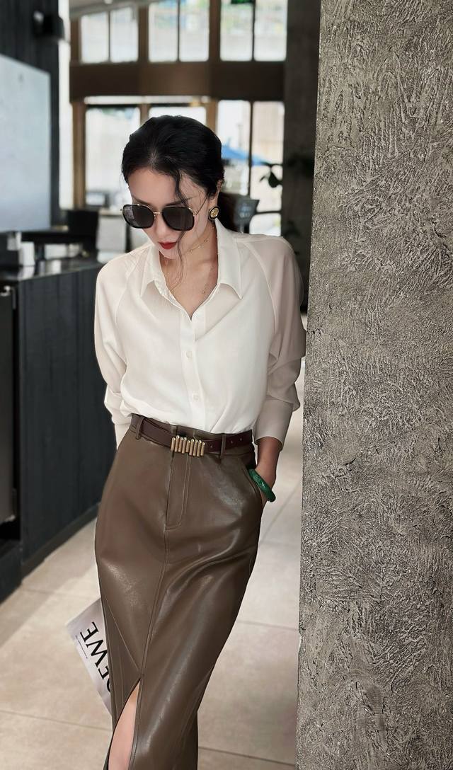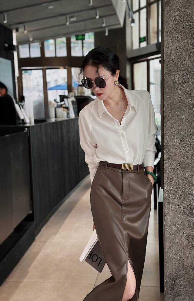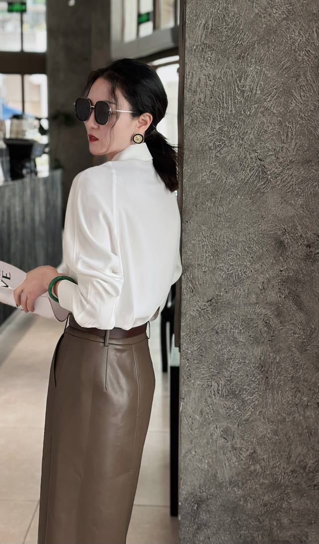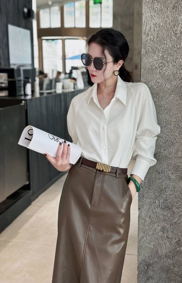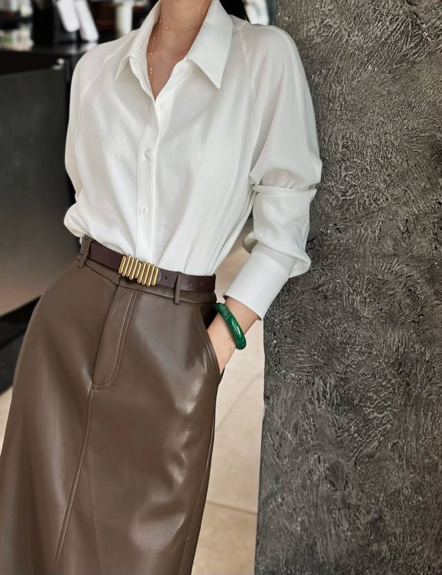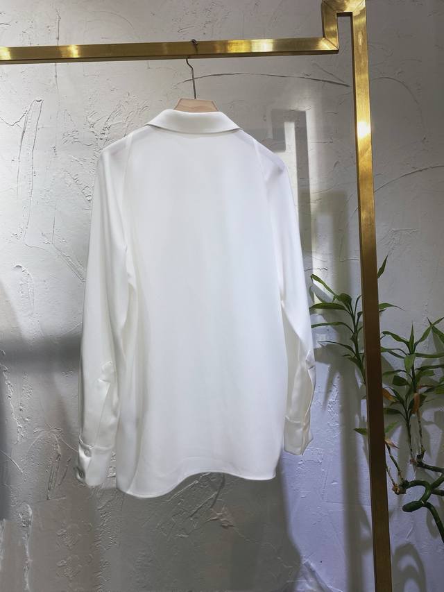 Simple and elegant acetate jigsaw shirt with integrated shoulders and sleeves, available in dark brown and white, sizes S-XL