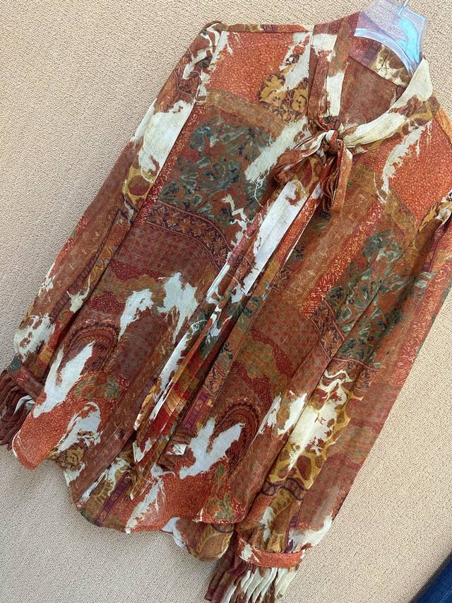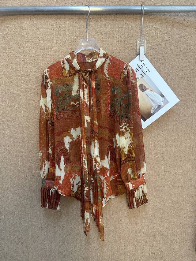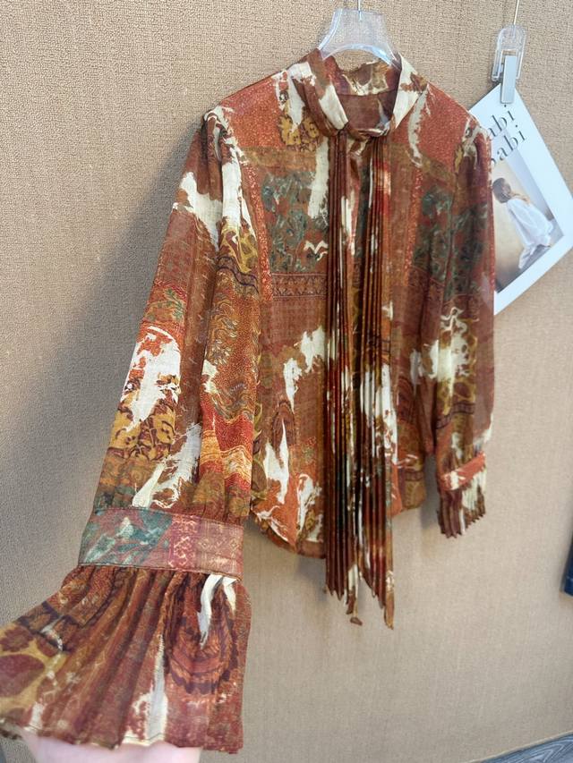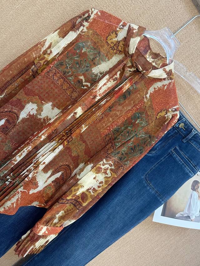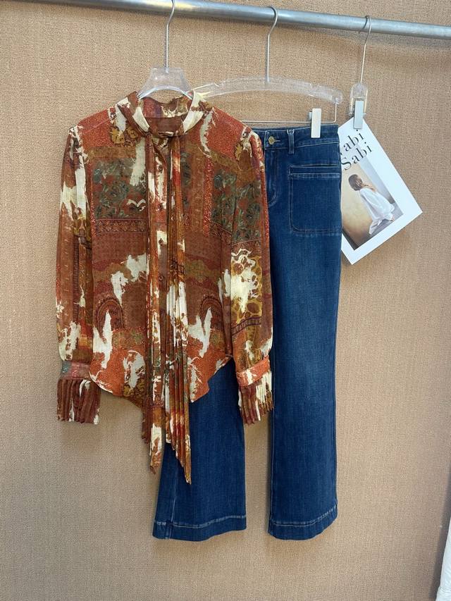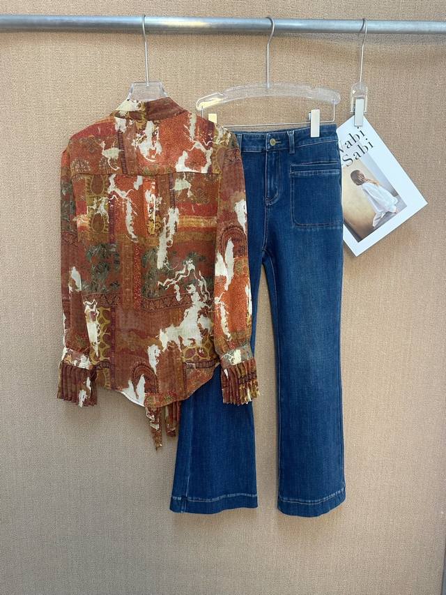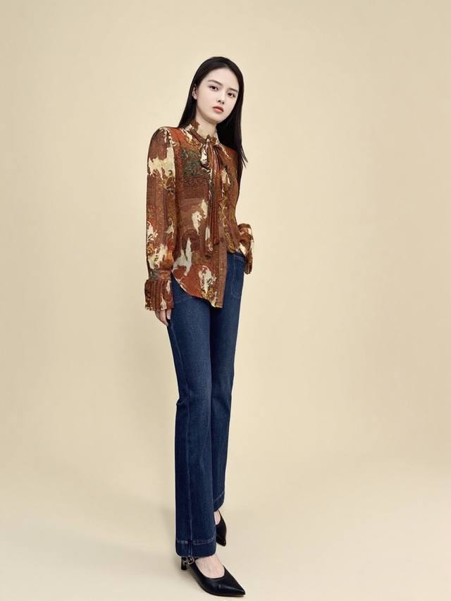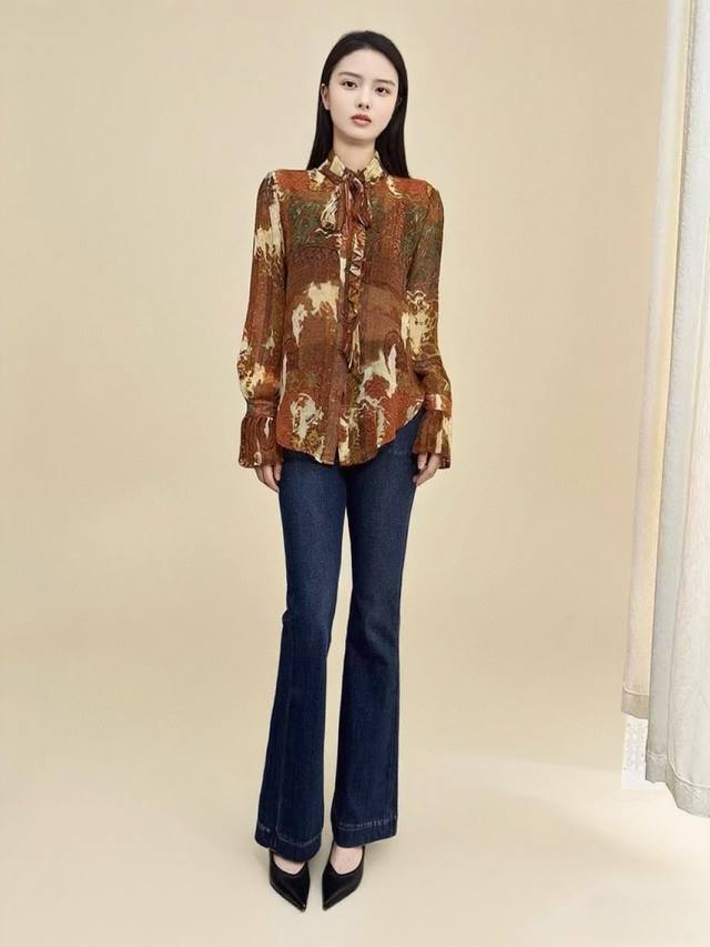 Autumn Maillard retro print shirt has an artistic feel, paired with classic blue flared jeans, casual yet refined, easily creating a lazy and stylish daily wear atmosphere