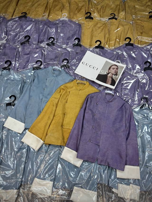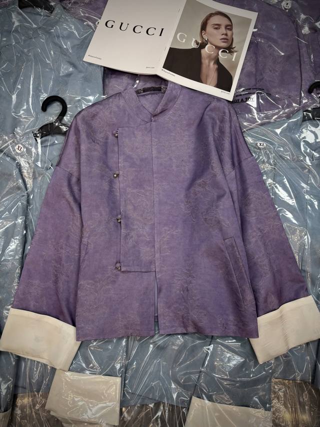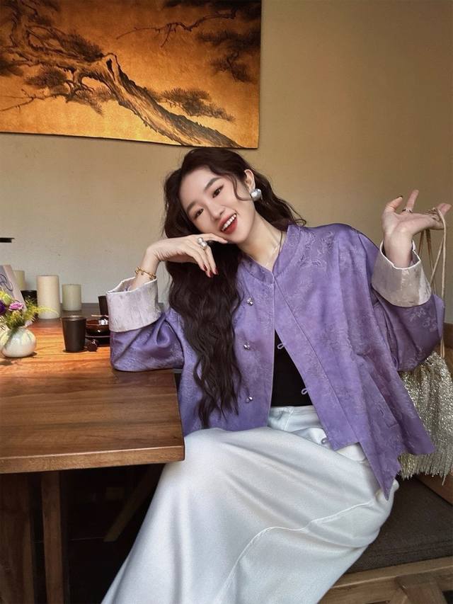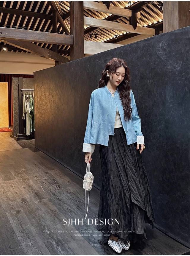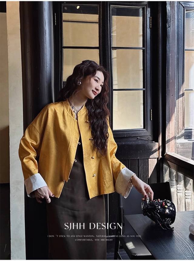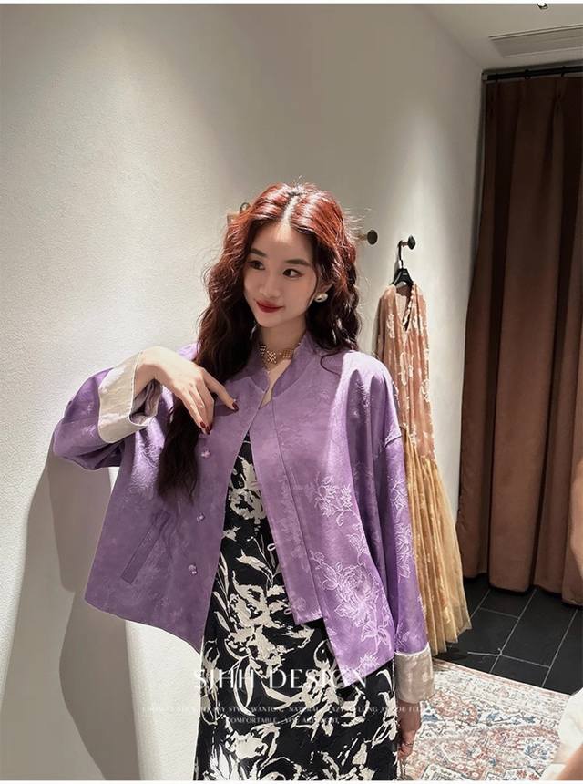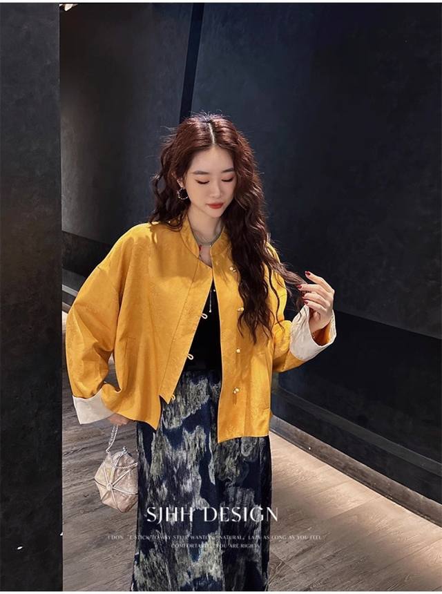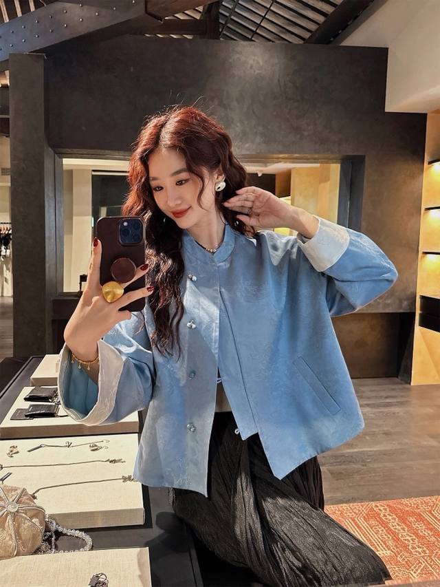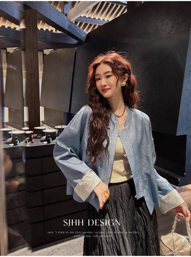 Unique and stunningly beautiful rayon and gold-thread jacquard Chinese-style jacket. The fabric has a soft sheen and refined jacquard pattern with a distinct Chinese style. The color combination is harmonious and durable, and the touch is silky smooth. The meticulous craftsmanship is simple and elegant, presenting an unparalleled high-quality texture and touch. It has an elegant charm and a fashionable retro feel, creating a garment of Artemisia-level quality. Sky blue, yellow, and purple. Smlxl