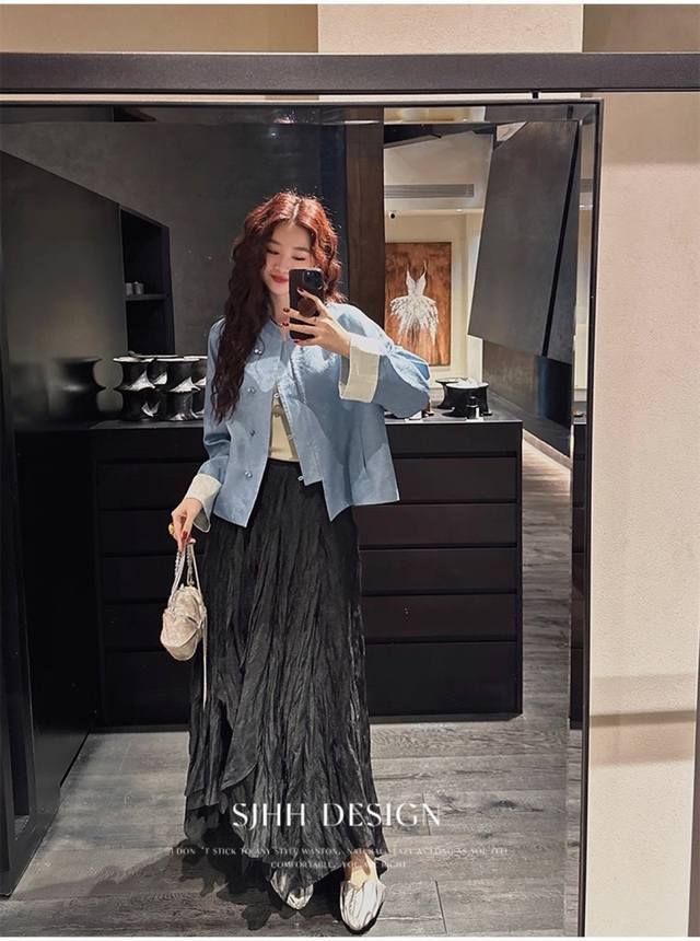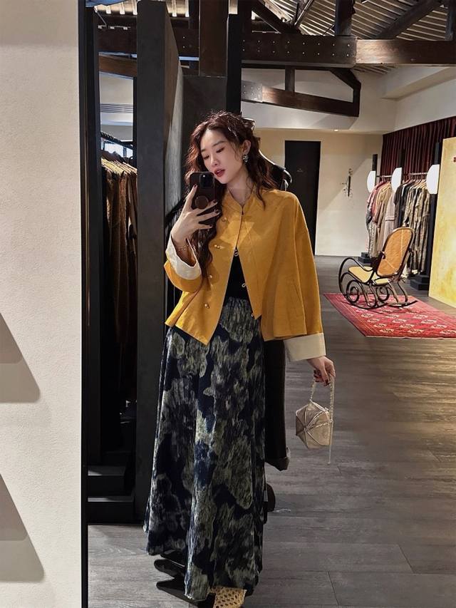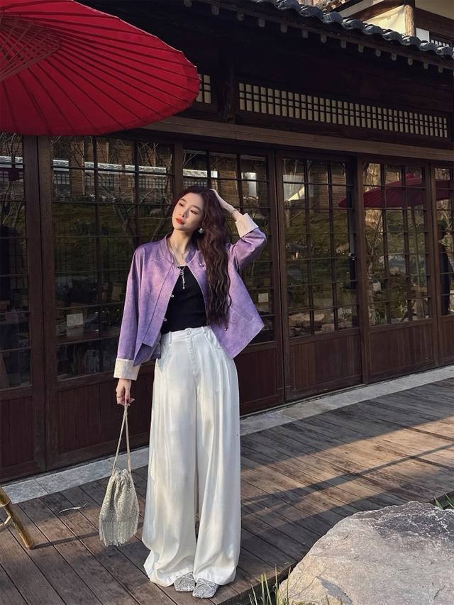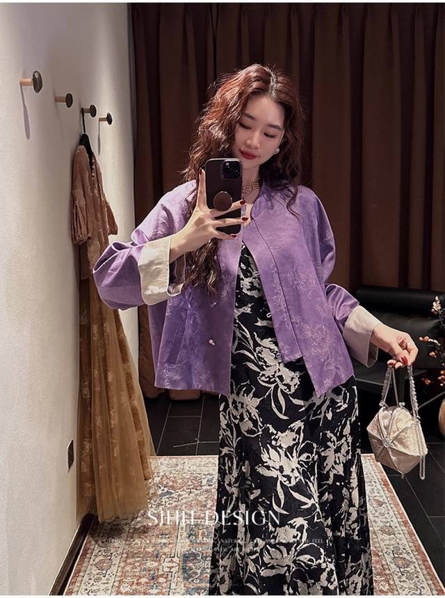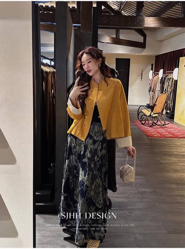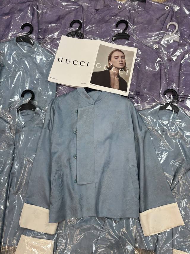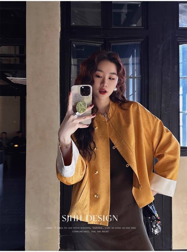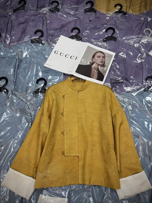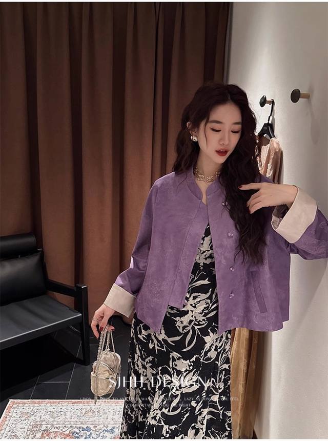 Unique and stunningly beautiful rayon and gold-thread jacquard Chinese-style jacket. The fabric has a soft sheen and refined jacquard pattern with a distinct Chinese style. The color combination is harmonious and durable, and the touch is silky smooth. The meticulous craftsmanship is simple and elegant, presenting an unparalleled high-quality texture and touch. It has an elegant charm and a fashionable retro feel, creating a garment of Artemisia-level quality. Sky blue, yellow, and purple. Smlxl