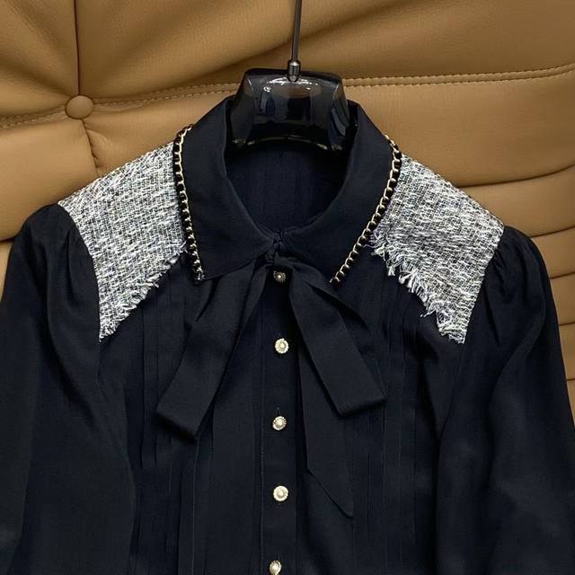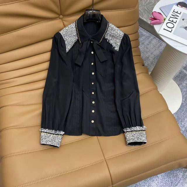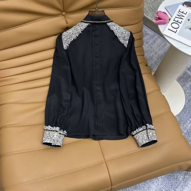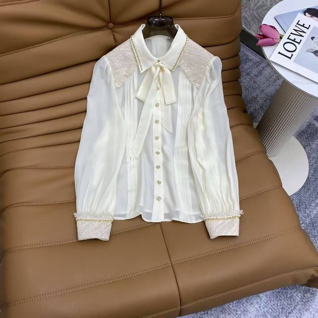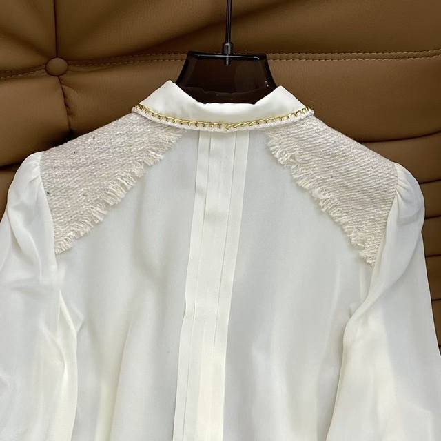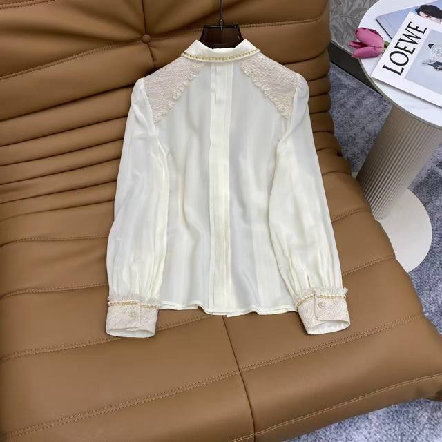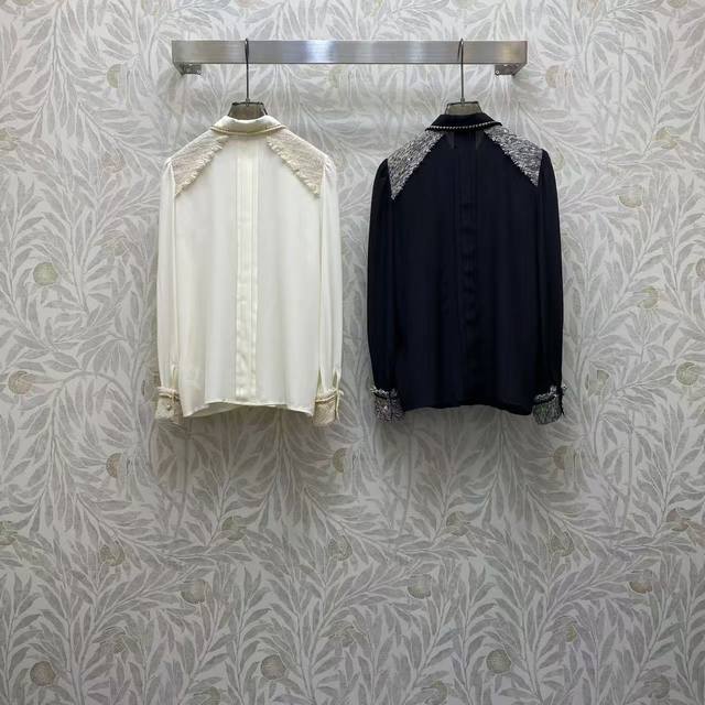 Va2026 Sp Premium Silk Shirt This shirt is crafted from heavyweight silk, boasting a beautiful drape and delicate sheen. It feels smooth and soft against the skin, exuding elegance and sophistication. Exquisite rhinestone embellishments on the collar and cuffs add a touch of refinement to the simple design. Suitable for everyday wear or light formal occasions. Colors: Black, White Fabric: Heavyweight Silk Fabric Smlxl DDD