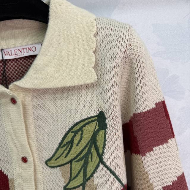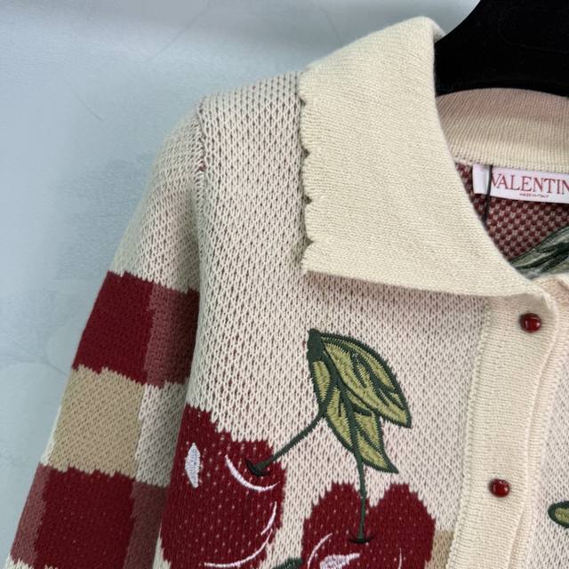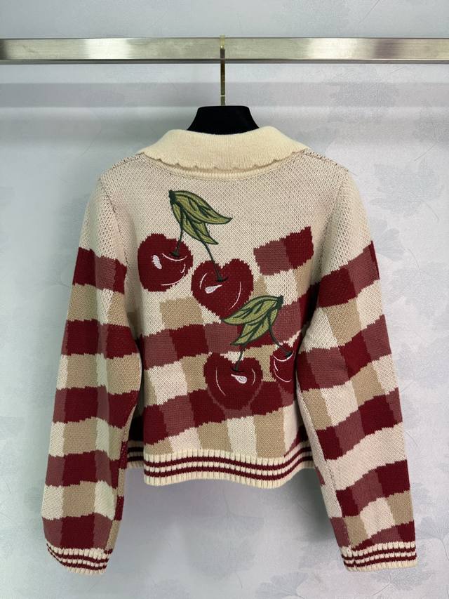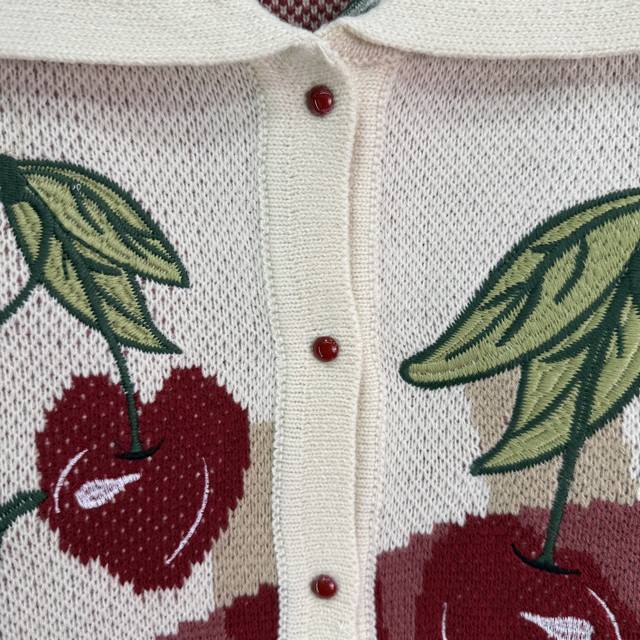 Va*25 New Early Fall Cherry Jacquard Cardigan Off-White with Red Stripes Super C
