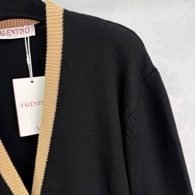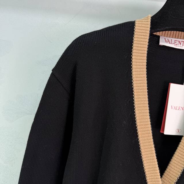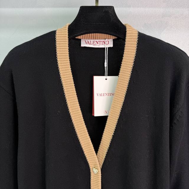 Va*25 New Early Fall Knit Cardigan: Black with a brown V-neck design and gold heart-shaped buttons. Simple and elegant, with practical pockets on both sides, this versatile cardigan breaks the dull autumn and winter vibe with a stylish and sophisticated look! 1 color, 3 sizes Sml T226B.
