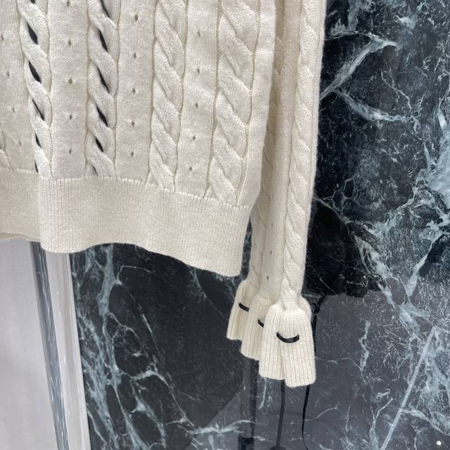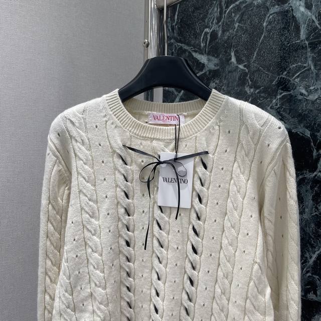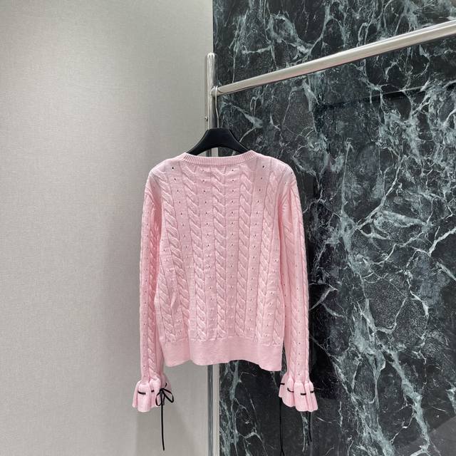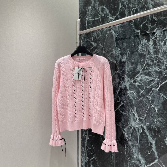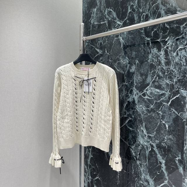 Valen 25 early autumn new hollow cable pattern knitted top with ribbon decoration round cuffs with trumpet-shaped decoration, sweet temperament, rich details, elastic regular version, slimming, elegant and fashionable, two colors Sml