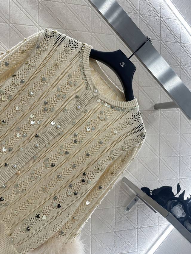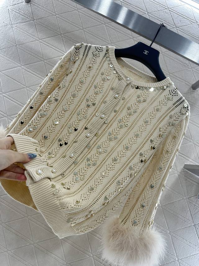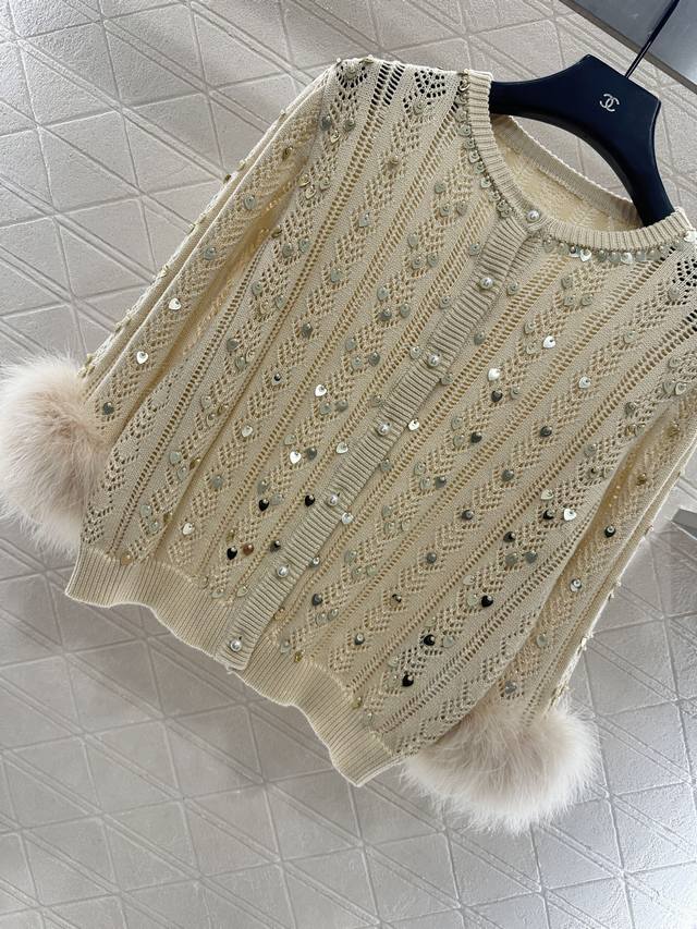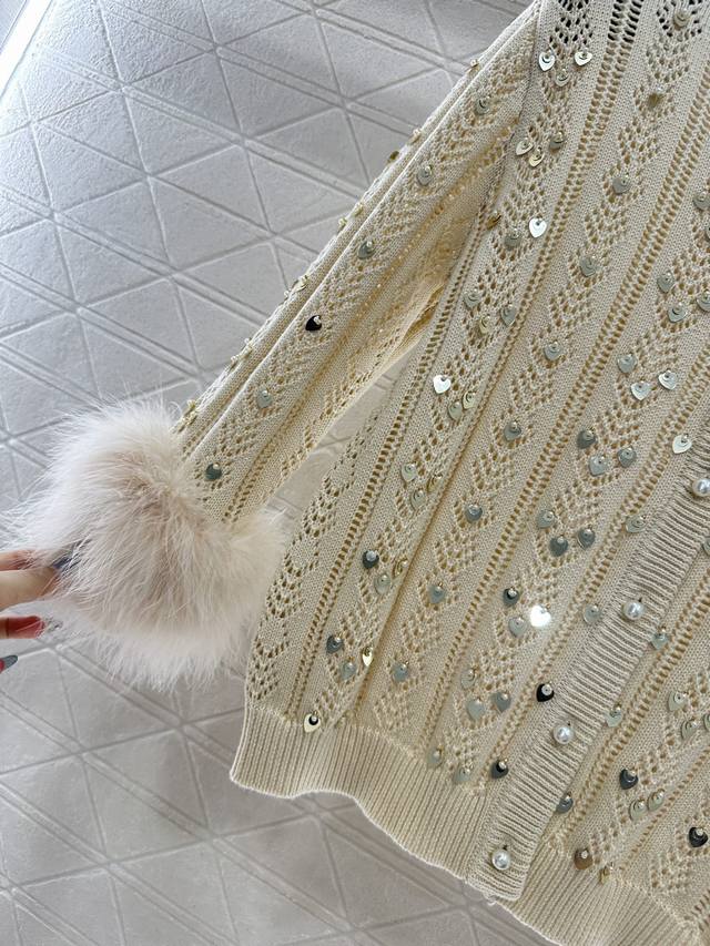 Custom Yb wool/L cotton yarn, soft and comfortable, stylish and slimming. Round neck cardigan cut, can be worn alone or layered as an outer layer. Straight shoulder silhouette accentuates the neck and shoulders. Vertical cutouts with layered sequins and pearls reflect light. Ribbed edging adds exquisite detail. The sleeves are adorned with fluffy, lightweight feathers, enriching the fashion versatility. The shimmering effect reflects light and sways with movement, showcasing a romantic and glamorous style. The solid color body features subtle details, making it effortlessly stylish and sophisticated. Custom fabrics and accessories, high-quality version