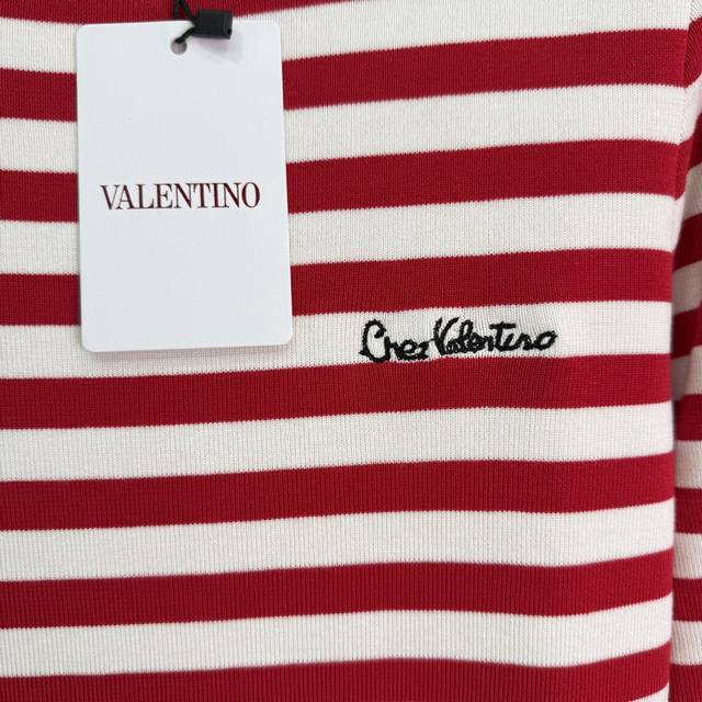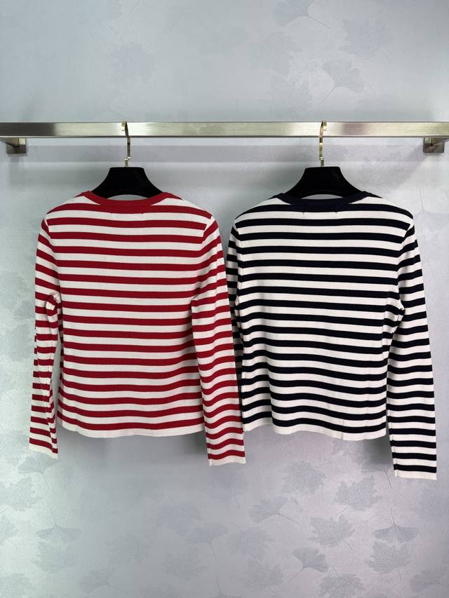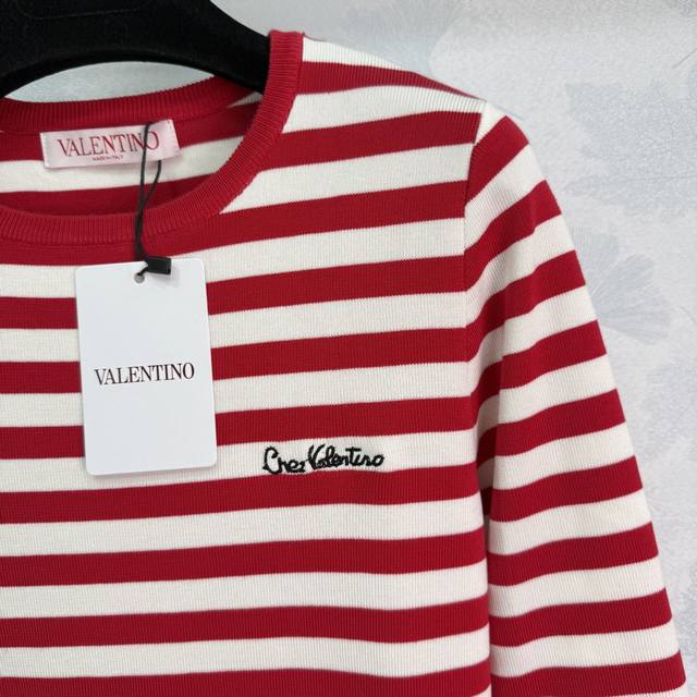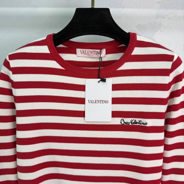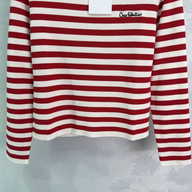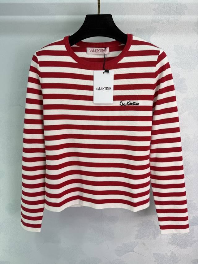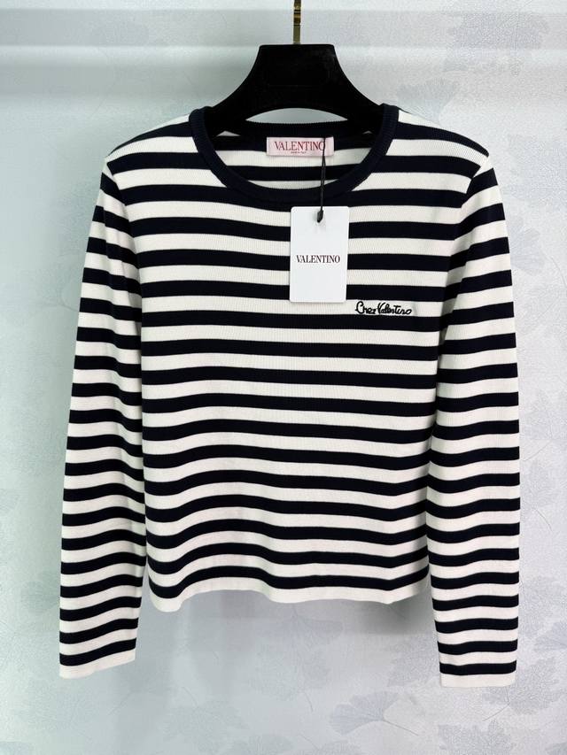 Valentin*2025 Early Autumn latest series! Striped round neck knitted long-sleeved sweater! Customized Yb imported wool knitted material is soft, skin-friendly, comfortable and stylish. The interweaving of stripes throughout the body adds a sense of layering. The embroidered floral logo decoration on the chest highlights the brand's tone. The retro style is strong. The surface and auxiliary materials are developed. The round neck short-sleeved top is tailored to be playful and age-reducing and whitening! 2 colors and 3 sizes Sml T226B.