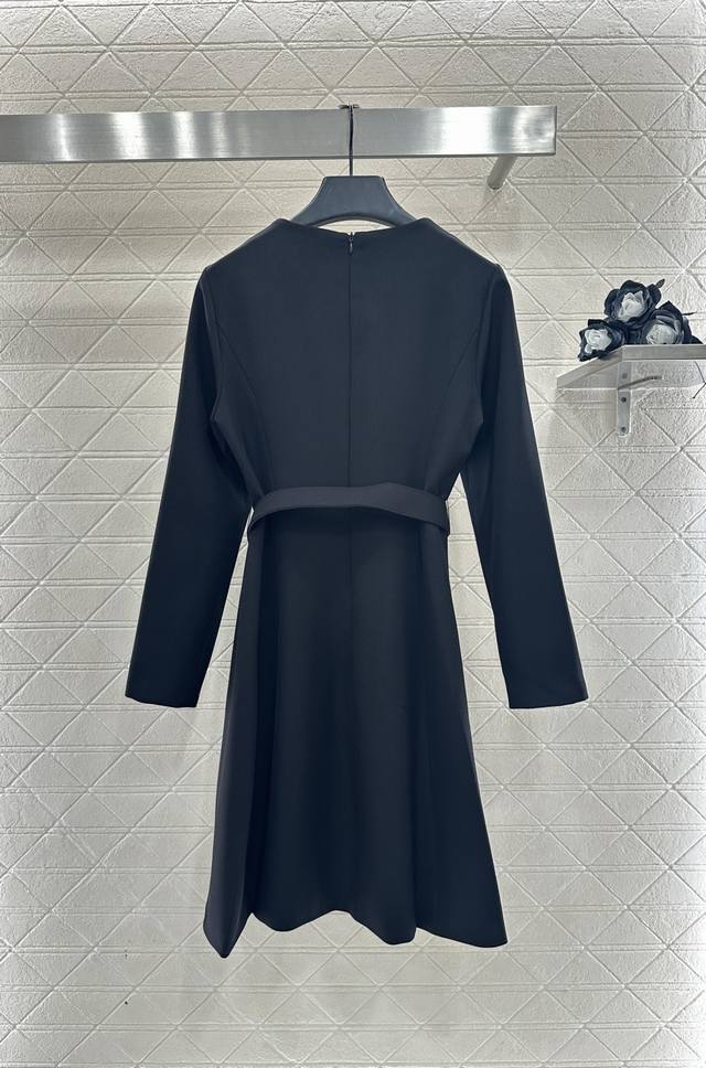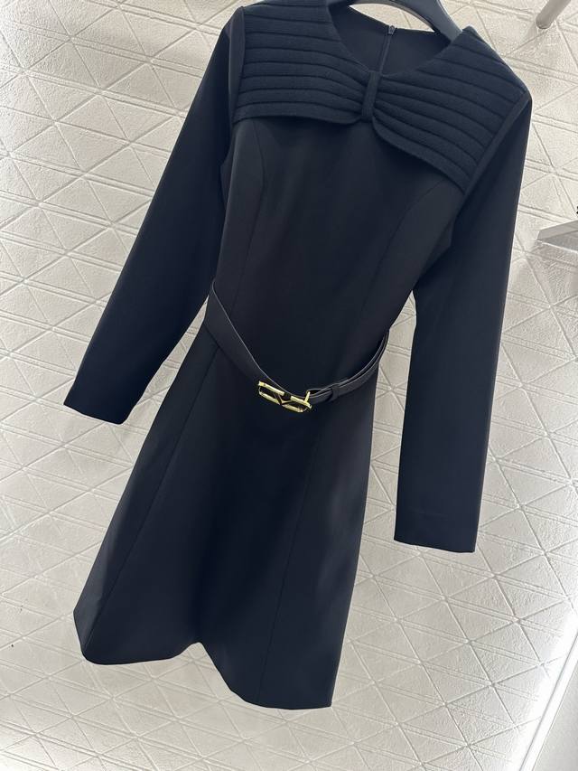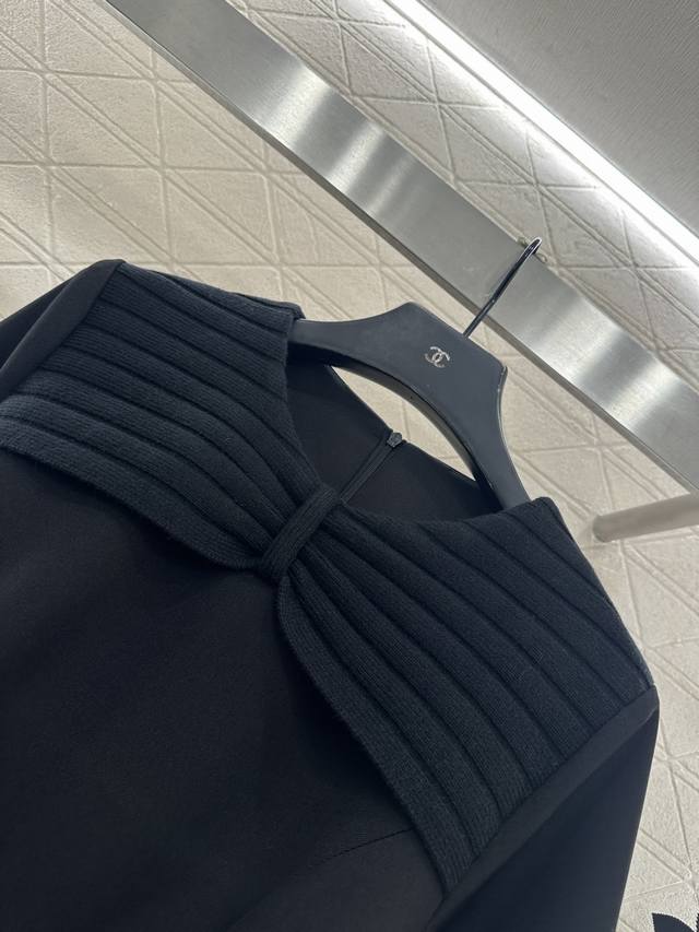 Valentin*2025 New Arrival Ddd Bow Knitted Neck Belt Dress Ddd Custom Yb Imported Material, with a distinct texture and beautiful drape. The round neck and belted dress features a horizontal ribbed knit fabric overlaid at the neckline and shoulders, enhanced with a bow design for added sophistication. The design is elegant and sophisticated, paired with a logo belt at the waist for a subtle touch of luxury. Adjustable for a flattering silhouette, it exudes a refined and intellectual charm. The dress is simple yet high-end. Custom fabrics and accessories, please ensure you choose the high-quality version. Two colors available: black and white DDD