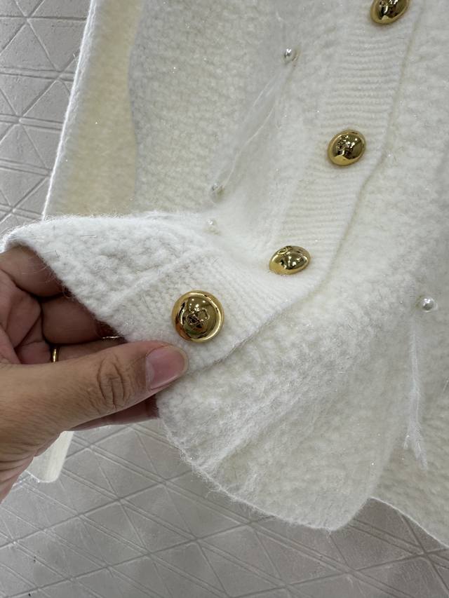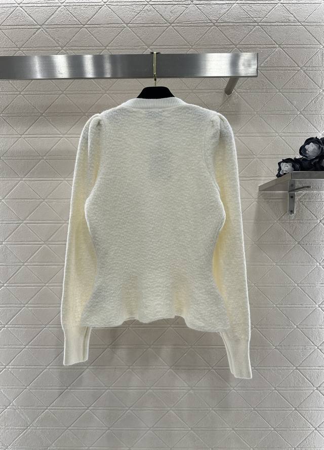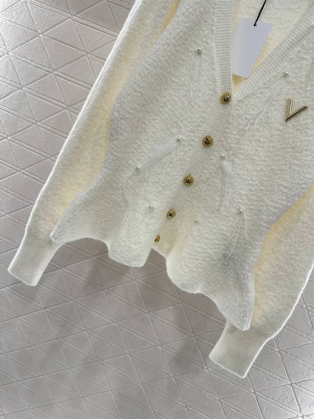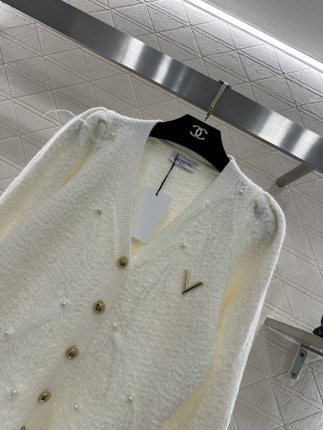 Valentin*2026 New Arrival Ddd Puff Sleeve Waist-Defining Feather Knit Cardigan Ddd Custom Yb wool knit material, high-quality texture, comfortable and soft. V-neck knit cardigan, shoulder pleats create princess puff sleeves, waist-cinching and slightly A-line hem, outward-curling to outline the bust and waist, creating a feminine three-dimensional curve. The black tone is gentle and sophisticated. The pearl tassel details of the Valentin* knit cardigan incorporate elegance into every inch of the fabric, and the V-shaped metal logo is the finishing touch. It instantly creates a relaxed yet luxurious atmosphere. A simple and versatile piece for autumn and winter, it exudes a stylish vibe. Custom fabric and accessories, look for the high-quality version, available in white, red, and black. DDD