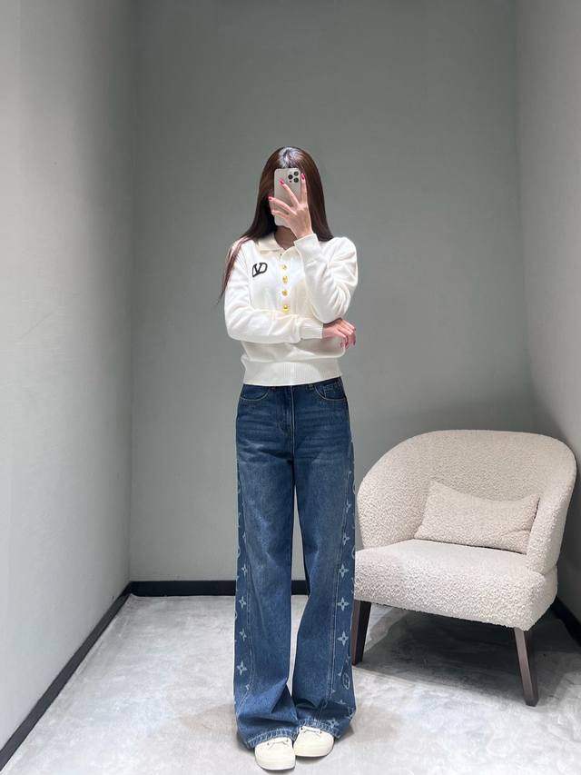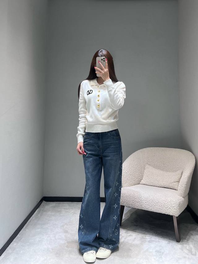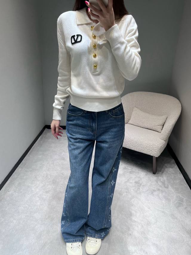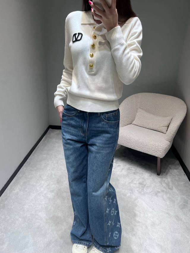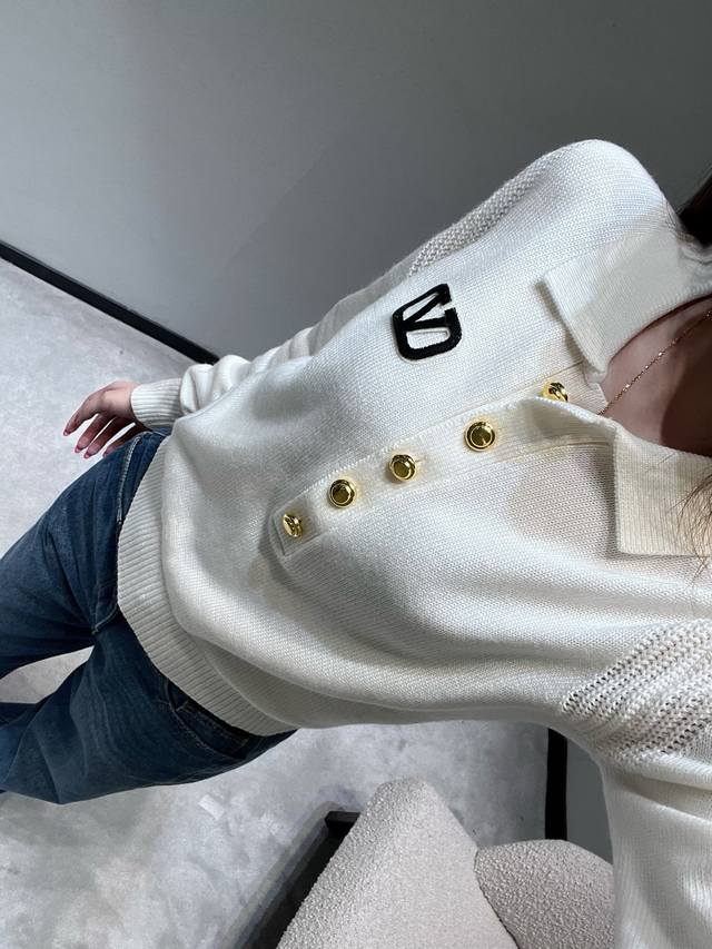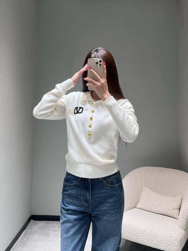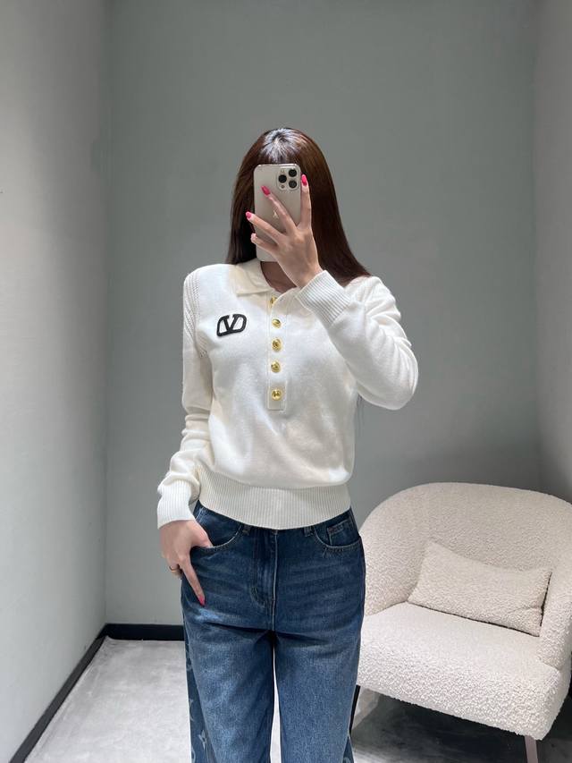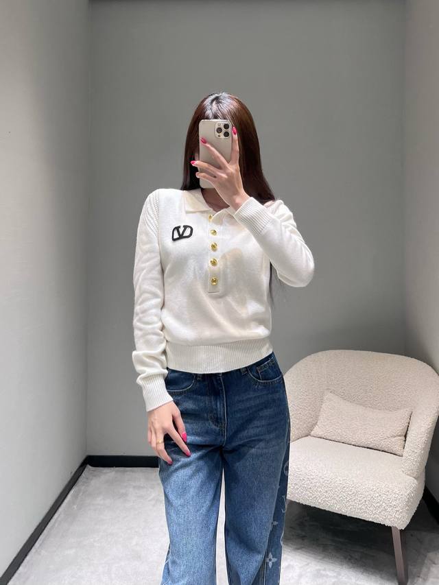 Valenti*O*Fw Autumn/Winter New Collection Collared Knit Sweater. Crafted with a fine cashmere blend, this premium version features a classic collar design paired with gold buttons. Textured details on the neckline and shoulders add depth and design flair. The signature black "V" logo adorns the left side of the garment, exuding sophistication. Sml DDD