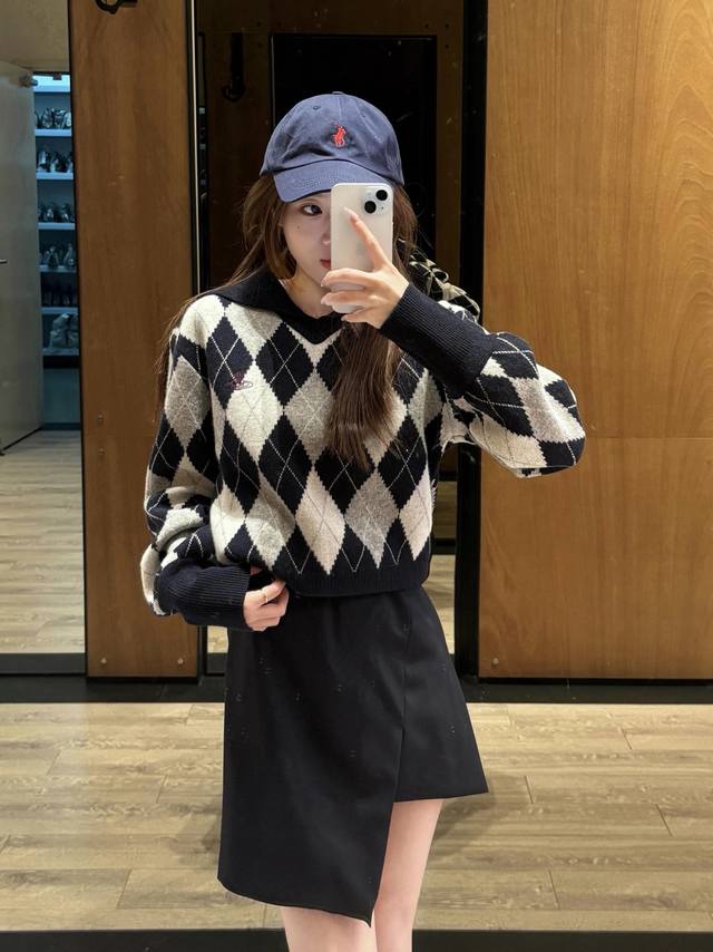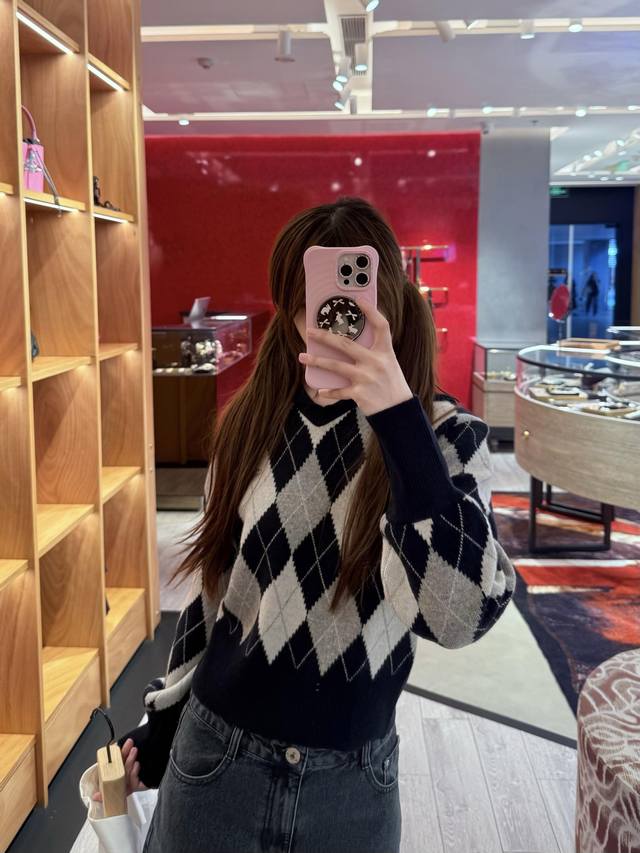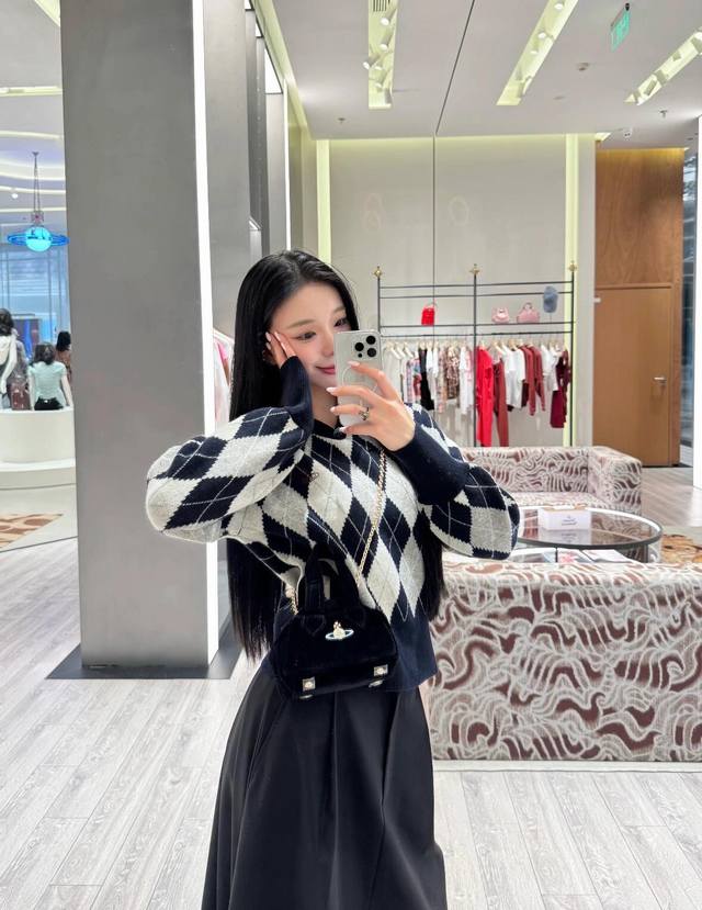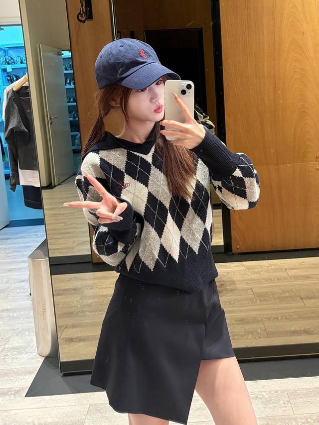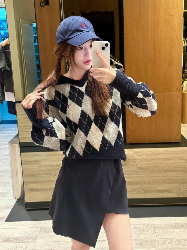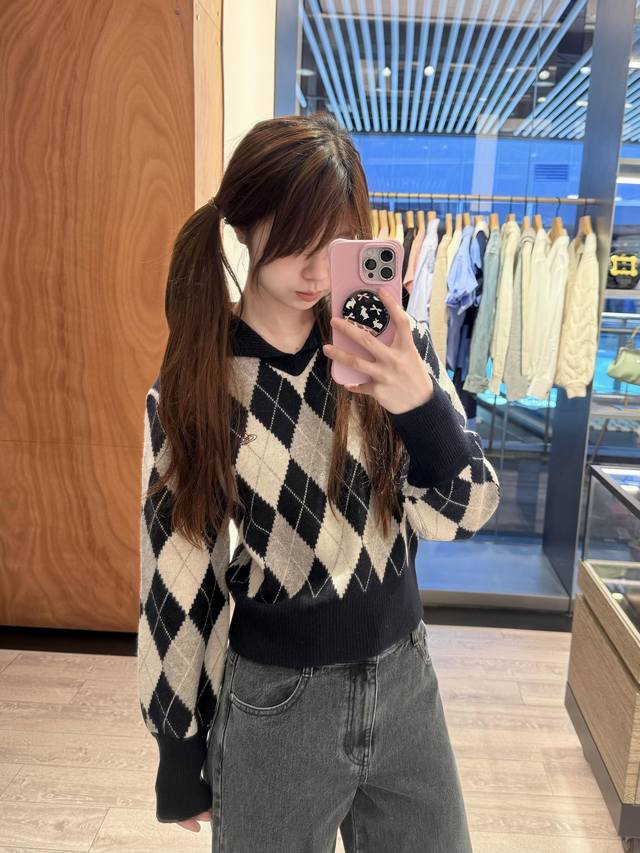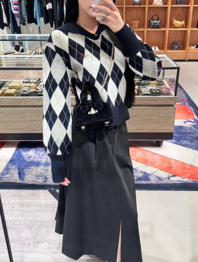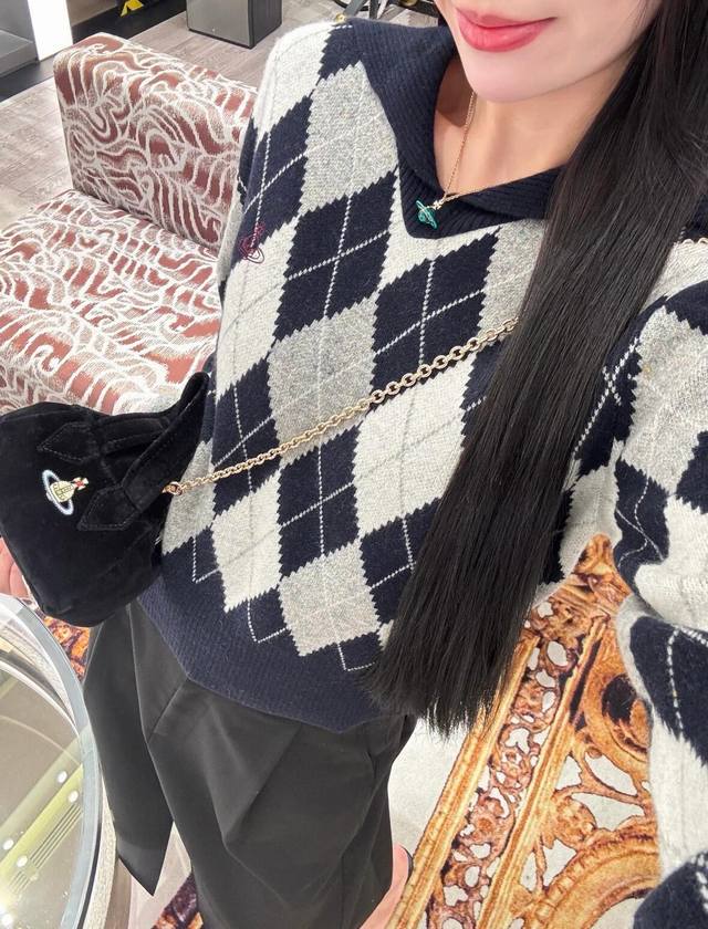 Vivien*E Westwood 25Fw Fall/Winter New Arrival: Saturn Embroidered Sailor Collar Diamond Pattern Knit Sweater | Exclusive High-Quality Version! Navy blue and light gray intertwine for a retro preppy feel, while the large lapel adds a playful touch. The classic diamond pattern is paired with the brand's signature small Saturn embroidery, full of detail. Pair it with a matching skirt and casual shoes for an effortlessly sweet and cool yet distinctive look. Available now in sizes S, M, L, D.D.