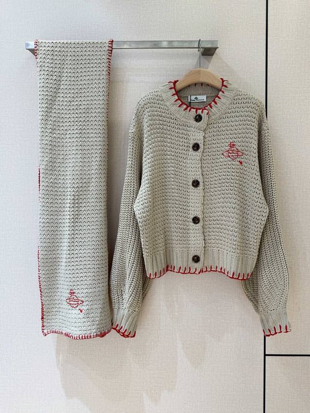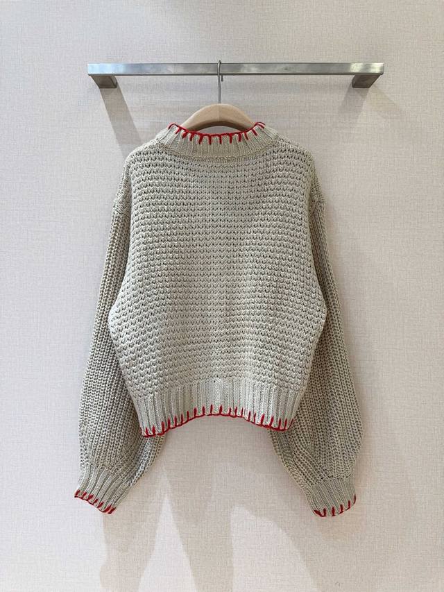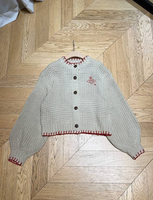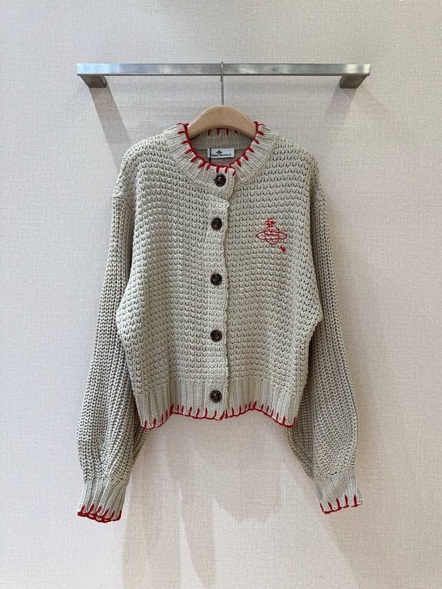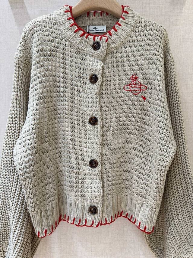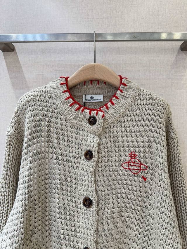 This thick-knit top features red accents along the edges and seams, along with a red embroidered pattern. It has a loose fit and is a cardigan-style.