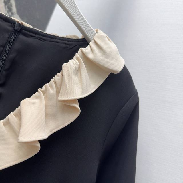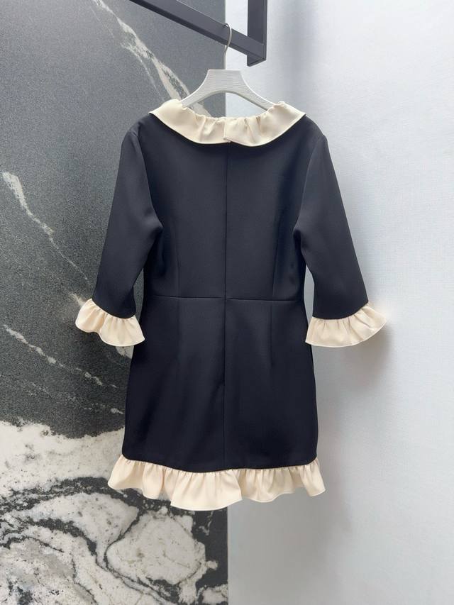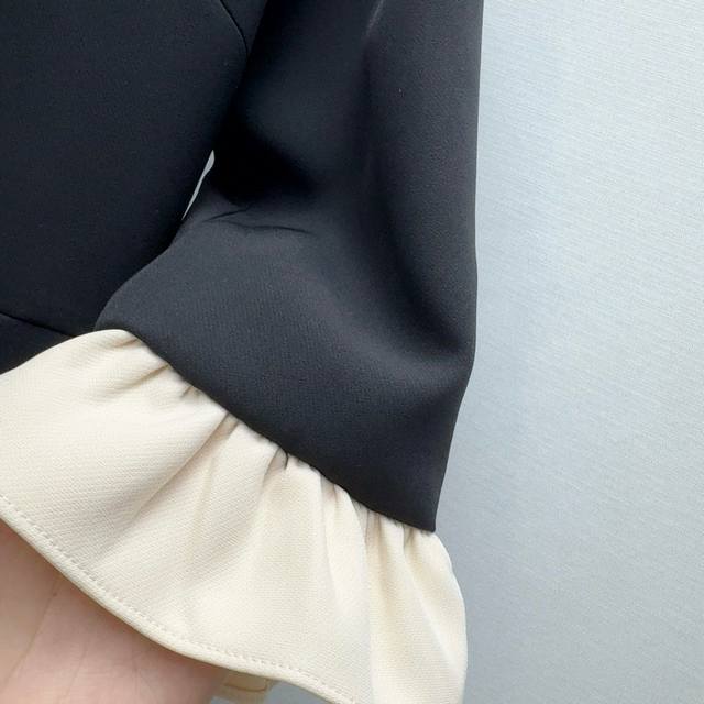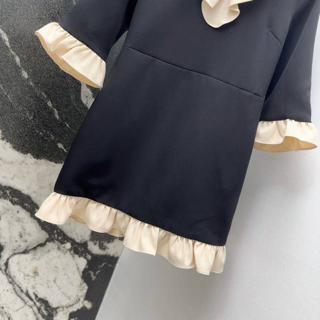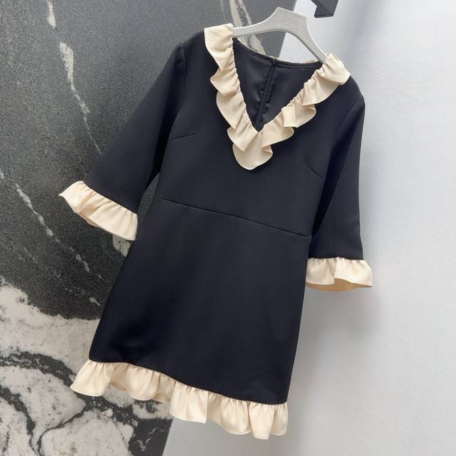 Vltn 25Ss Spring and summer new arrival celebrity style V-neck contrast color ruffle dress cuffs and skirt hem splicing ruffle lace design full of atmosphere simple and versatile and charming waist slimming three-dimensional tailoring version slim and tall elegant temperament girl style custom fabric texture super chaebol daughter must-have single item Sml S size: bust 84 skirt length 80