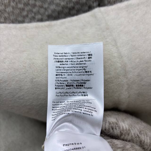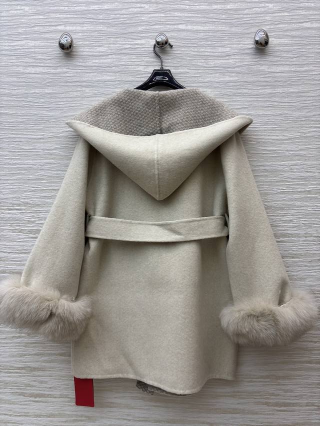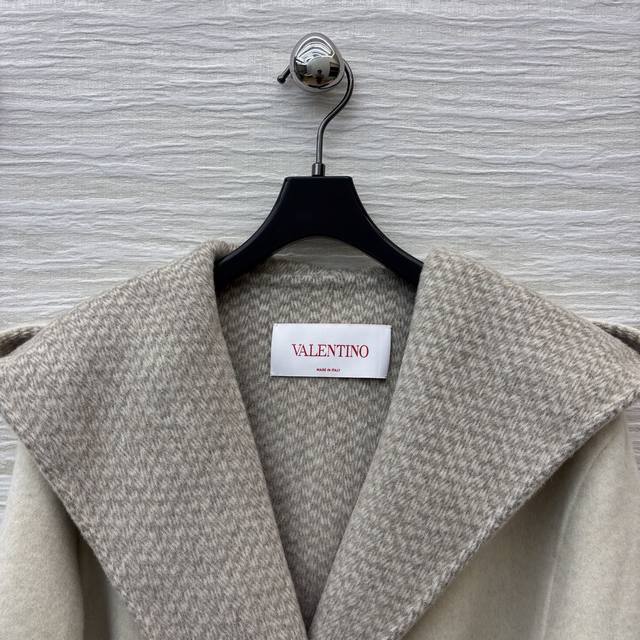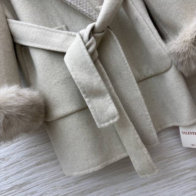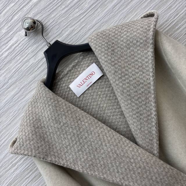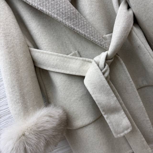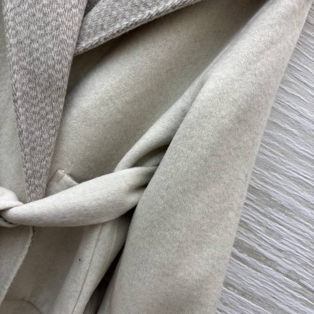 V-neck cashmere coat. The soft beige tone, paired with plush cuffs and a plaid lapel, and a belted waist, perfectly captures both luxury and warmth. Every detail showcases the brand's craftsmanship. One size fits all. Chest 116cm, Length 80cm.