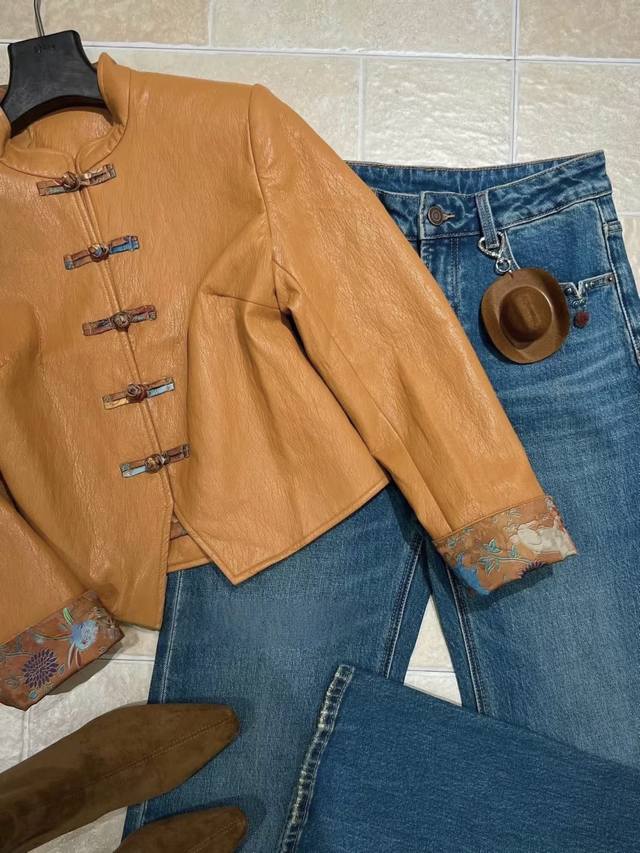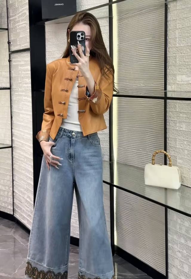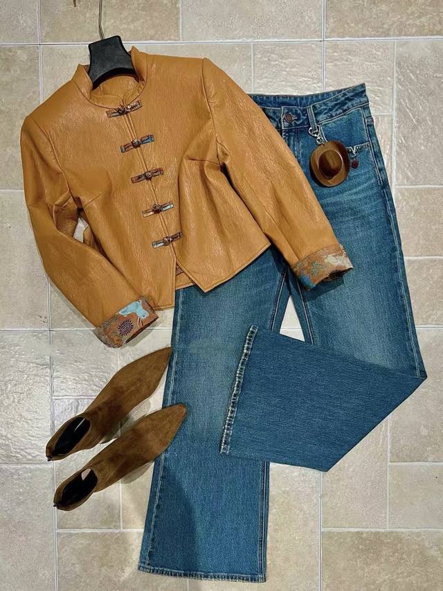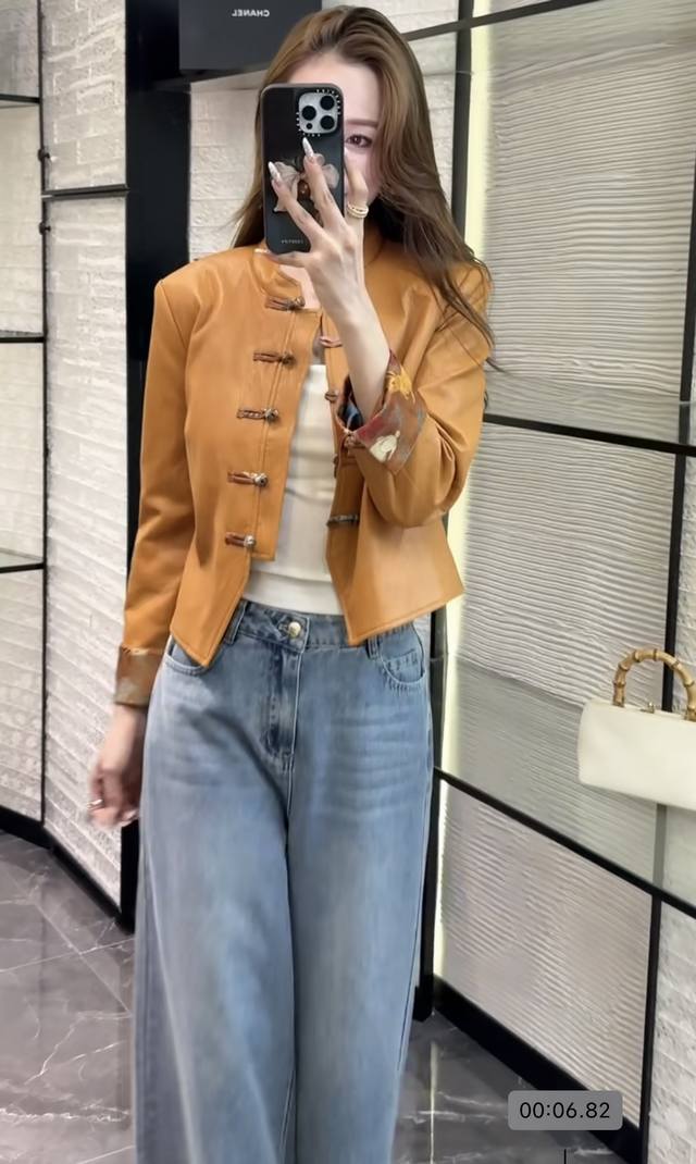 Xiangyun yarn + protein leather national trend style buttoned slimming top