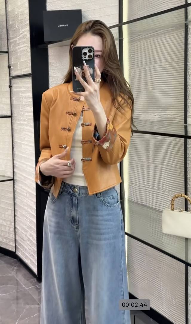 Xiangyun yarn + protein leather national trend style buttoned slimming top Colo