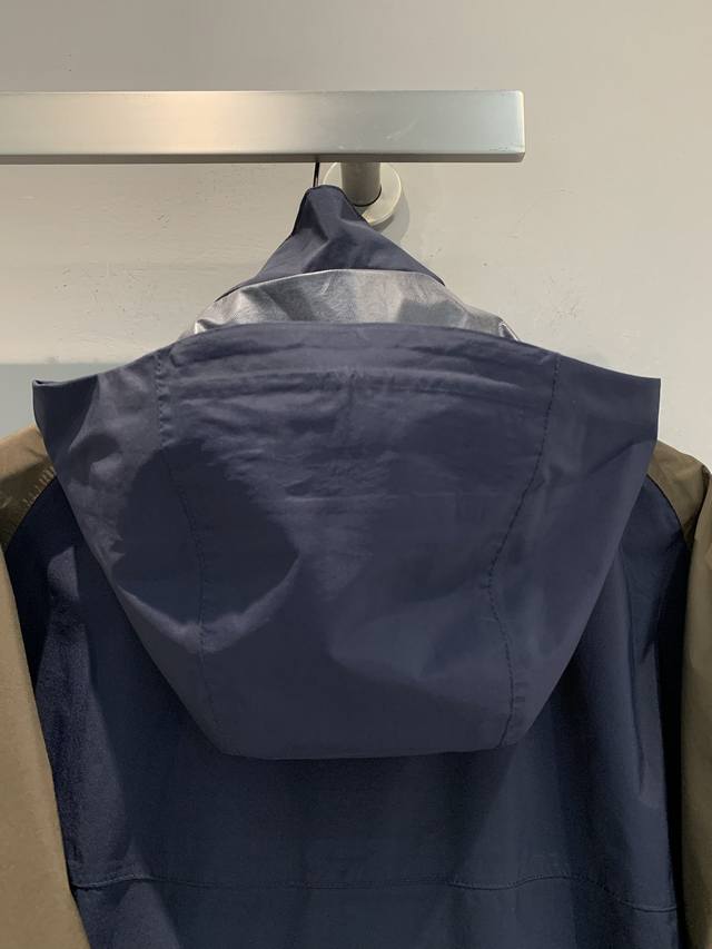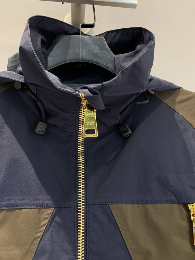 Y version development prad* 2025 early fall new retro and stylish contrasting hooded jacket. Made of high-quality fabric, it's both windproof and waterproof. The bold and harmonious blue-brown contrast design breaks the monotony and showcases a unique style. The hood and zipper details add a practical and sleek look, making it a stylish addition for both city commuting and outdoor exploration. Sizes S, M, D, D