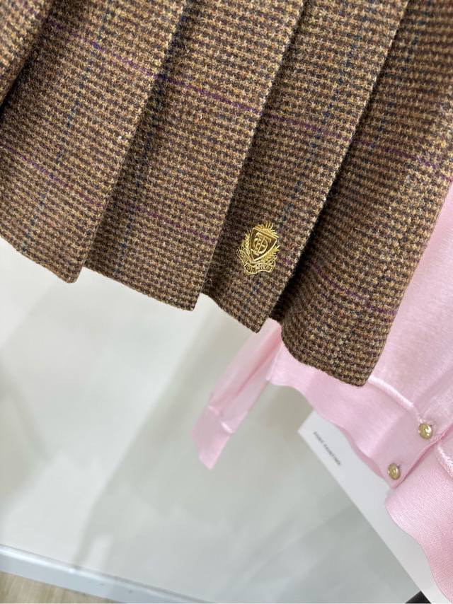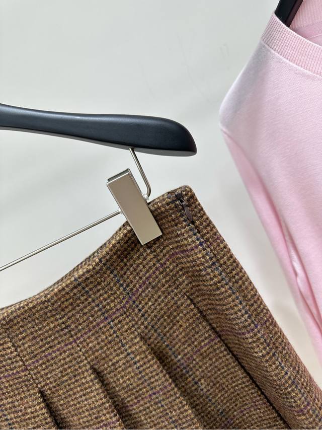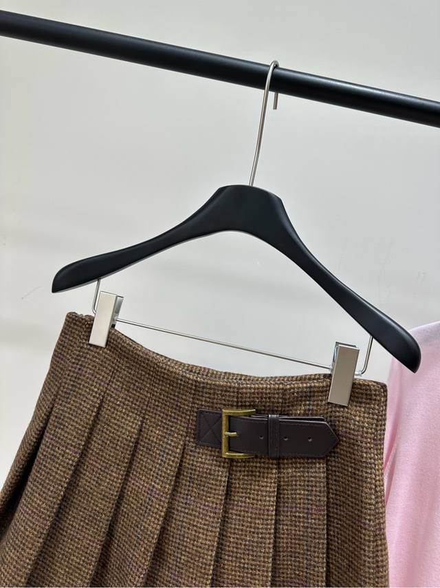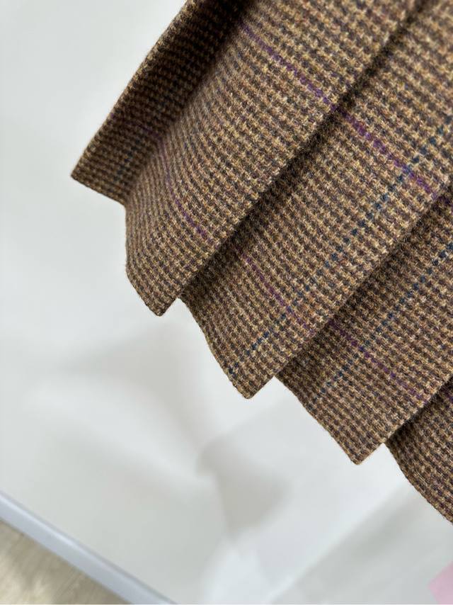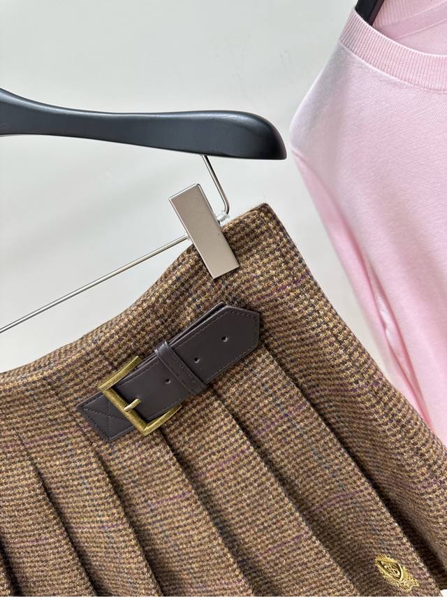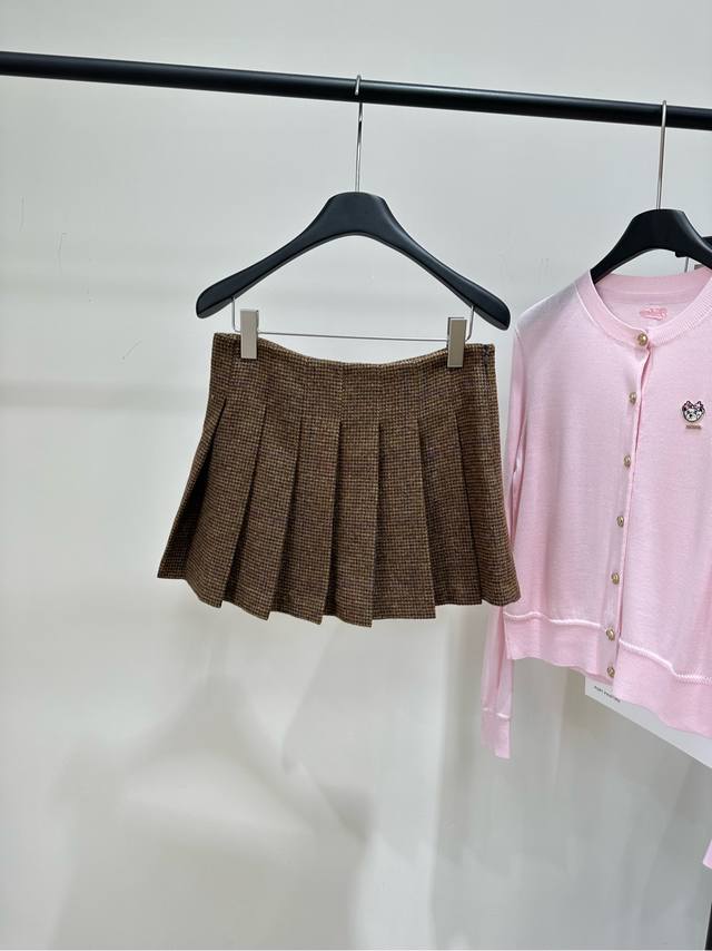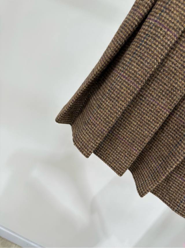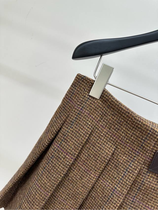 Zhao Lusi Brown Plaid Pleated Mini Skirt with Leather Buttons DDD, Fabric: Wool Tweed DDD Color: Brown Plaid DDD Zhao Lusi's Same Style Brown Plaid Pleated Skirt DDD Preppy Design DDD Soft and Warm Wool Material, Perfect for Autumn and Winter DDD High-Waisted Pleated Skirt, Makes Legs Longer and Improves Body Proportions DDD Retro Belt Adds a Touch of Vintage Style DDD Plaid Embroidery Details on the Skirt, Exquisite and Timeless DDD Easily Suitable for Daily Commute, Campus Wear, or Holiday Atmosphere DDD Pair with a Knit Cardigan or Jacket DDD Switch Between Gentle Sweetness and Retro Preppy Style at Will DDD Flat Size: DDD S: Waist 68cm, Hips 100cm, Skirt Length 34cm DDD M: Waist 72cm, Hips 104cm, Skirt Length 35cm DDD L: Waist 76cm, Hips 108cm, Skirt Length 36cm DDD Manual Measurements May Have a 2-3cm Error, Which is Within the Normal Range DDD
