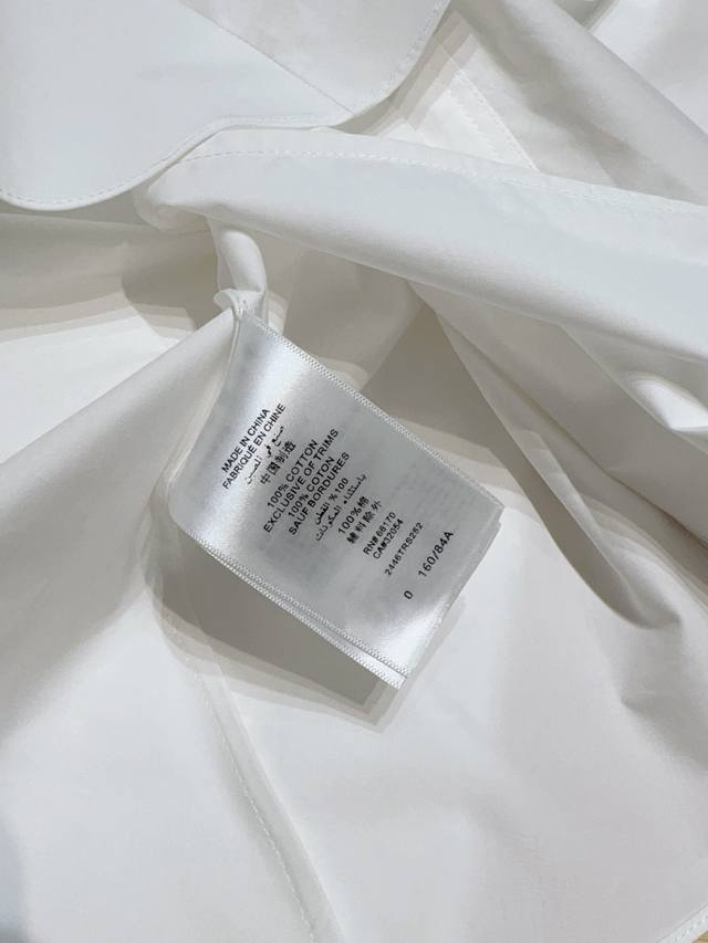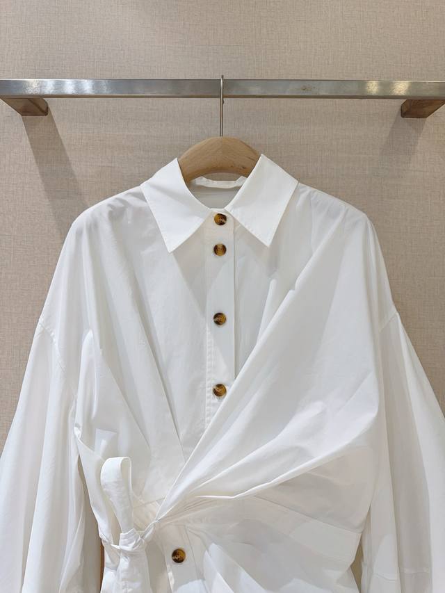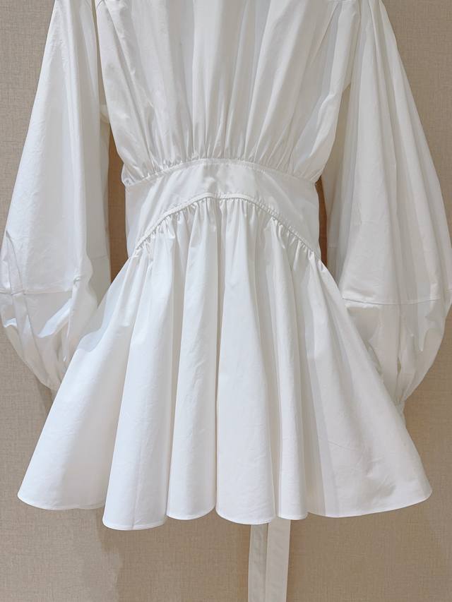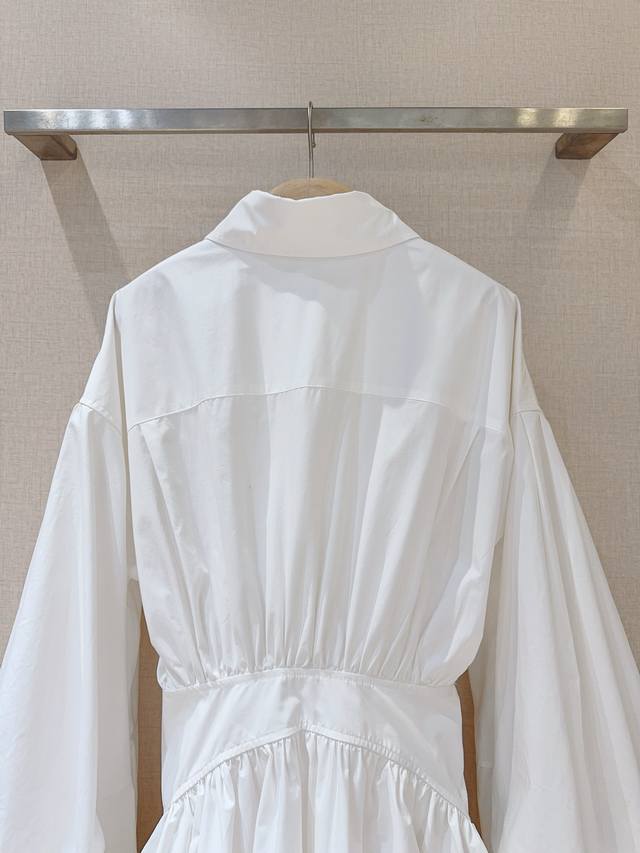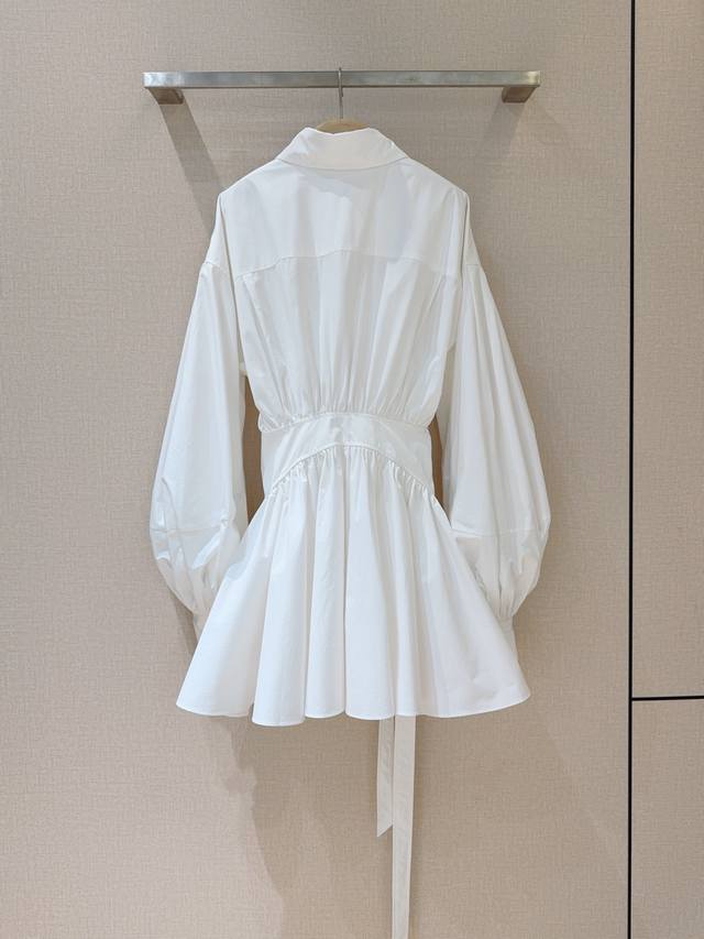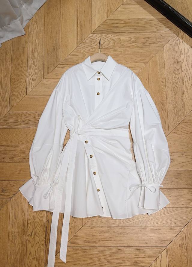 . This dress features a turn-down collar design, is made of cotton fabric, and boasts lantern sleeves with elongated, fitted, tie-up cuffs. The cinched waist accentuates a beautiful figure. Button embellishments adorn the front and hem. The overall design is elegant and timeless. Sizes: S, M, XL.